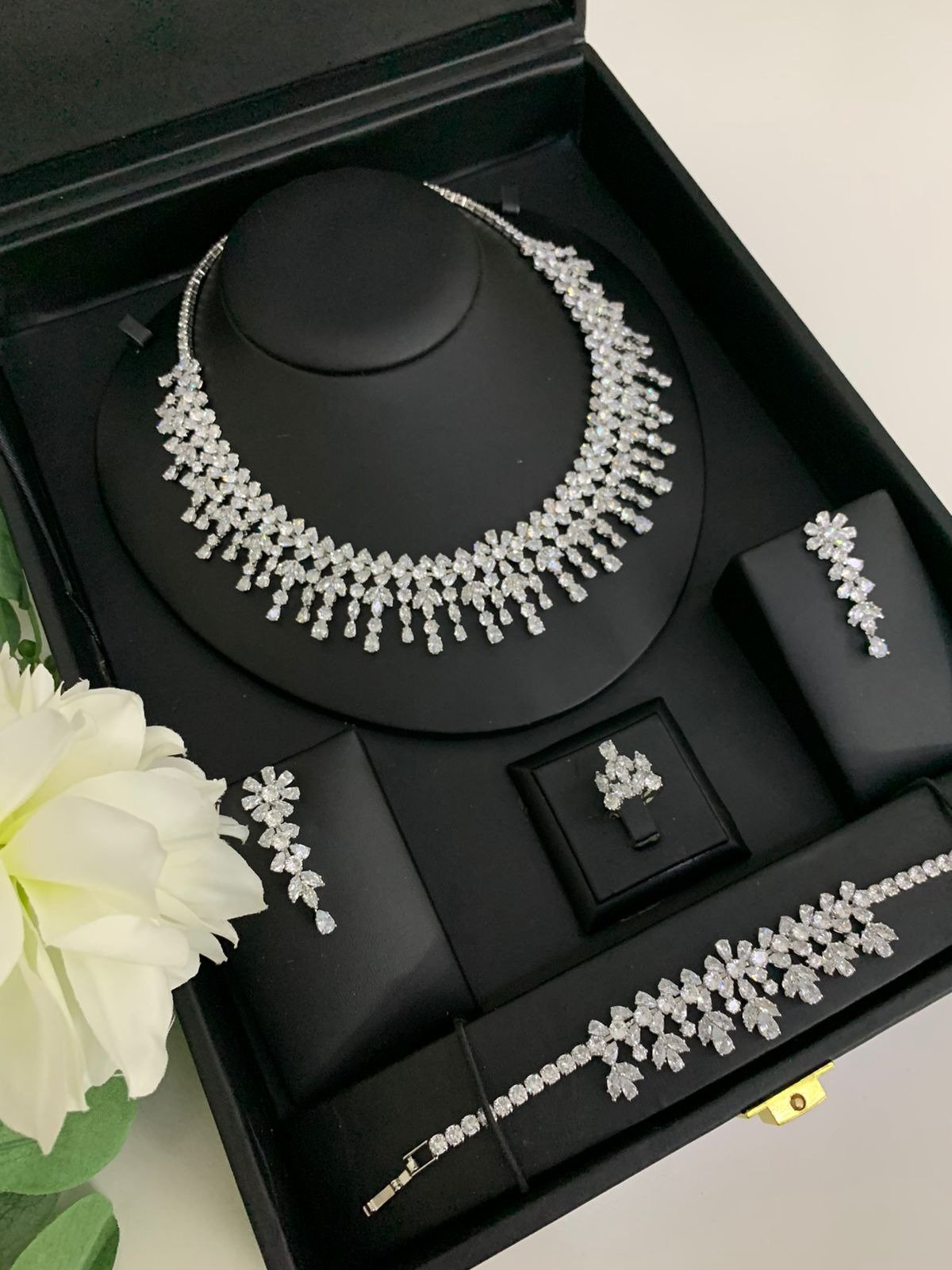• يحتوي الطقم على (قلادة - اقراط اذن (حلق ) - خاتم - اسورة يد)