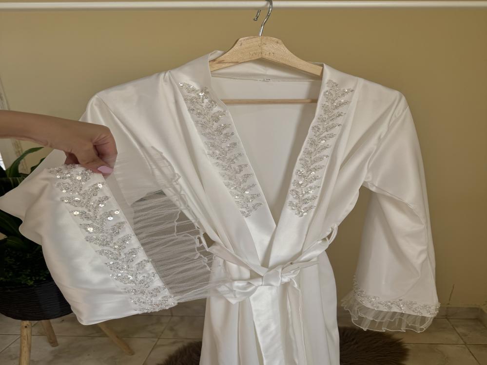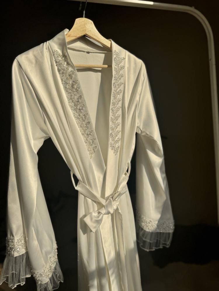 روب فاخر للعرايس مزين من الاكتاف بتطريز ورد جميل و ريش من الاكمام حرير ناعم مطرز بالإسم