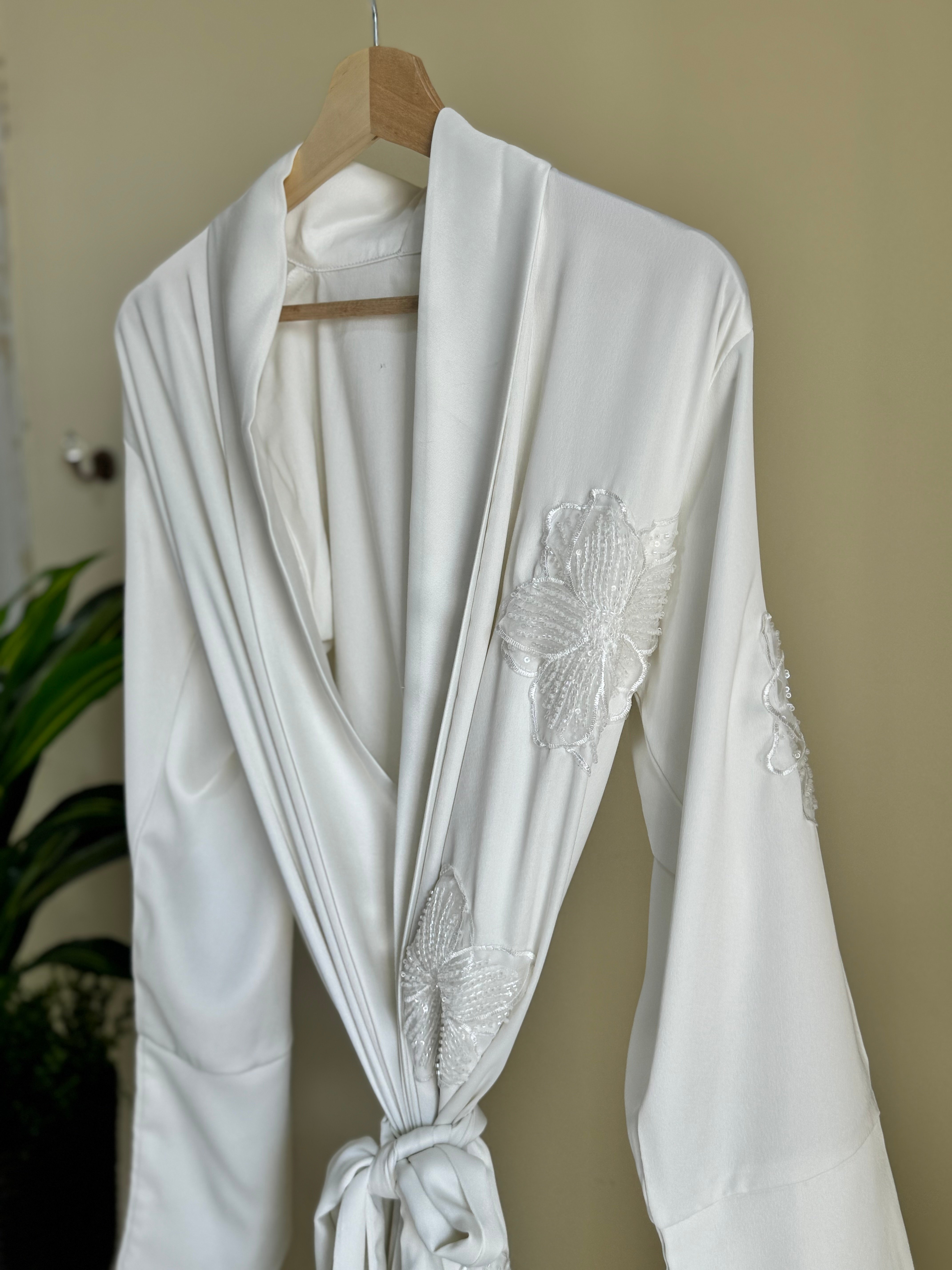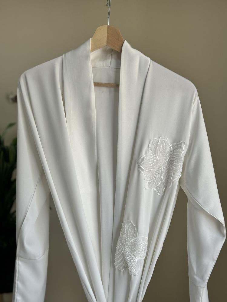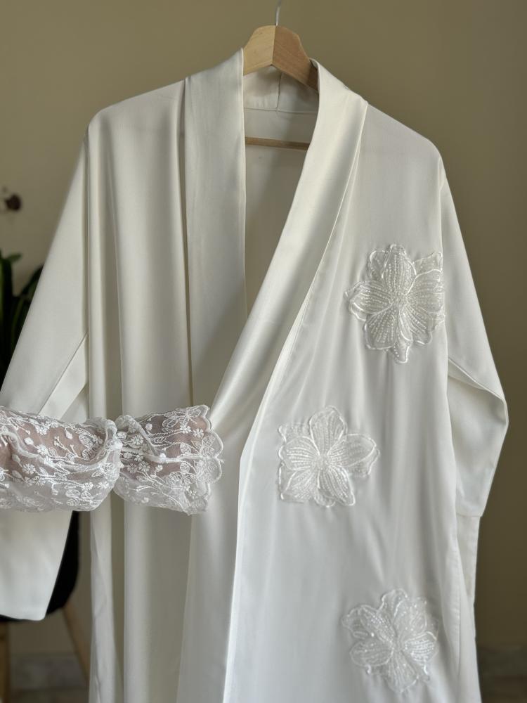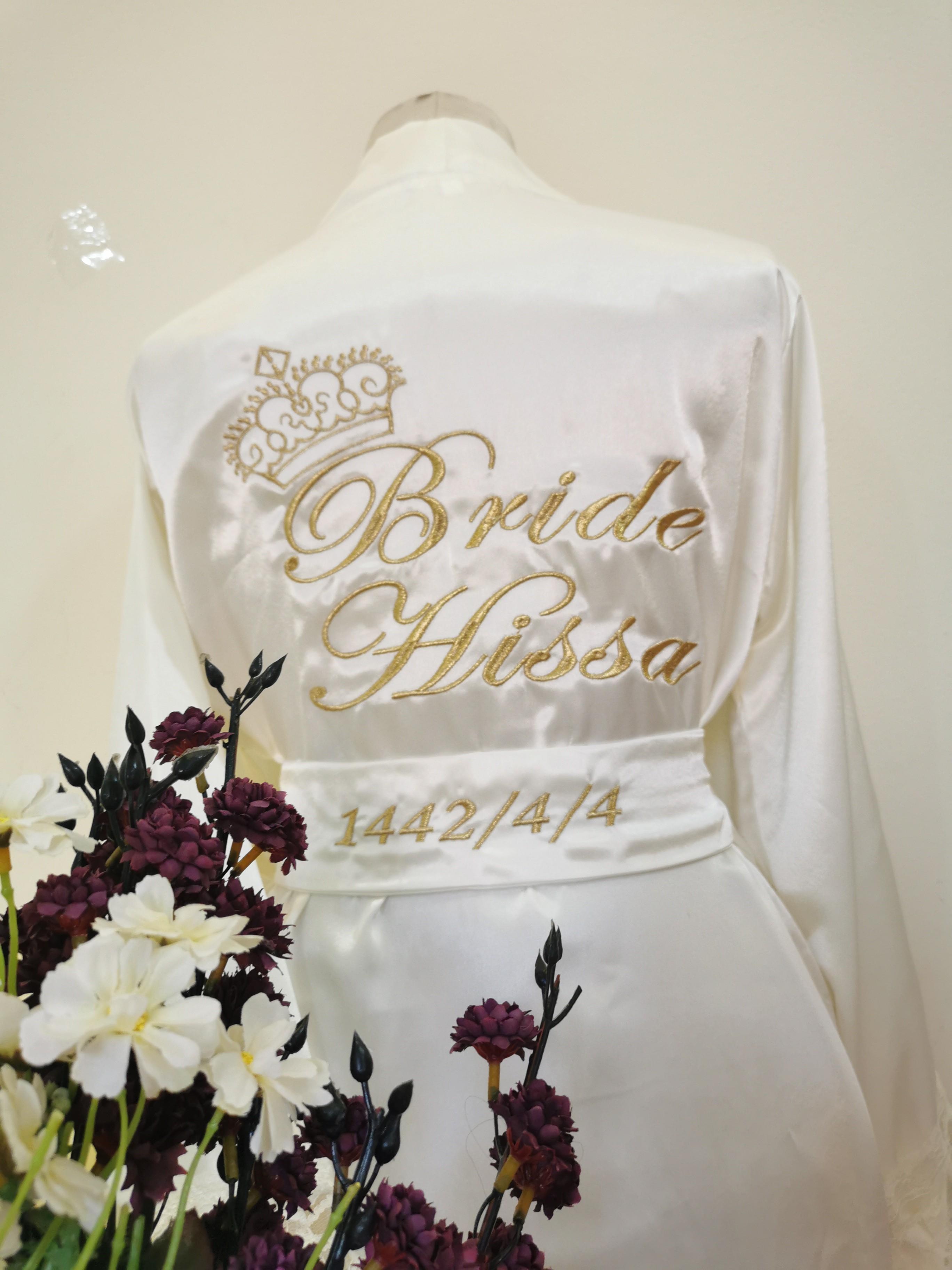 روب فاخر للعرايس مزين من الاكتاف بتطريز ورد جميل و ريش من الاكمام حرير ناعم مطرز بالإسم