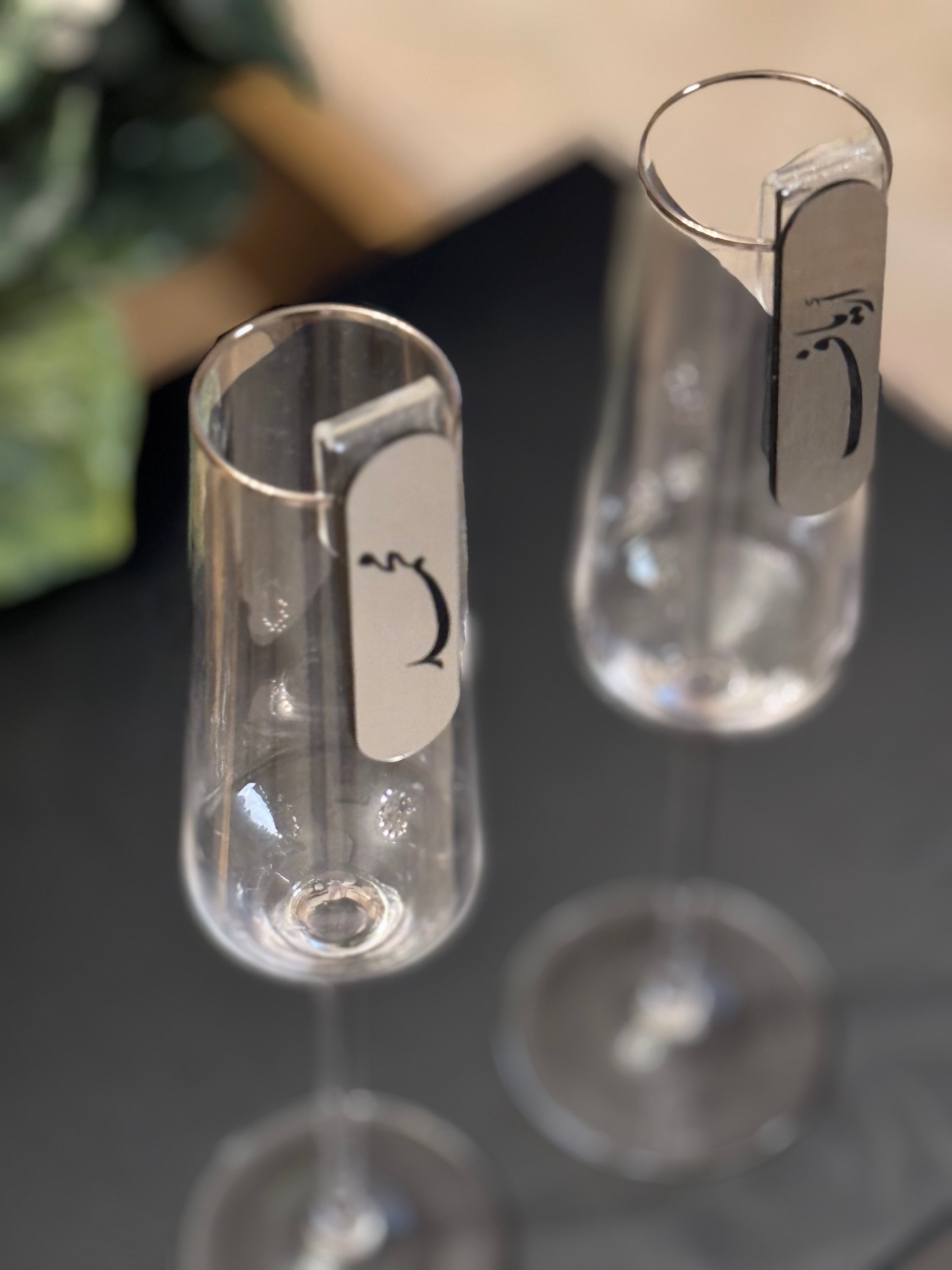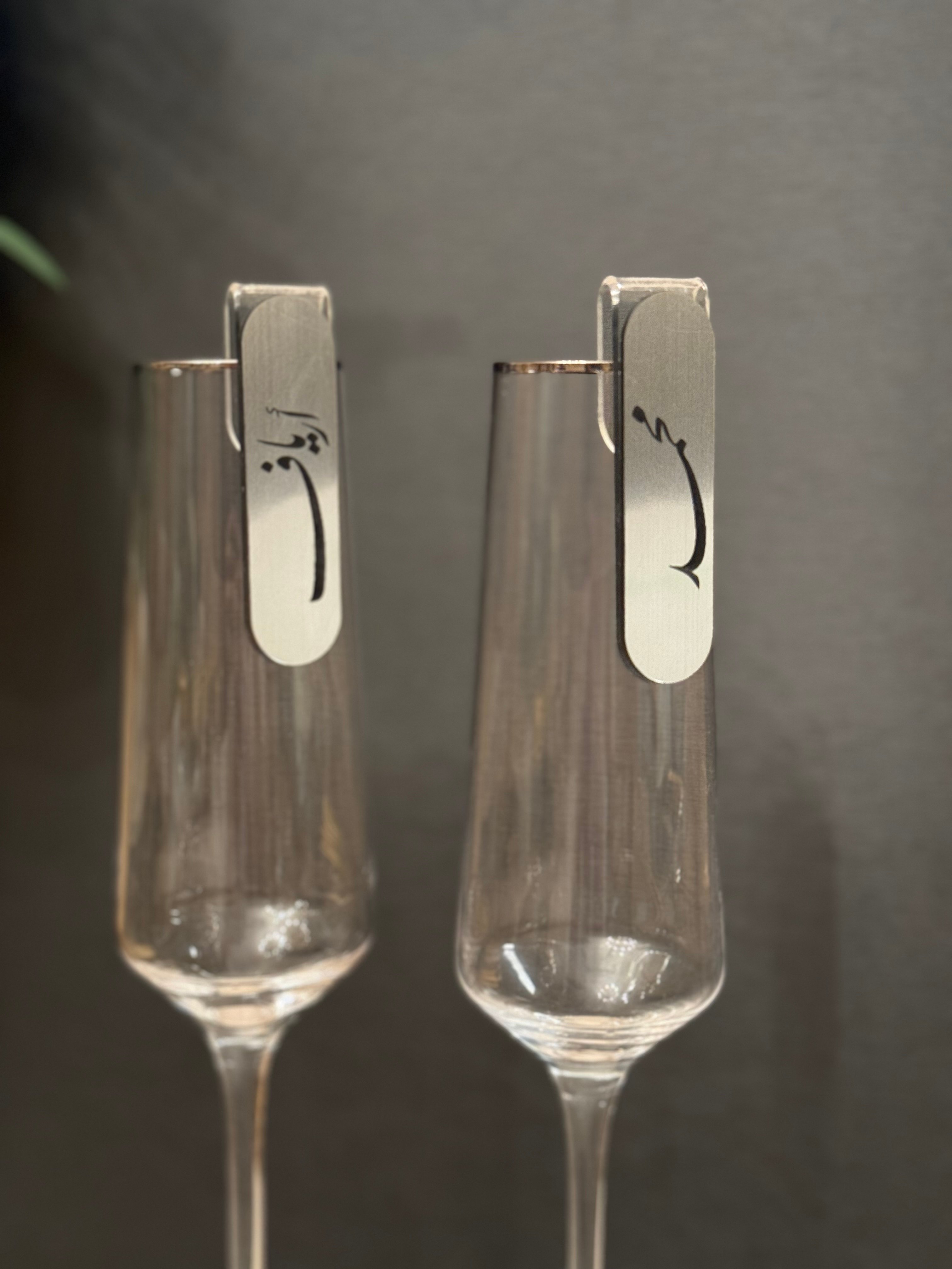 تعليقة بأسماء العرسان تعلق على الكاسات و توضع امام العرسان لالتقاط اجمل اللحظات و تخليد ذكرى تدوم للأبد .