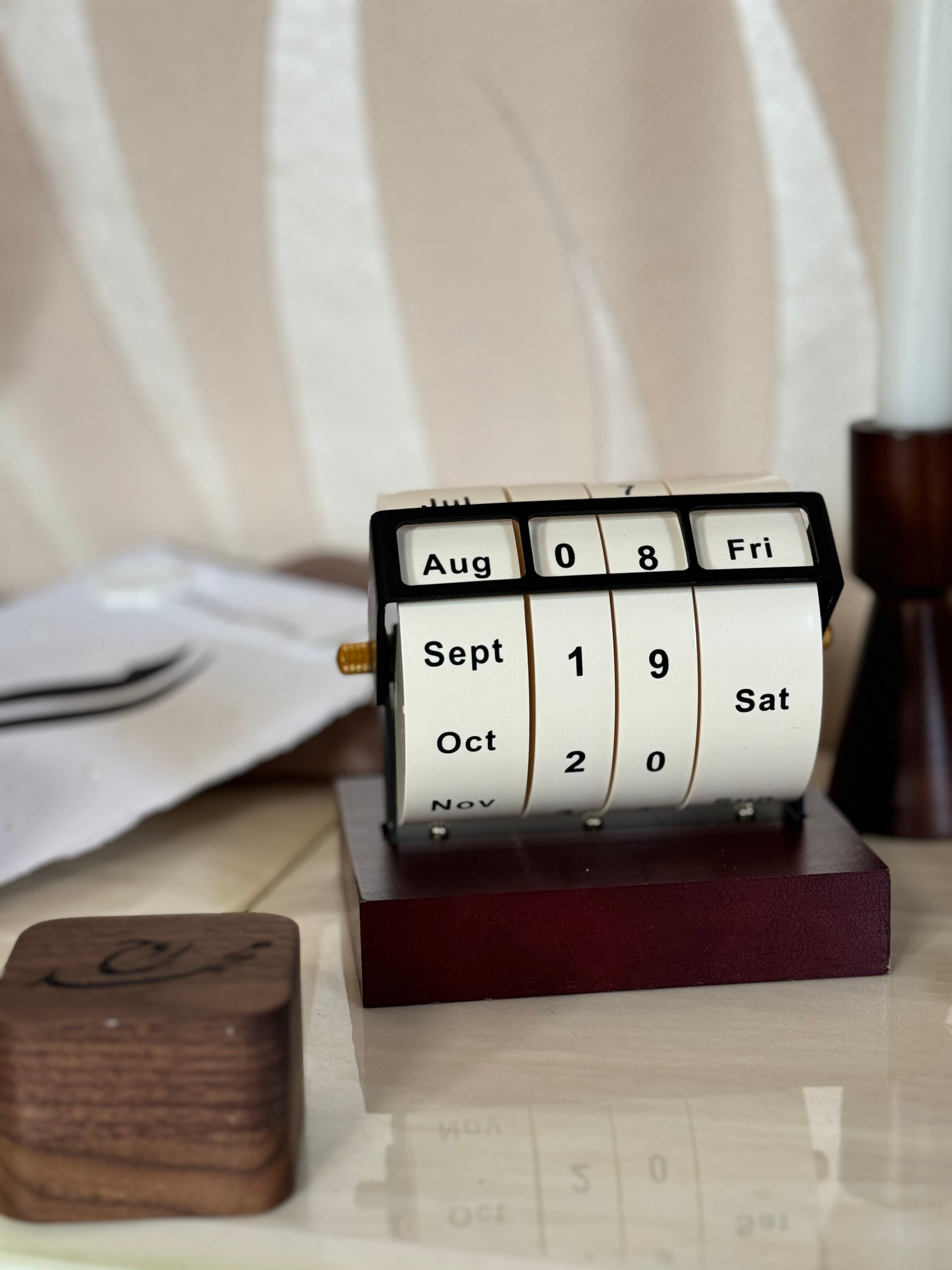 بلمسة أنيقة وفخمة، نقدّم لكم تقويم الزواج الخشبي بتصميم كلاسيكي فاخر، تقدرون تثبتون فيه يوم زواجكم للأبد