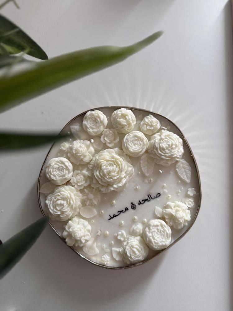 أضيئي لحظتك المميزة مع شمعة تحمل أسماء العروسين بتصميم أنيق وفاخر.