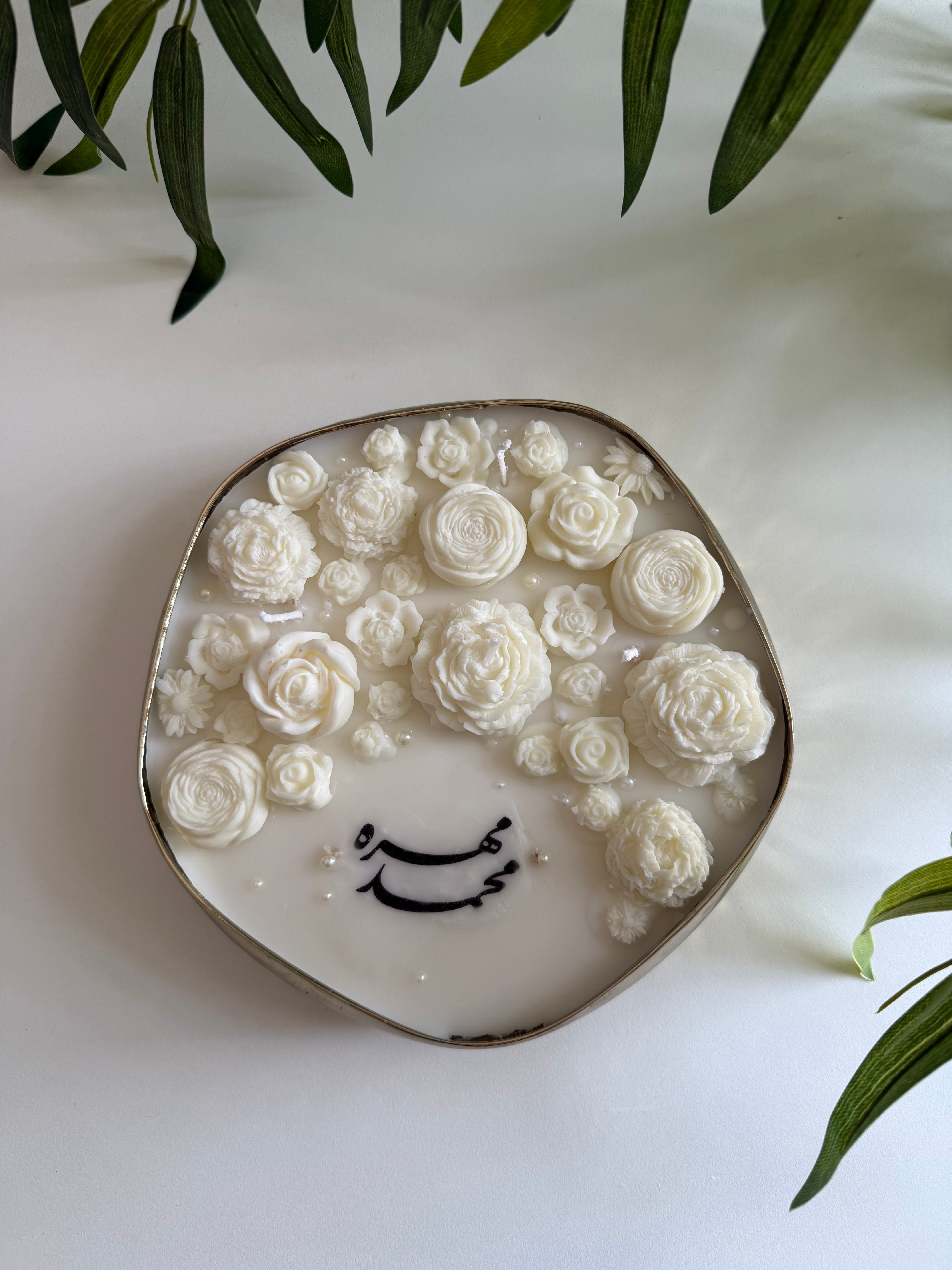 أضيئي لحظتك المميزة مع شمعة تحمل أسماء العروسين بتصميم أنيق وفاخر.