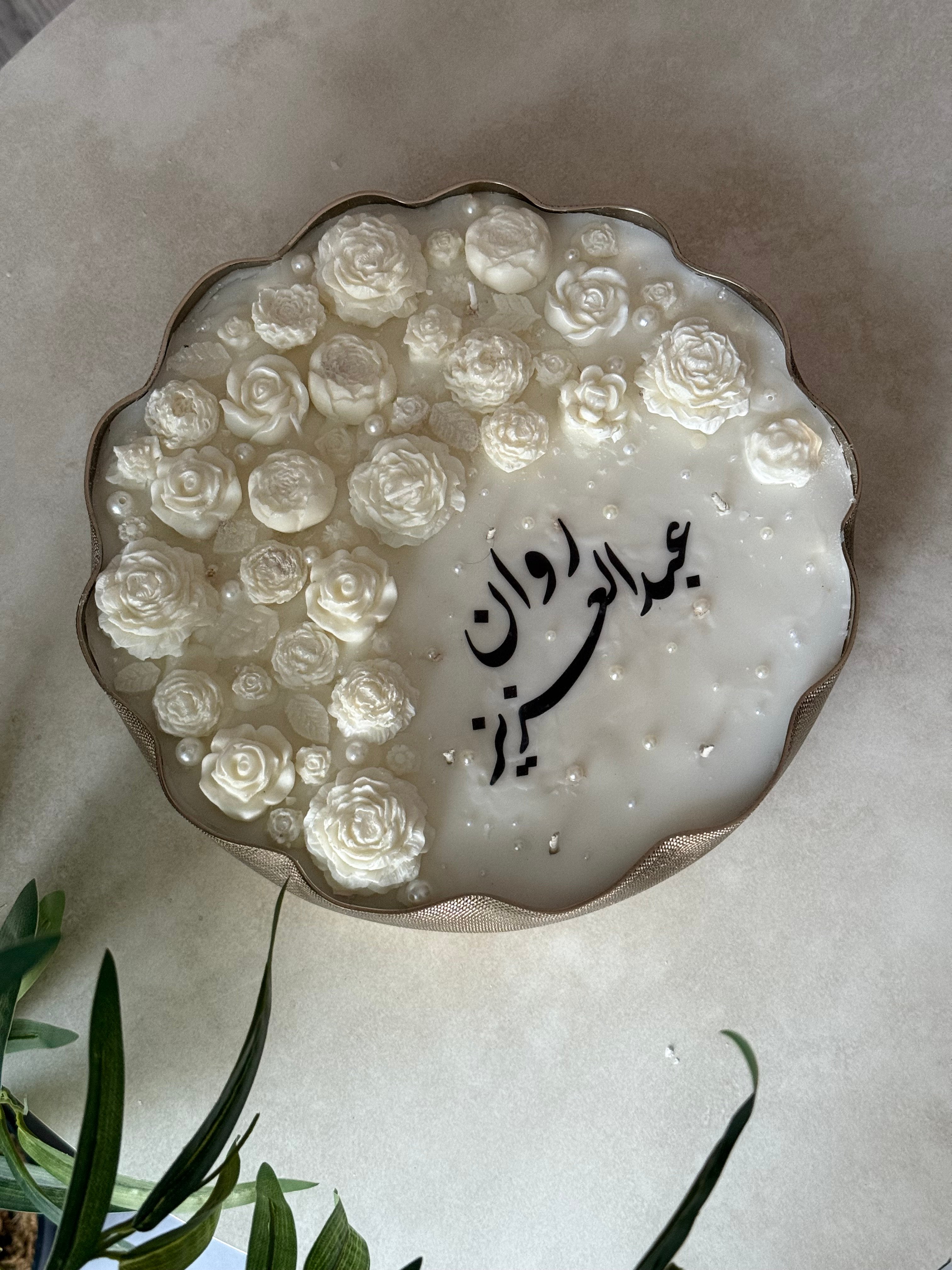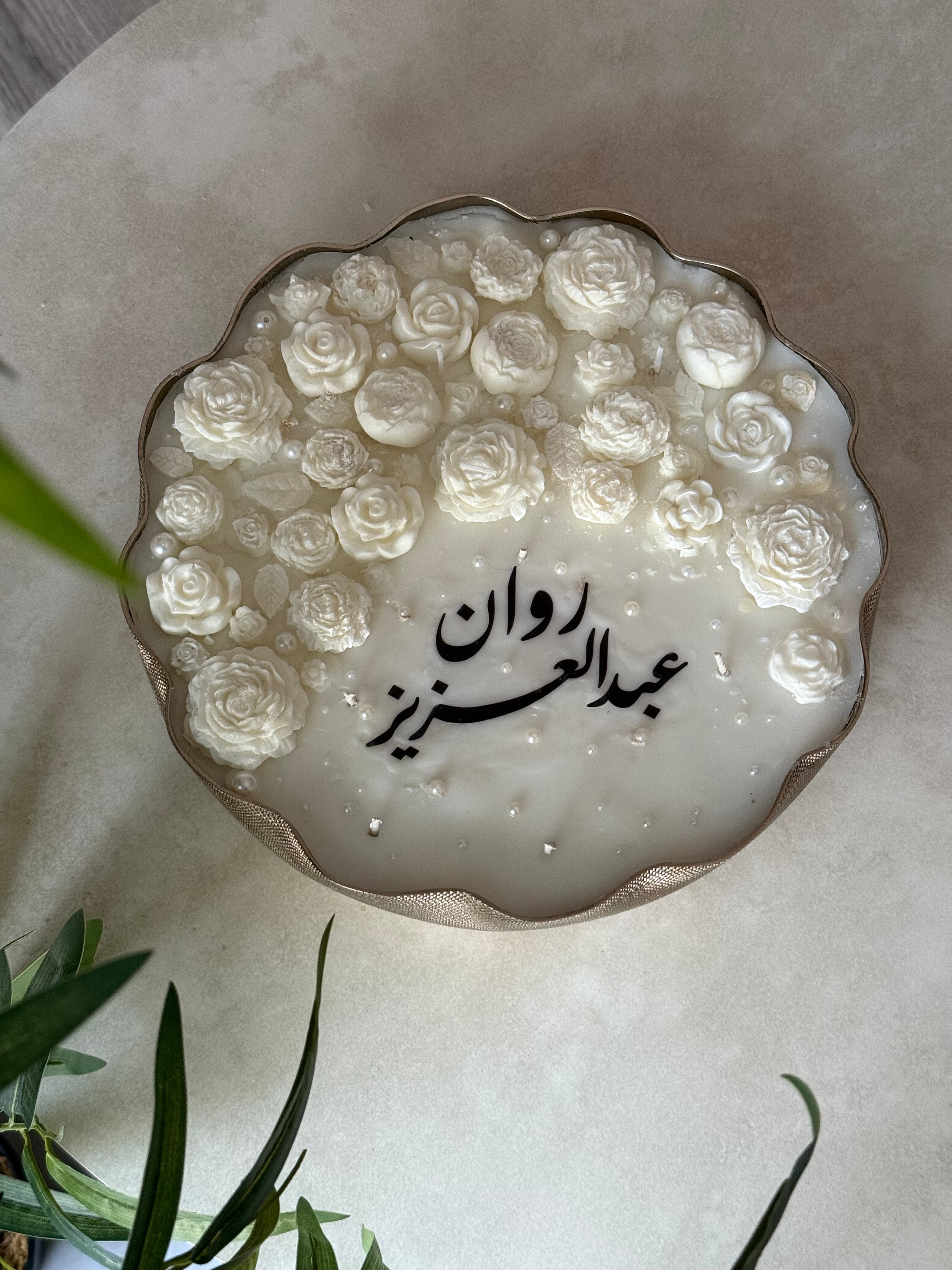 أضيئي لحظتك المميزة مع شمعة تحمل أسماء العروسين بتصميم أنيق وفاخر.