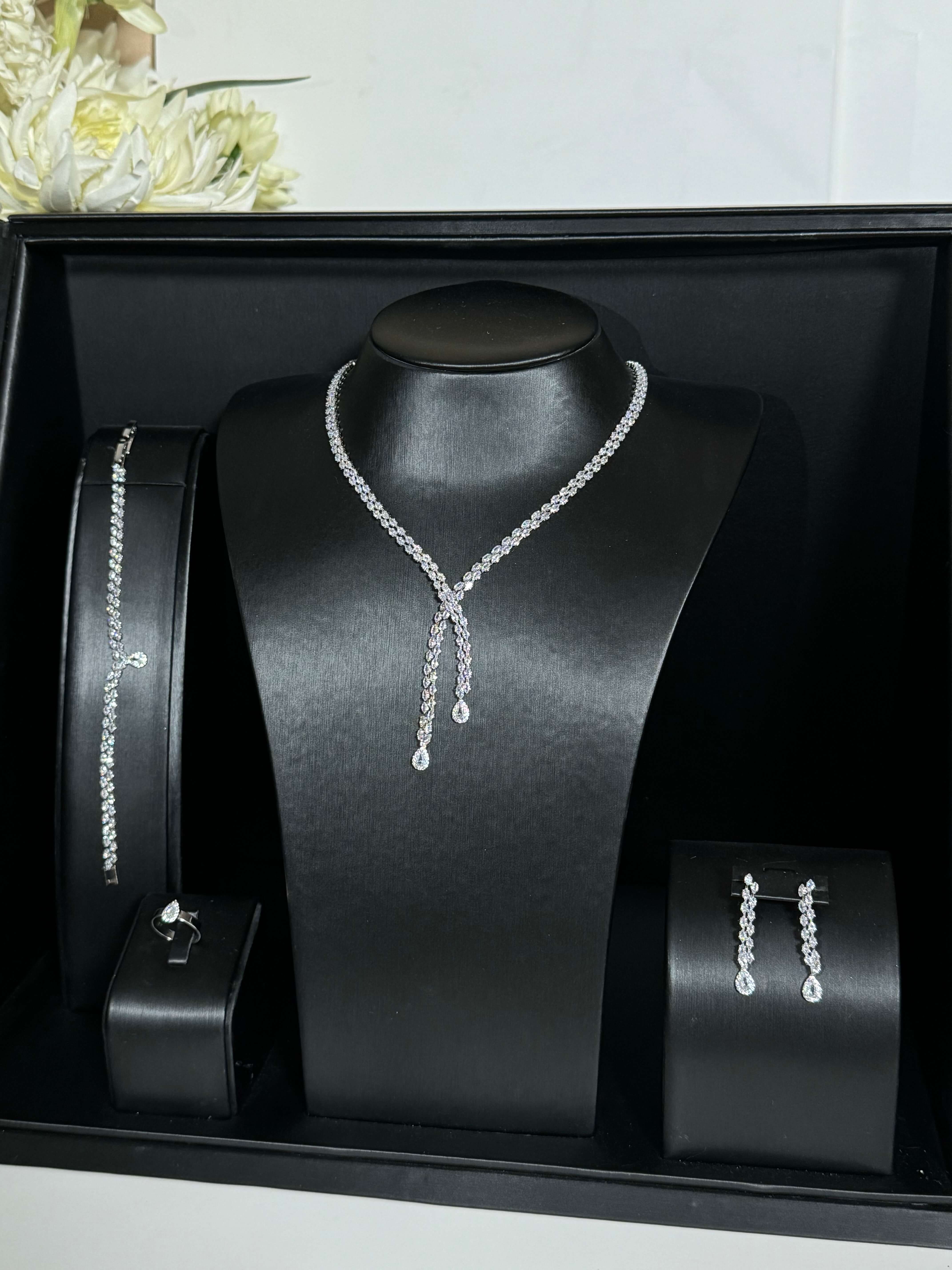 - يحتوي الطقم على (عقد - اقراط اذن (حلق ) - خاتم - اسورة يد)