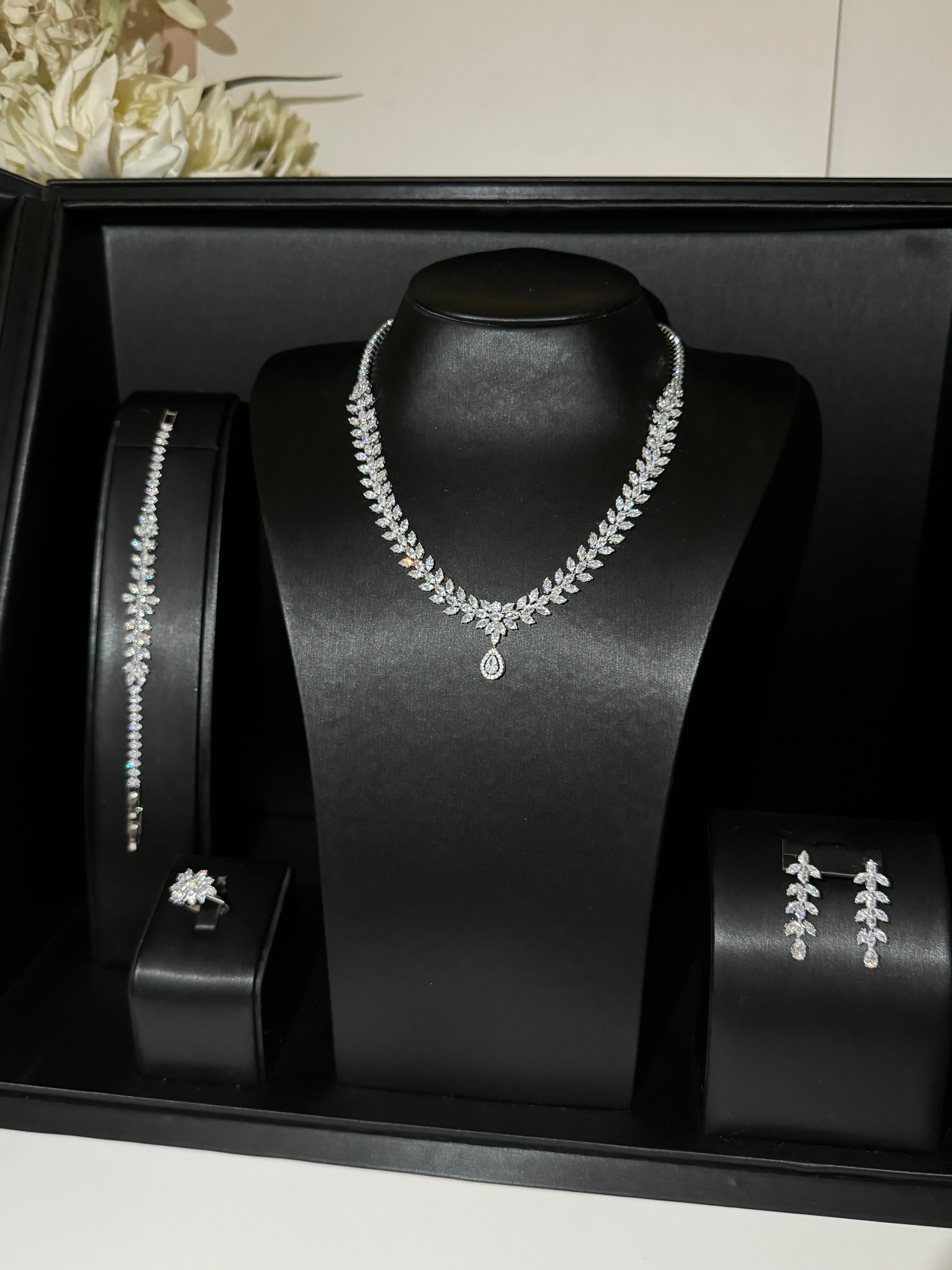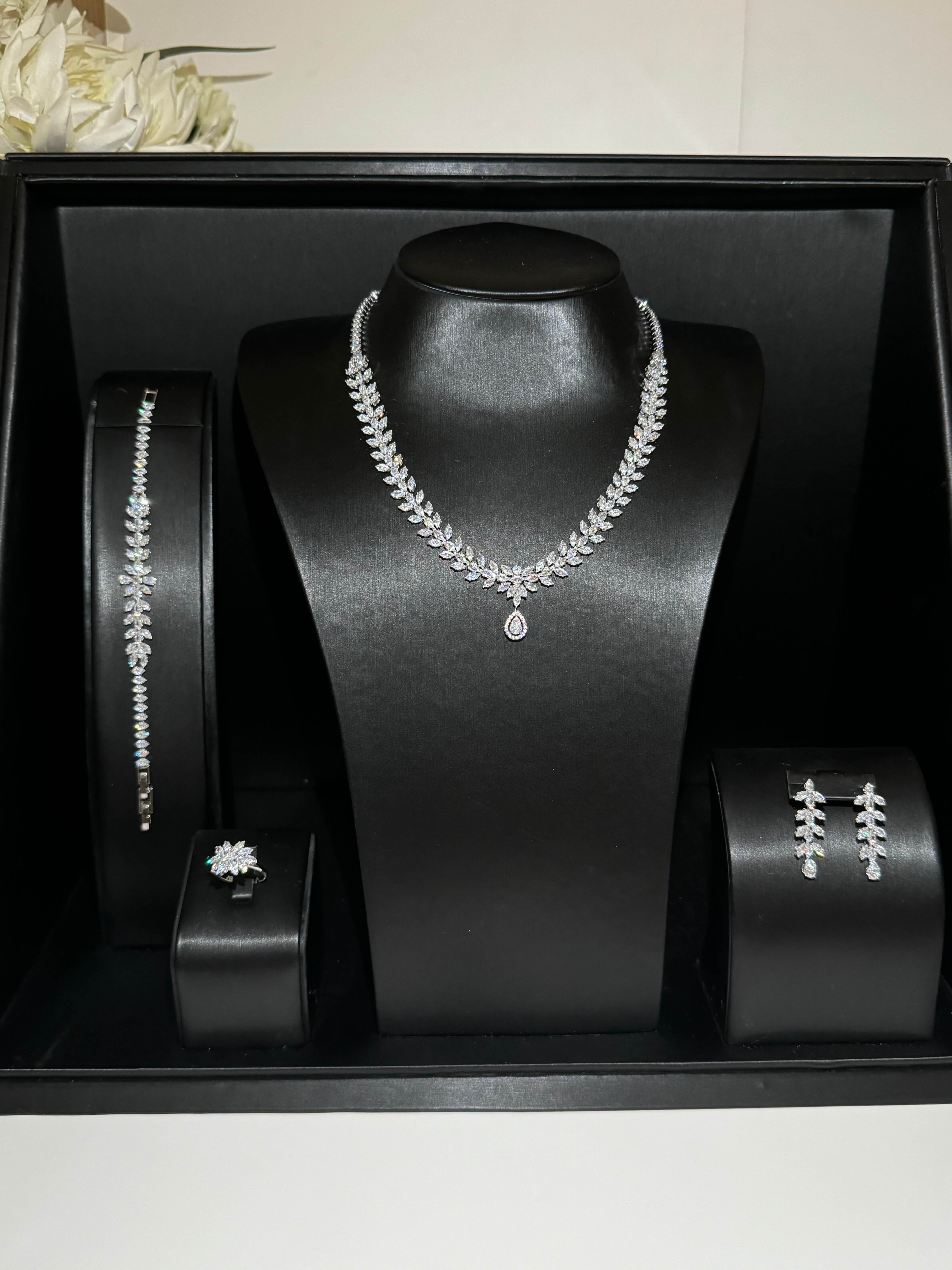 - يحتوي الطقم على (عقد - اقراط اذن (حلق ) - خاتم - اسورة يد)