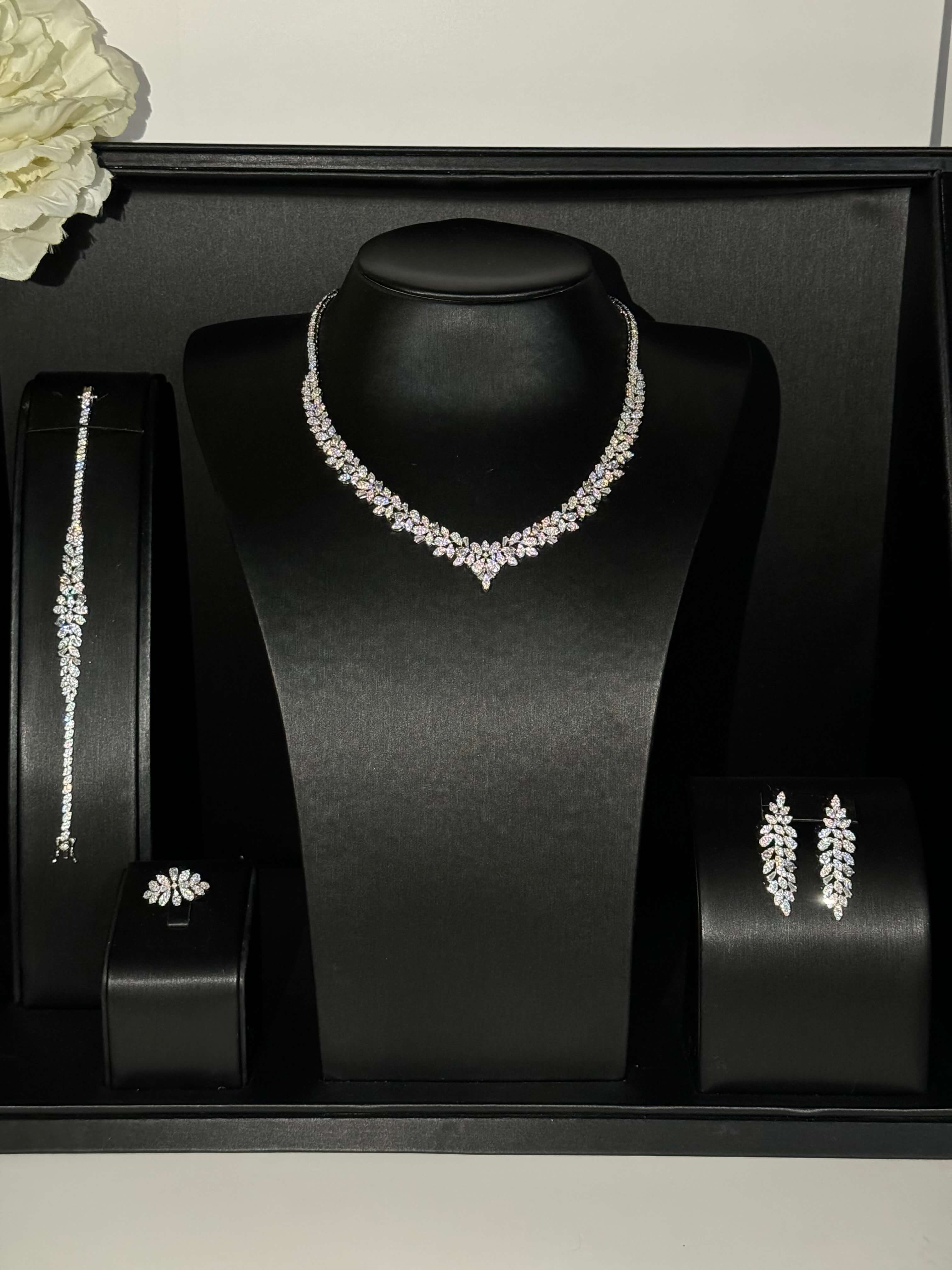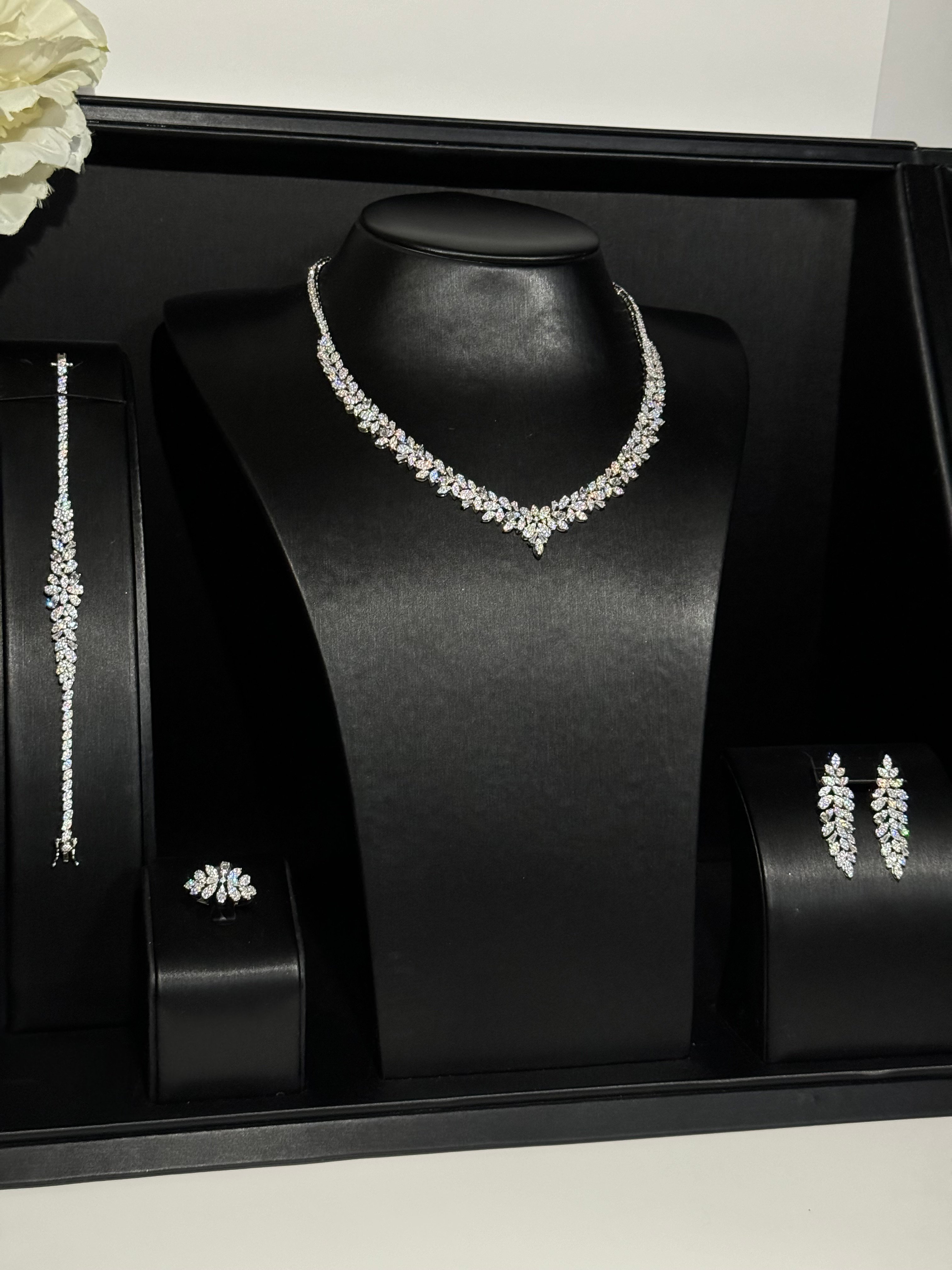 • يحتوي الطقم على (عقد - اقراط اذن (حلق ) - خاتم - اسورة يد)