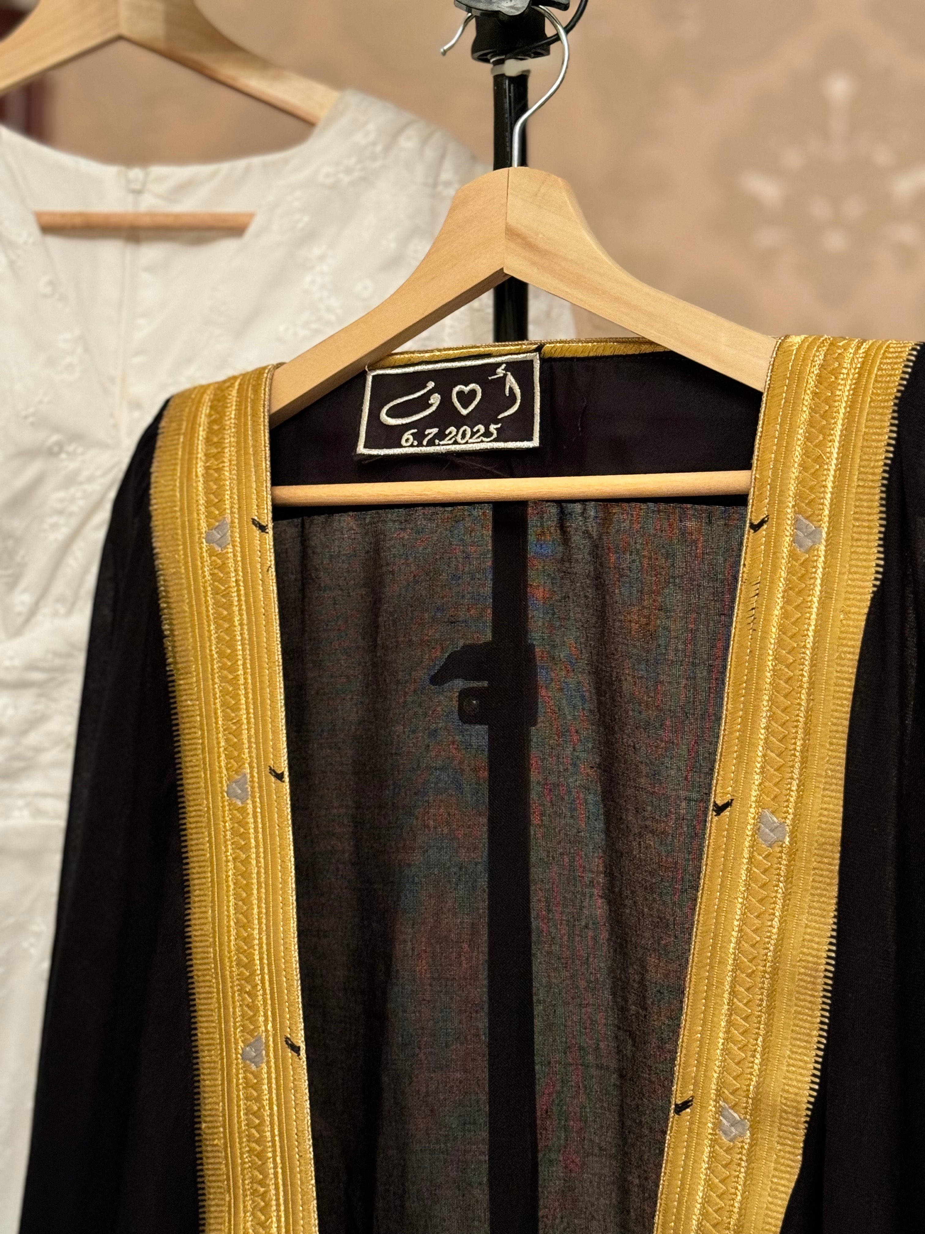 تميّز في يومك الكبير بتفصيلة أنيقة تحمل اسمك واسم عروسك مطرّزين بخيوط فاخرة على تاق البشت.