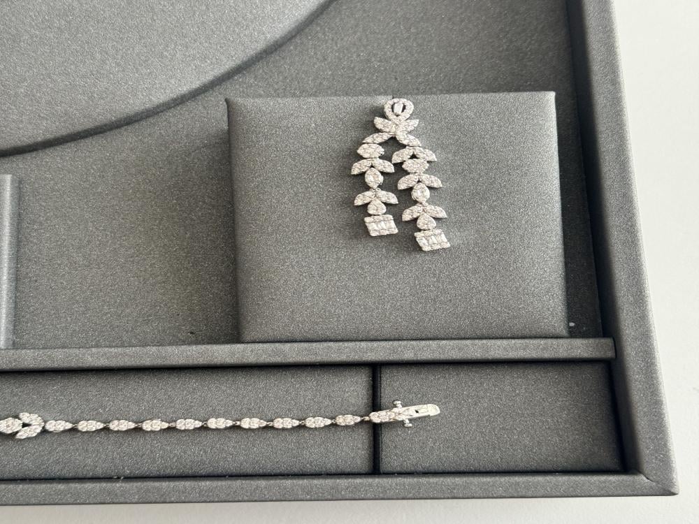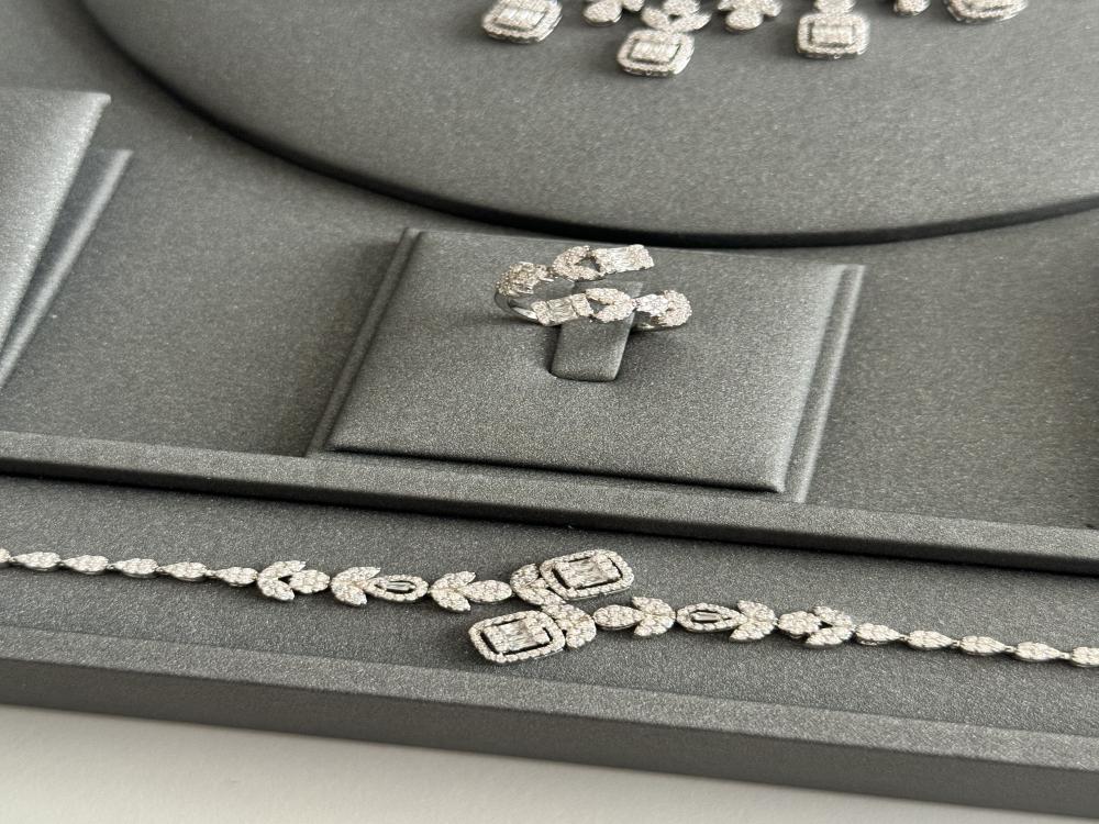 • مرصّع بـ زركون عالي الجودة يتميز بالنقاء والشفافية ولمعة قريبة من الألماس.