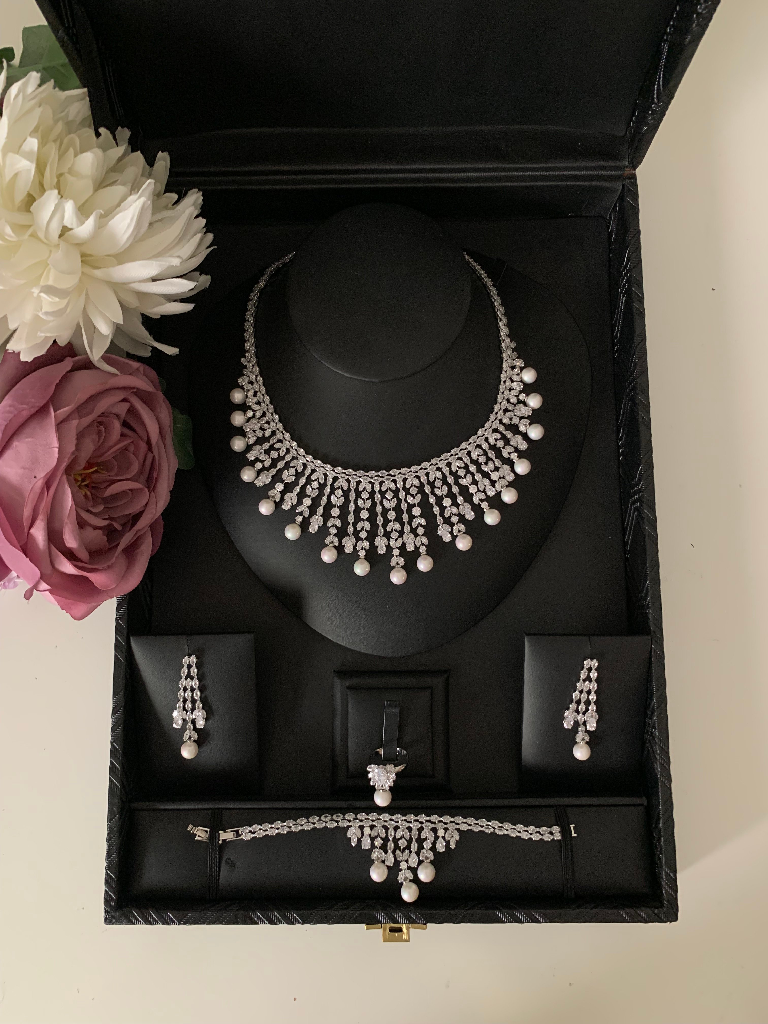 • يحتوي الطقم على (قلادة - اقراط اذن (حلق ) - خاتم - اسورة يد)