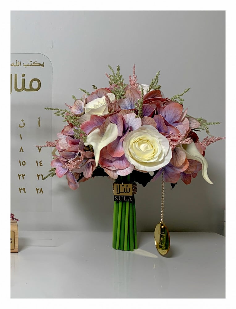 مسكة ناعمة انثوية بورد الجوري مع ازهار الكالا شبه الطبيعي والهايدرنجا المموج مع اغصان اللافندر