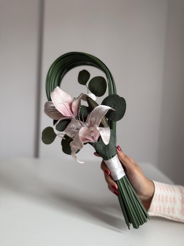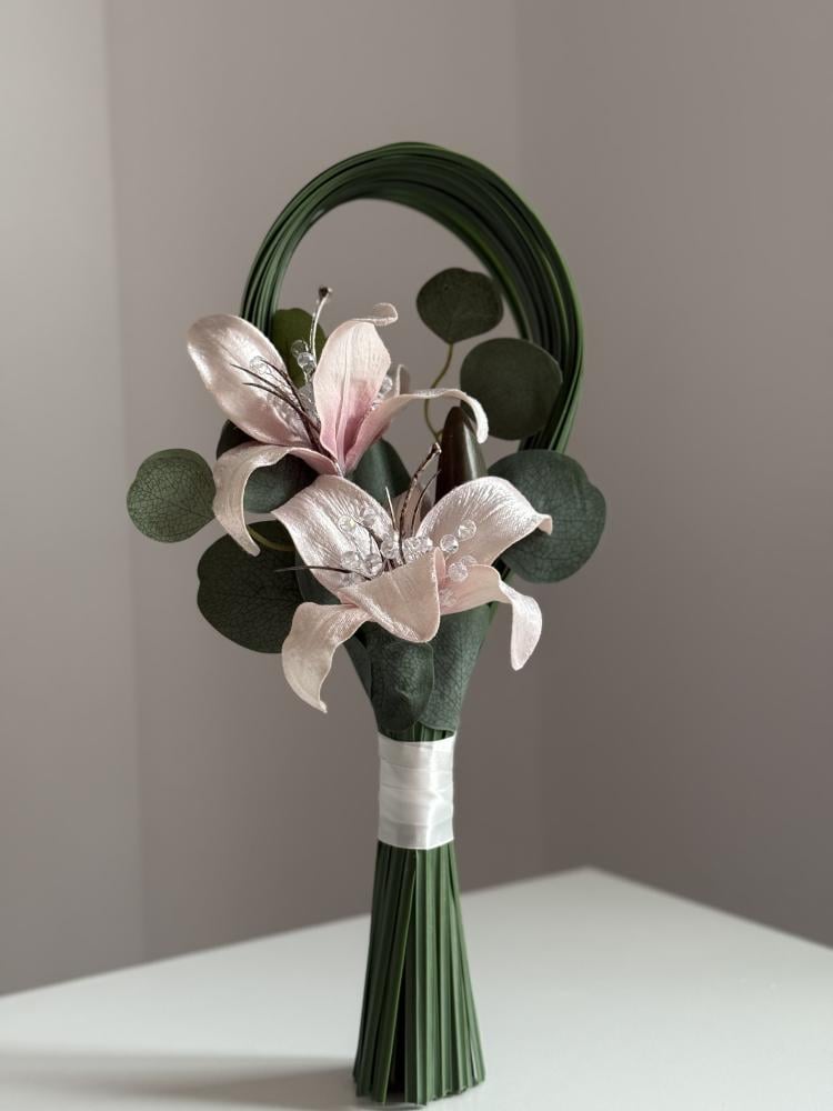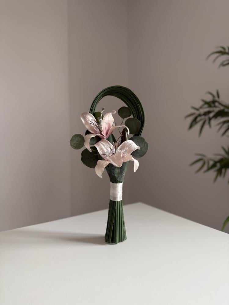 من ورد الليليوم اللحمي صنعت هذه المسكة بطريقة حديثة و ناعمة جعلها خيارا مفضلا لعرائس الملكة و الحفلات الصغيرة