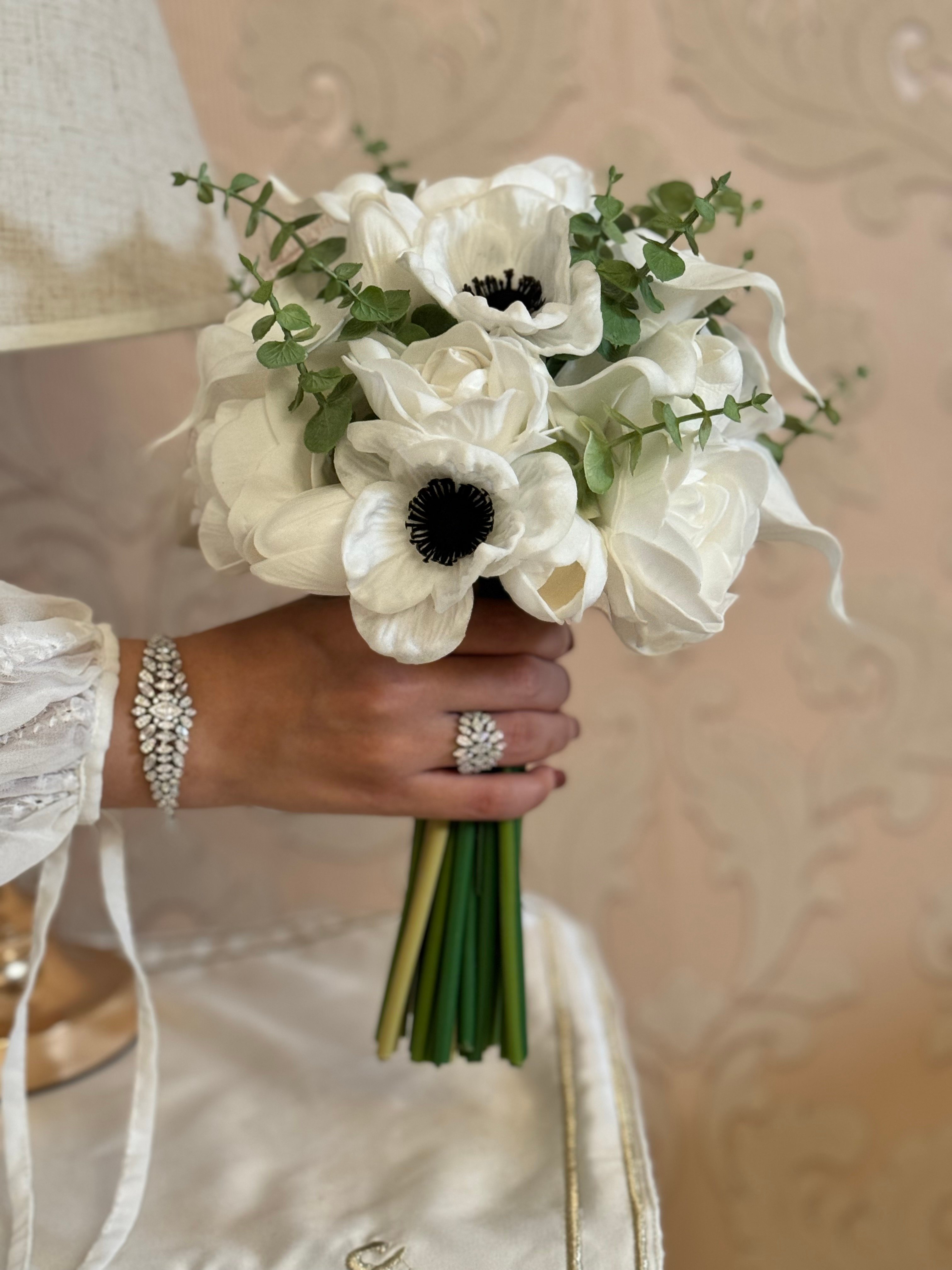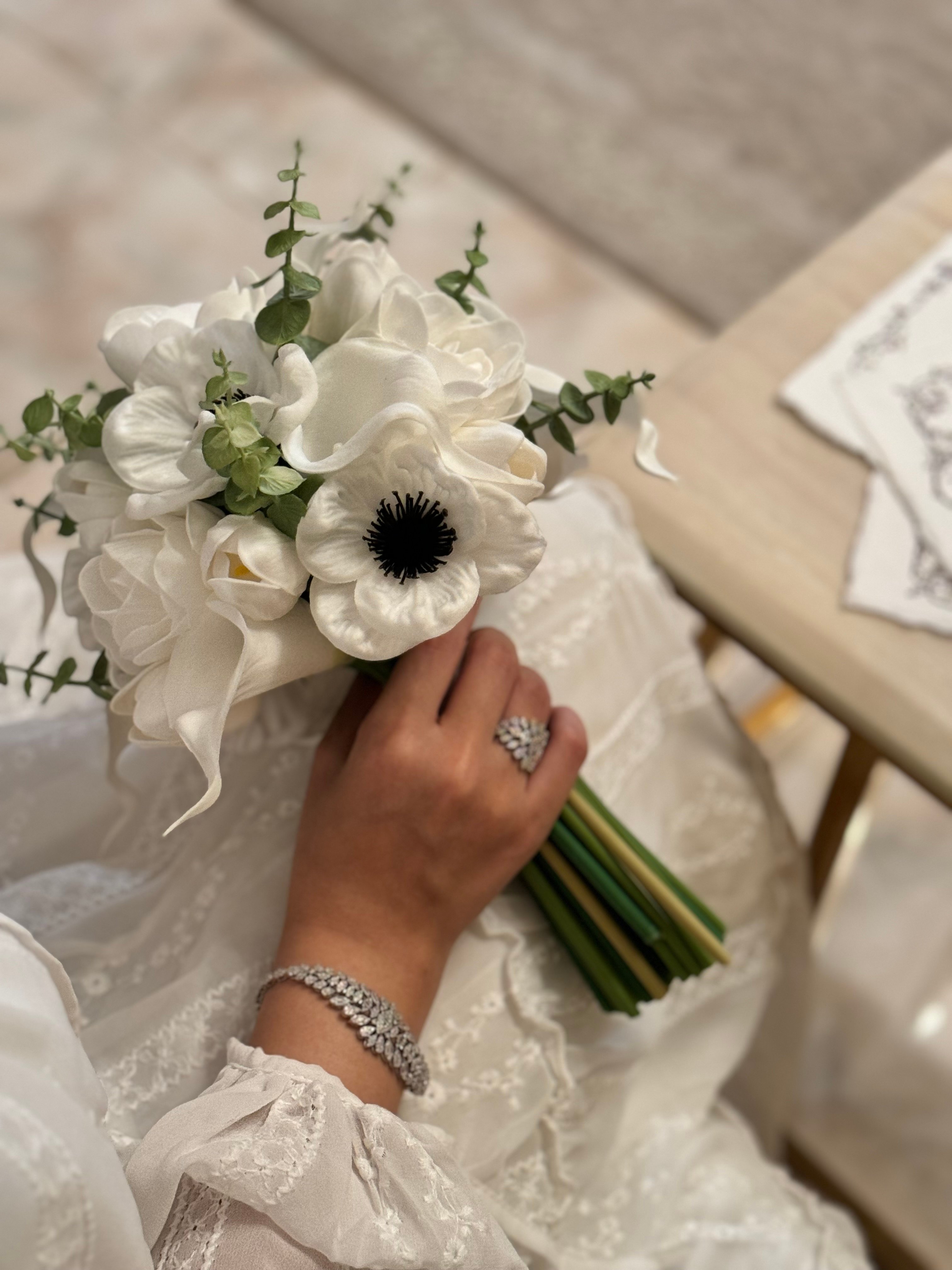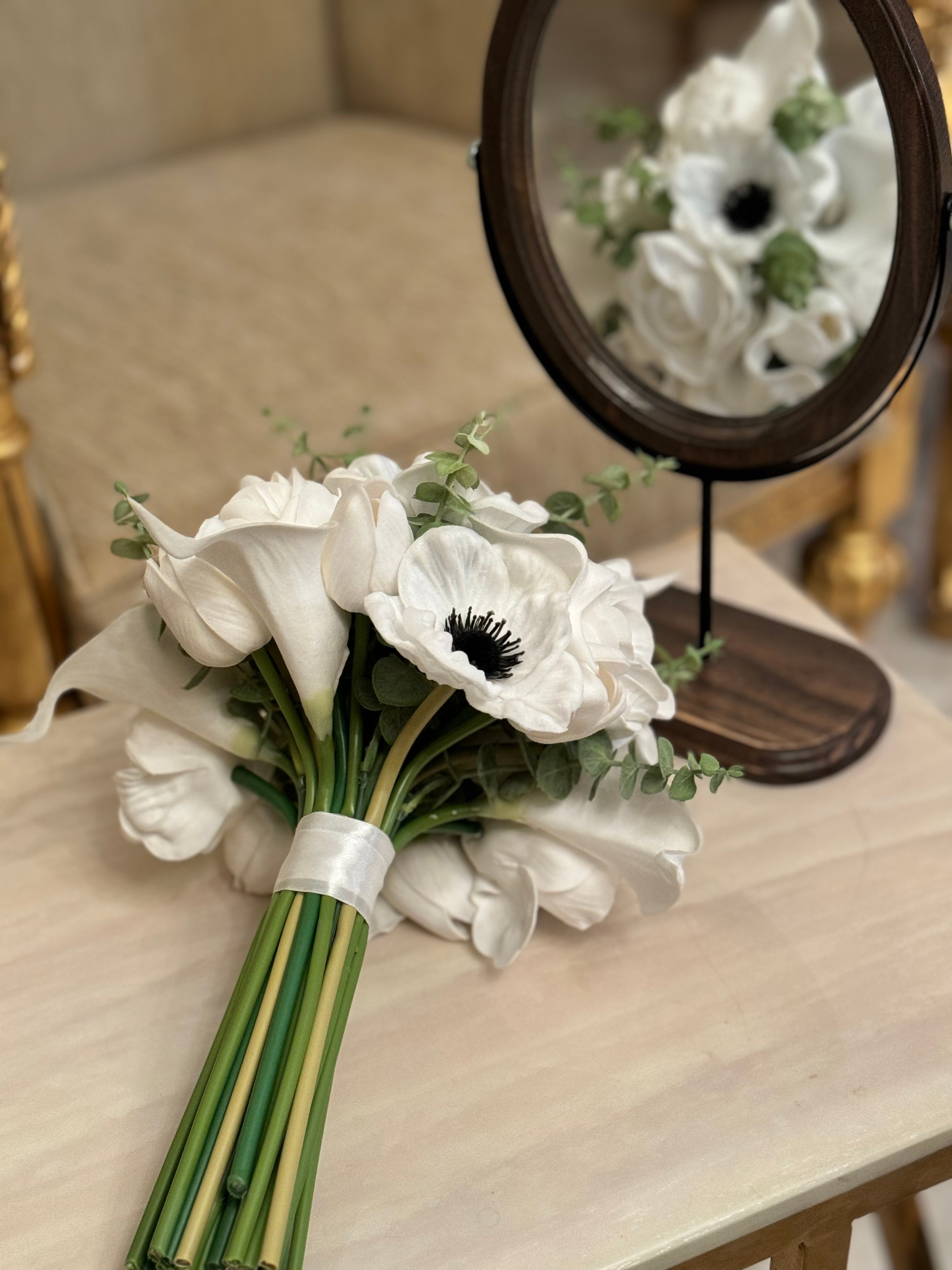 لمسكة عروس فاخرة صممت هذه المسكة بورود البيبي روز مع الكالا مزينة بالأغصان لتمنح طلة متميزة للعروس