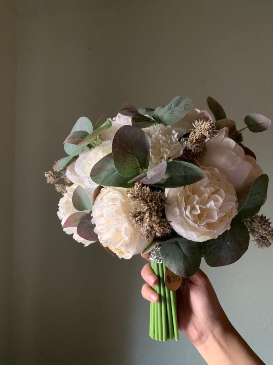 مسكة ناعمة بزهور البيونيه والقرنفل مع أوراق الاوكالبتوس والعرفج الصناعي