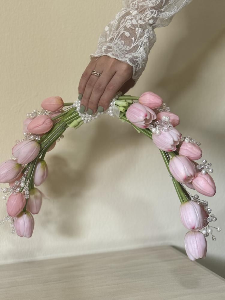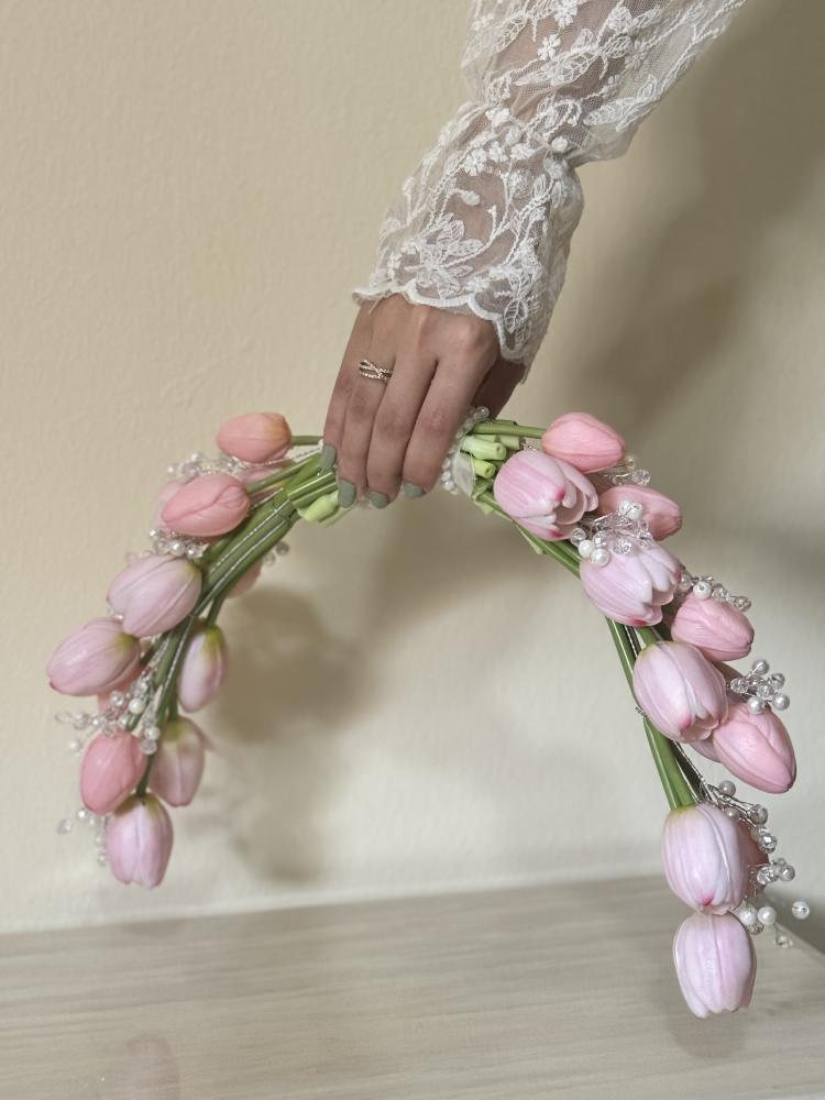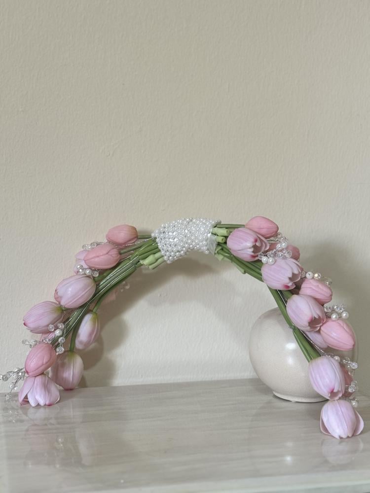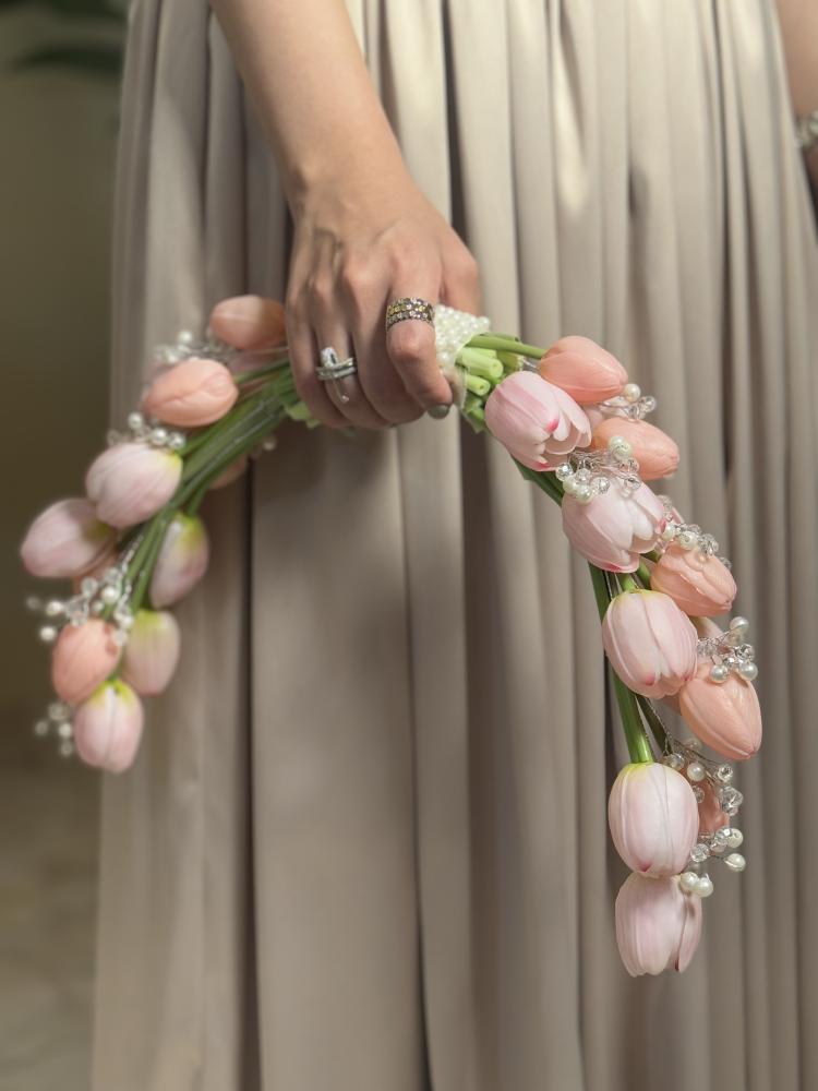 مزيج من ورد الكالا مع التوليب و البيونيه مموج الالوان مع اضافات و اكسسوارات تعطي احساسا بالنعومة