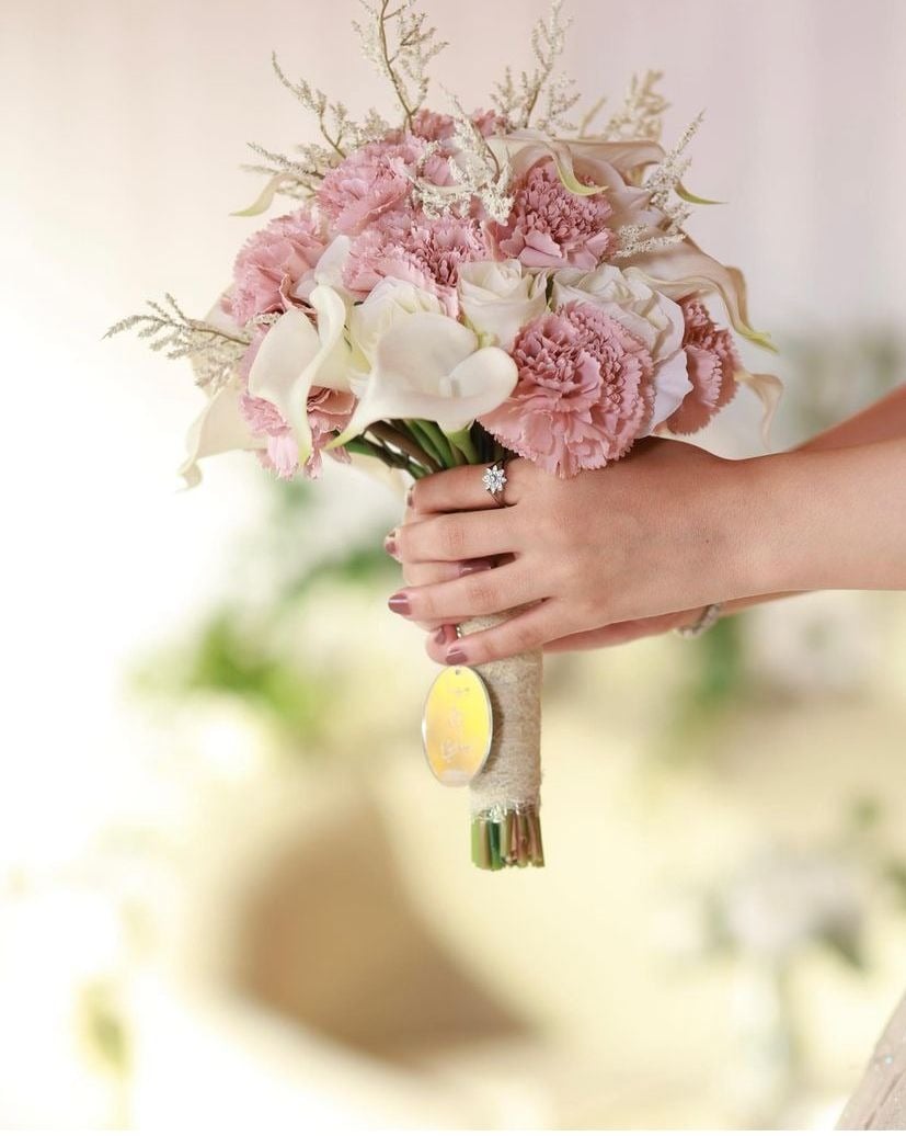 مسكه أنيقه وأنثويه ..متناغمه الالوان مزيج بين زهره الكالا و القرنفل اللحمي و ورد الجوري مطعمه بأغصان اضافت أناقه وتناسق للمسكه