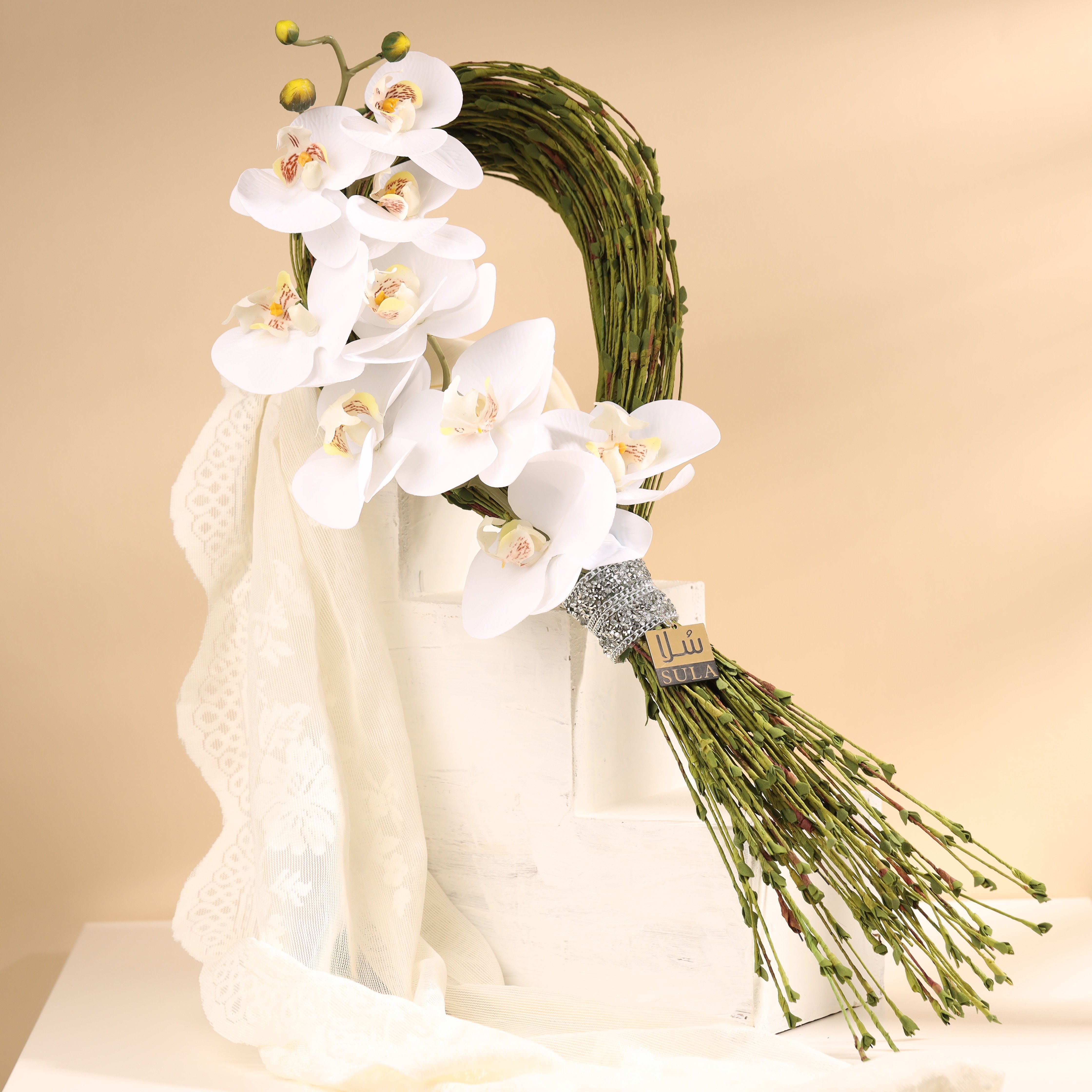 تحتوي على غصن الاوركيد مع اغصان خضراء مميزة و الملتوية