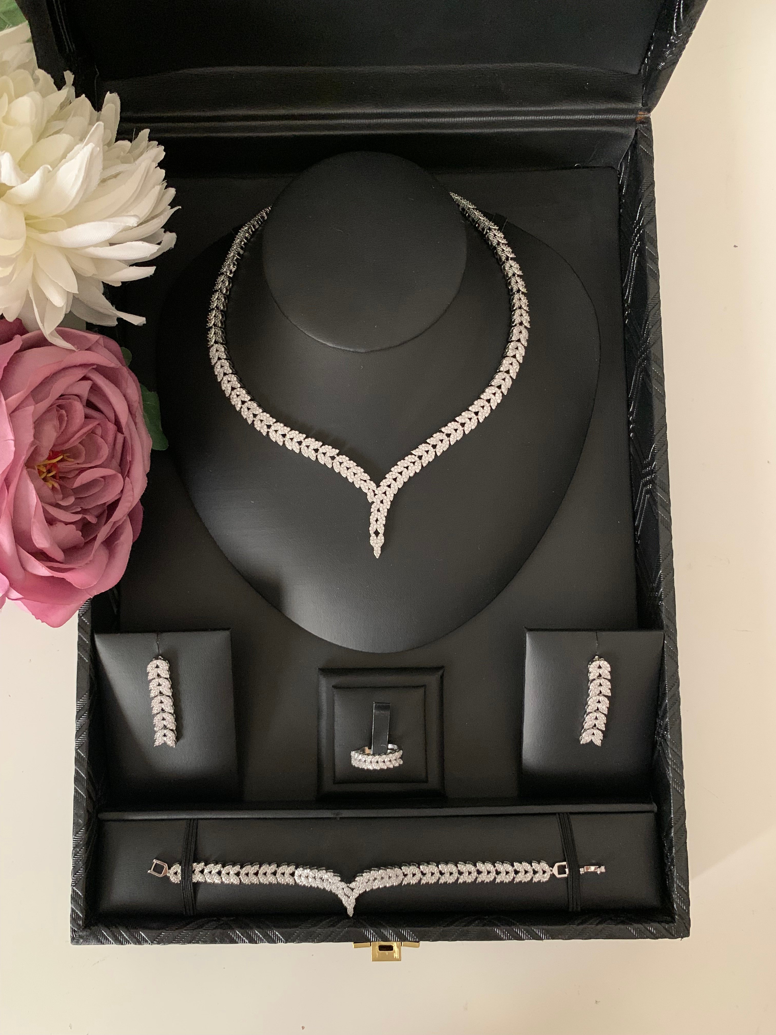 - يحتوي الطقم على (عقد - اقراط اذن (حلق ) - خاتم - اسورة يد)