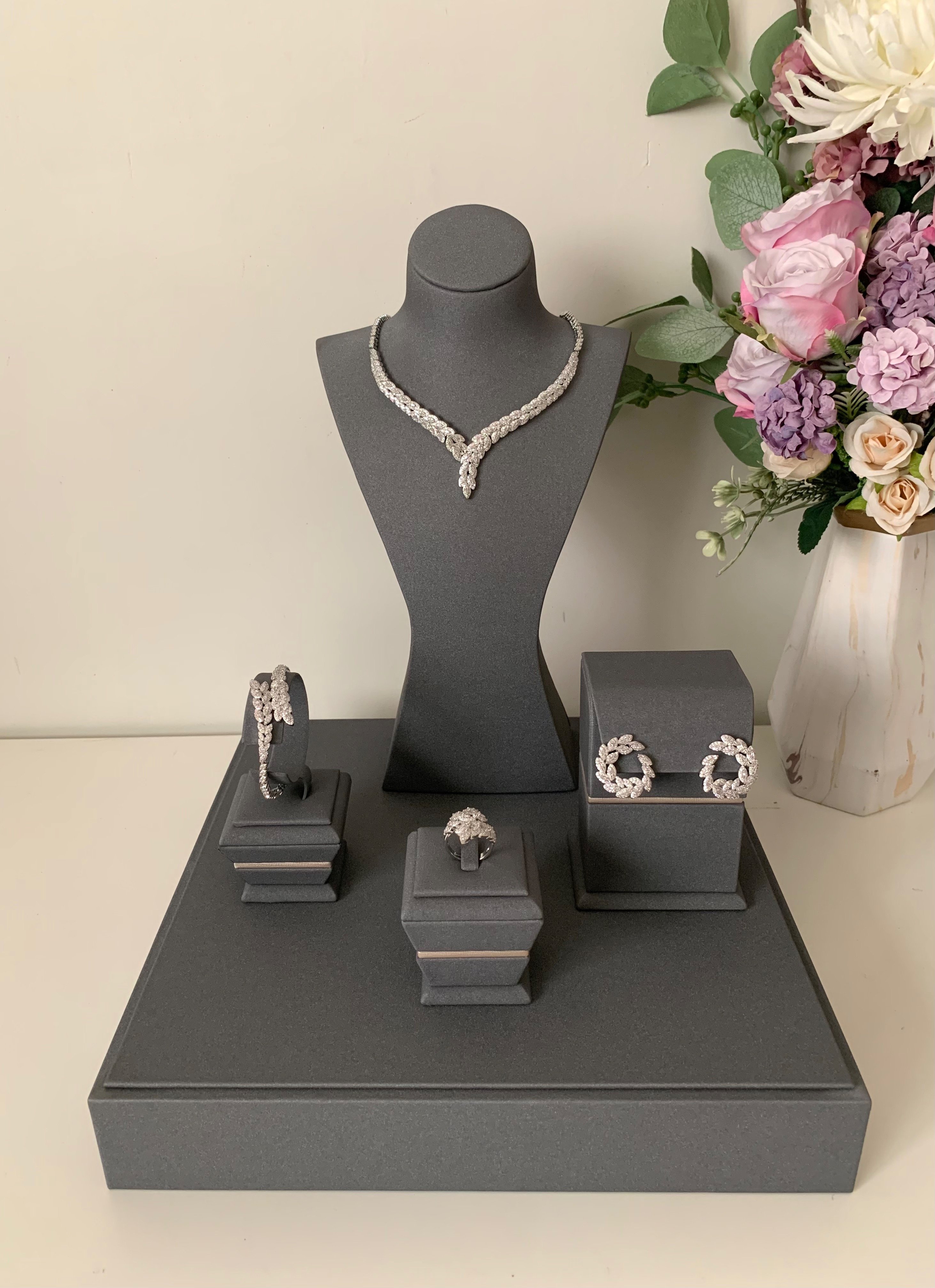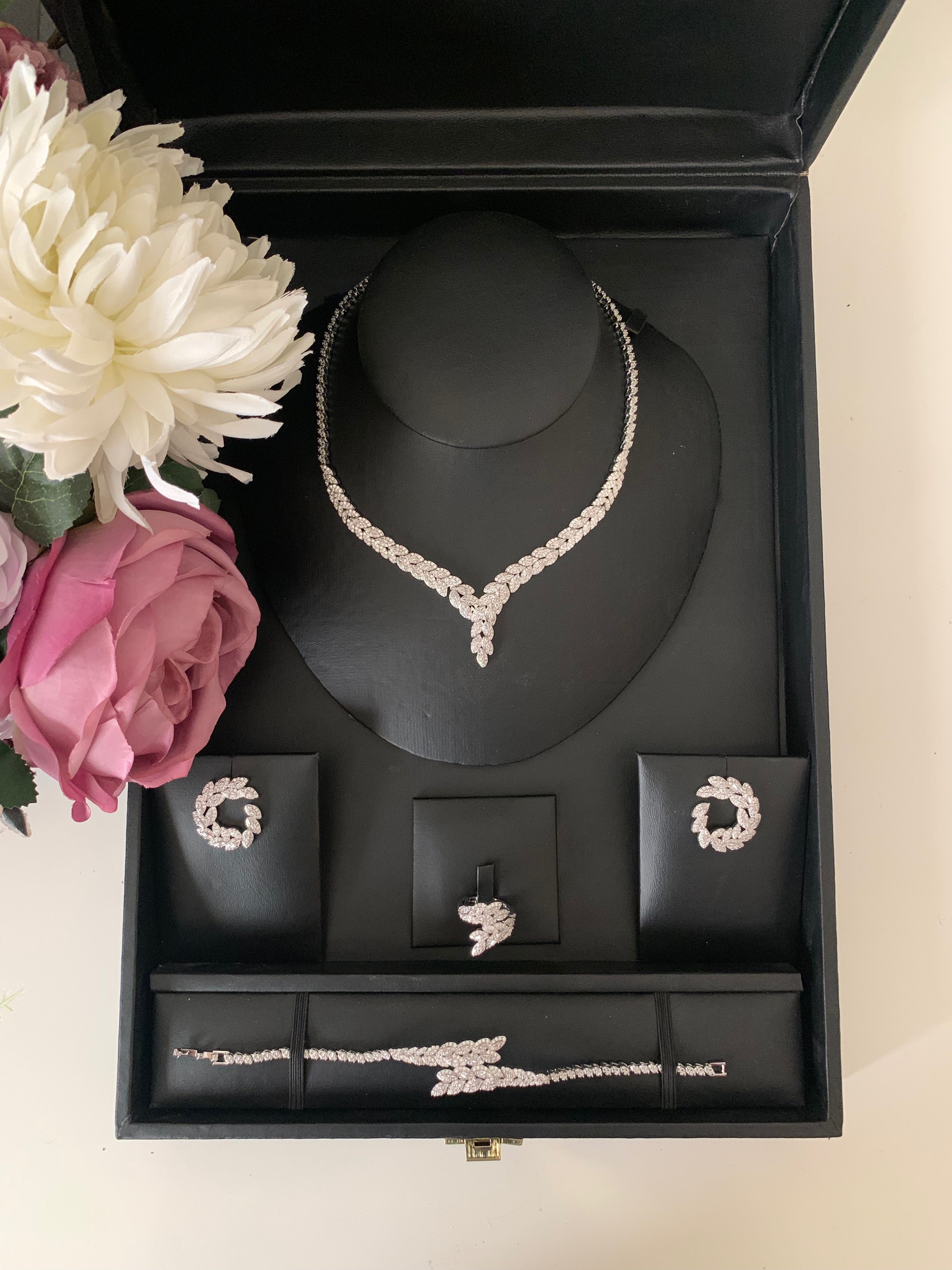- يحتوي الطقم على (عقد - اقراط اذن (حلق ) - خاتم - اسورة يد)