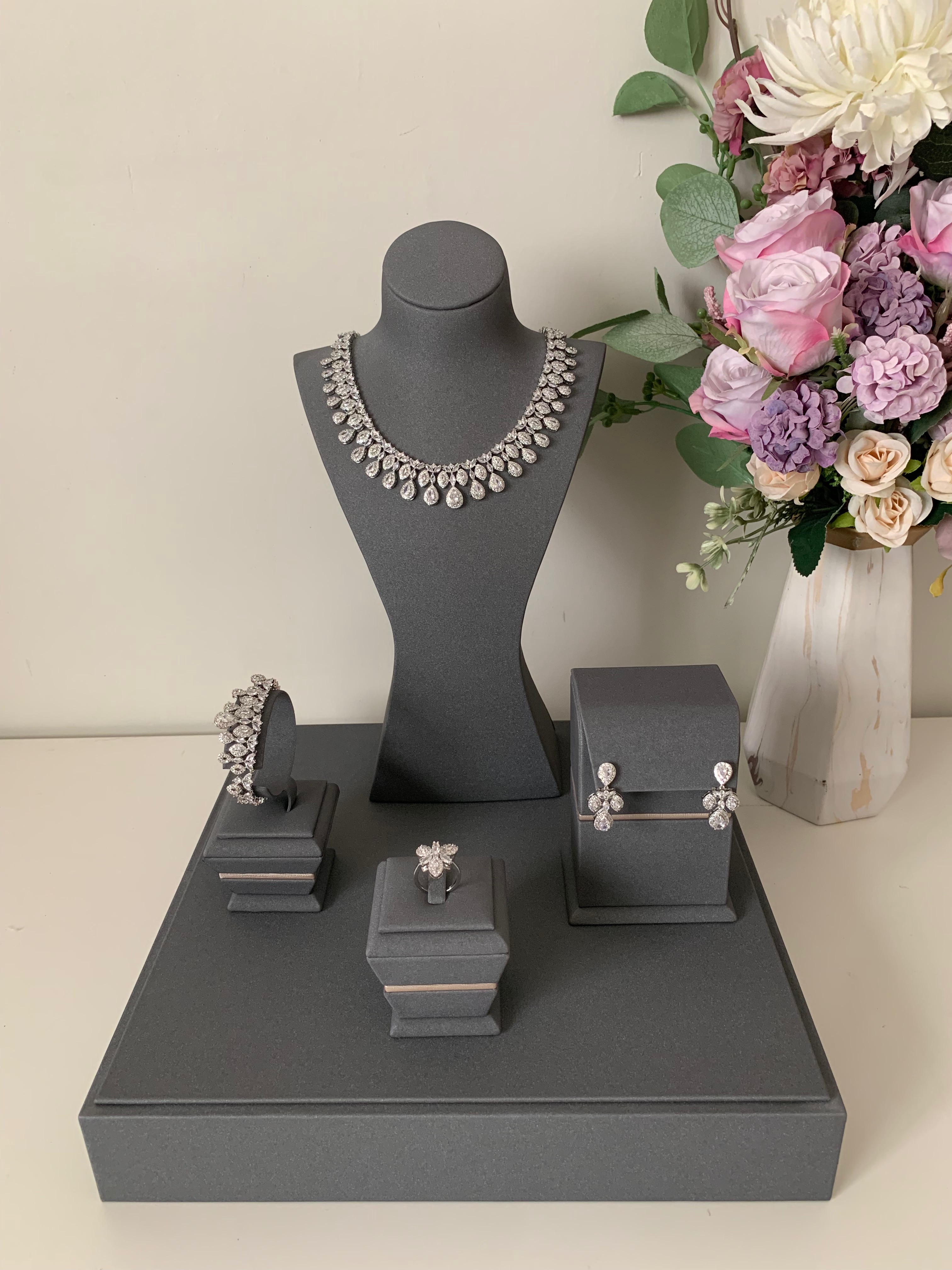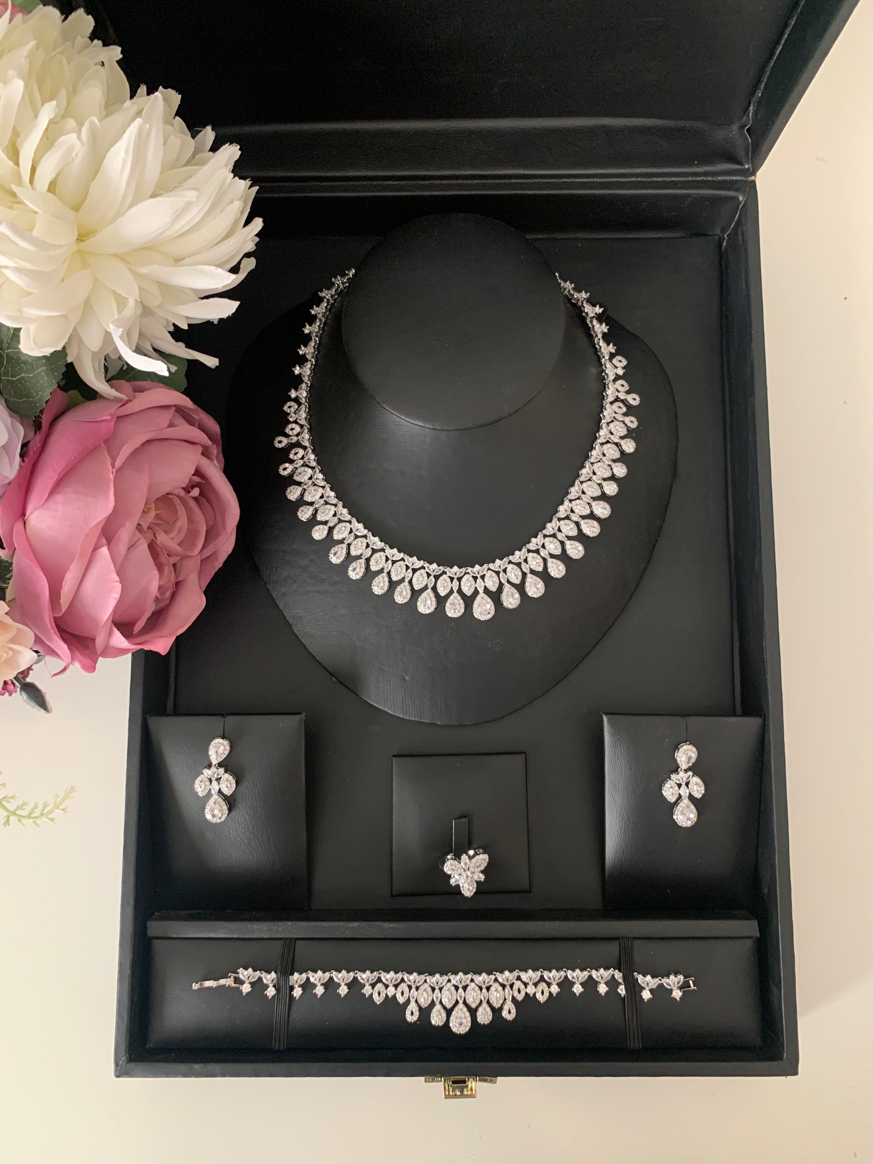 - يحتوي الطقم على (عقد - اقراط اذن (حلق ) - خاتم - اسورة يد)