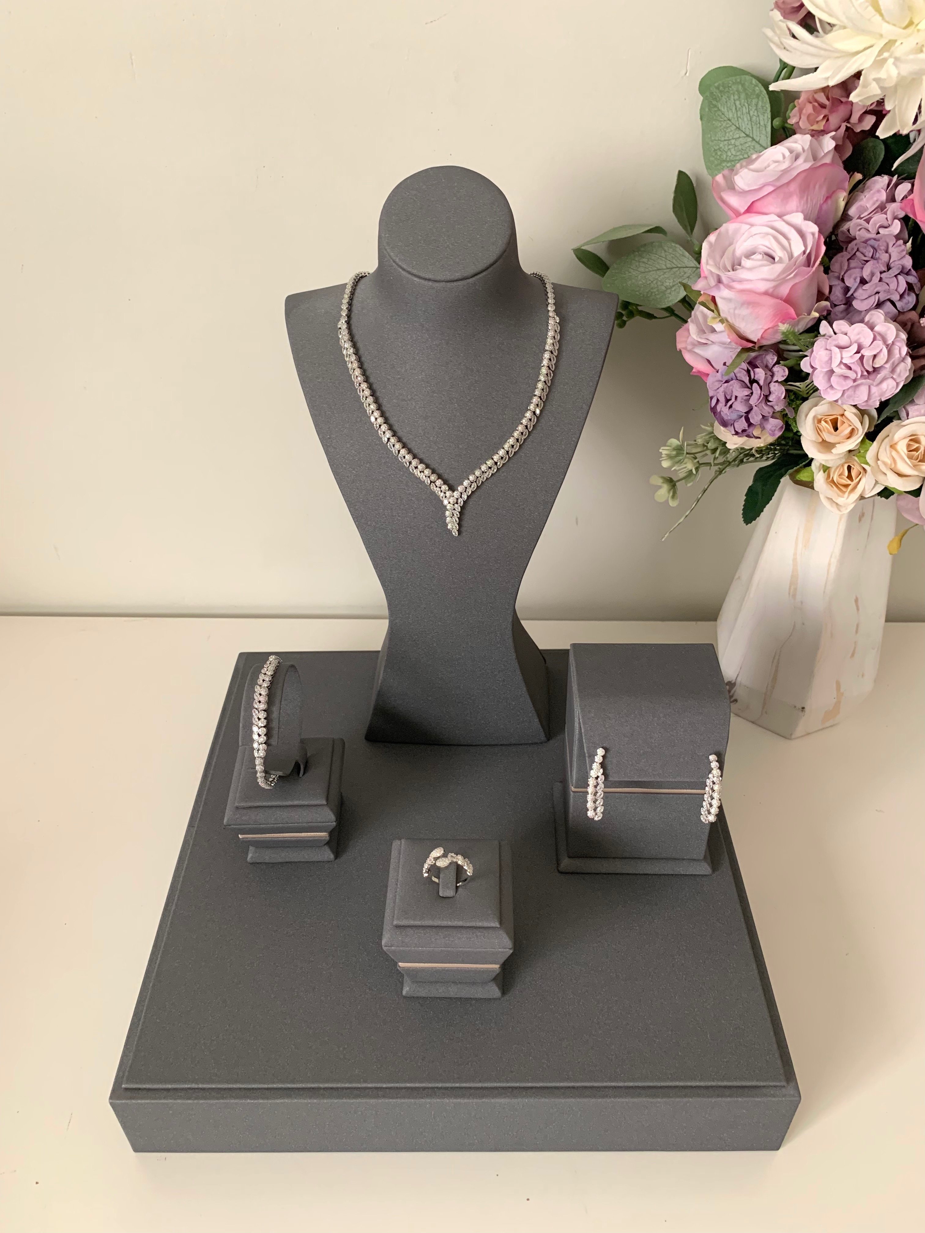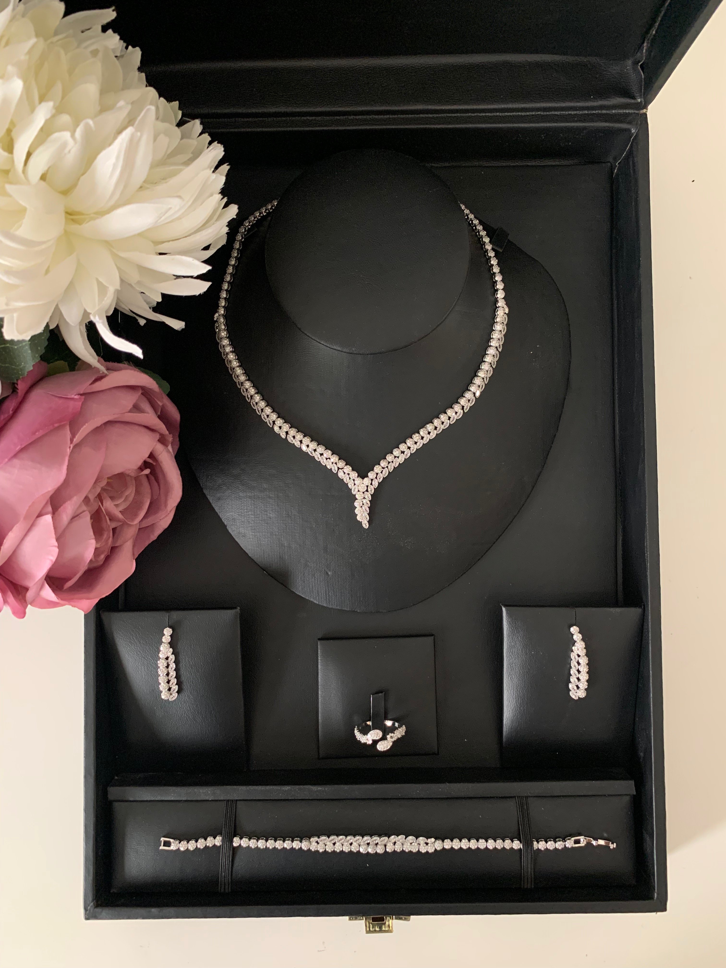 - يحتوي الطقم على (عقد - اقراط اذن (حلق ) - خاتم - اسورة يد)