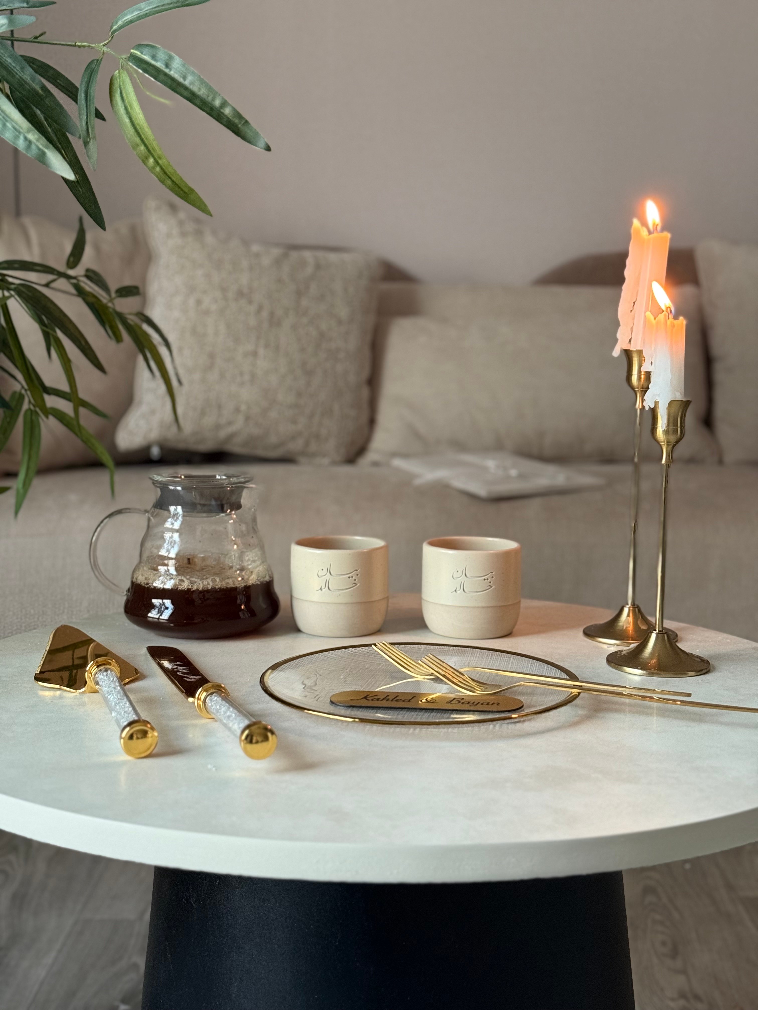 - يحتوي على ( كوبين قهوة- شوكتين - سكين و حامل كيك - صحن )