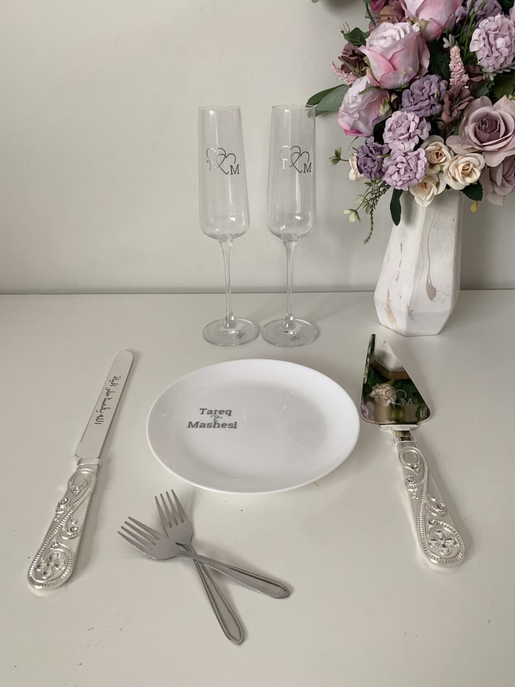 - الكتابة تكون على ( الكاسات - الصحن - السكين - حامل الكيك -القاعدة)