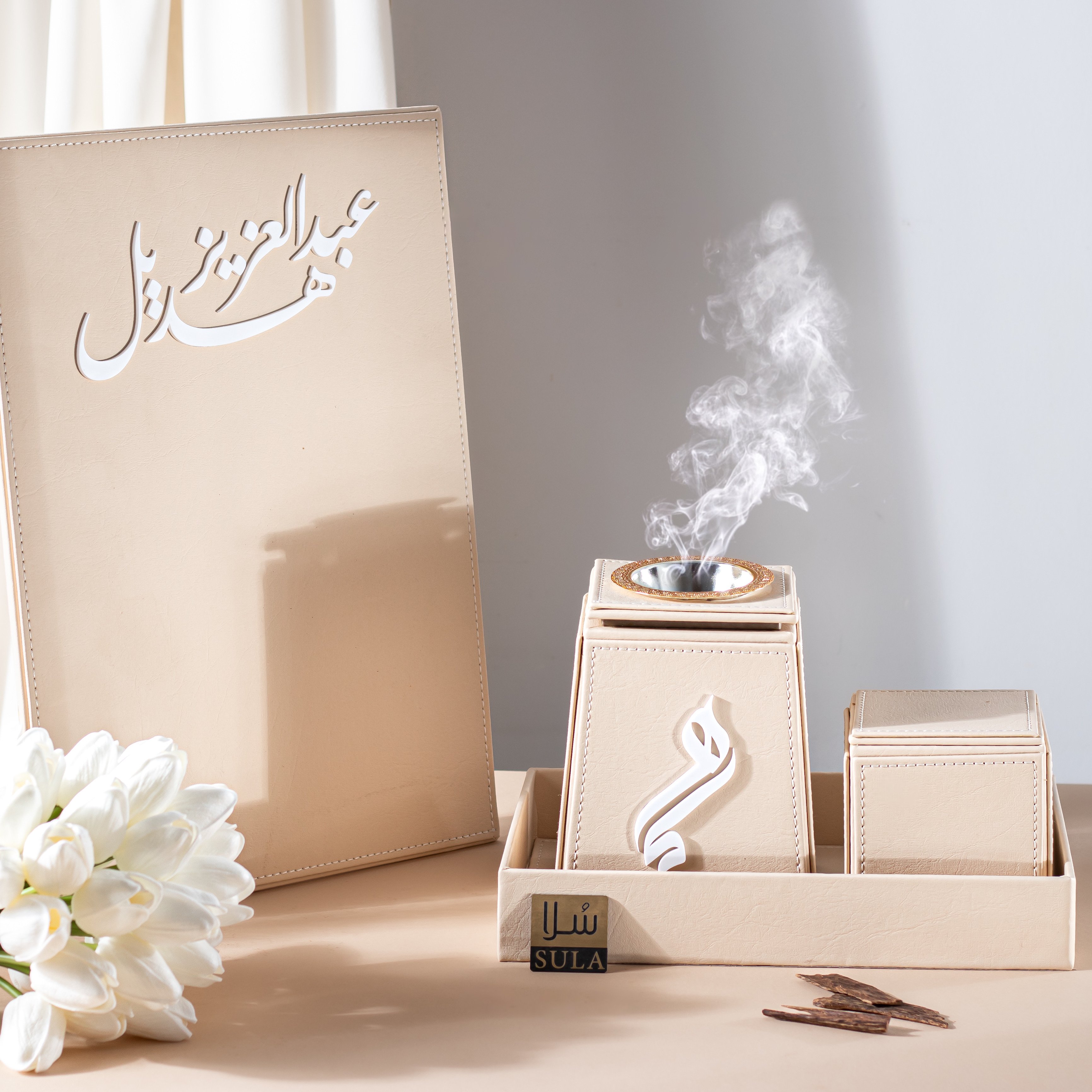 مجموعة جلدية باللون (البيج / الرمادي ) مكون من طقم مبخرة و لوح عقد القران .