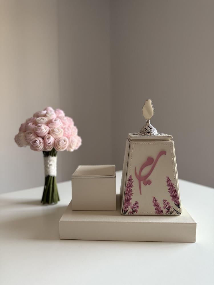 طقم مبخرة متكامل يجمع بين النعومه و الرقه ، تضفي طبعة زهرة اللافندر نوعًا اخرًا من الجمال ، مصنوعة من الجلد الفاخر