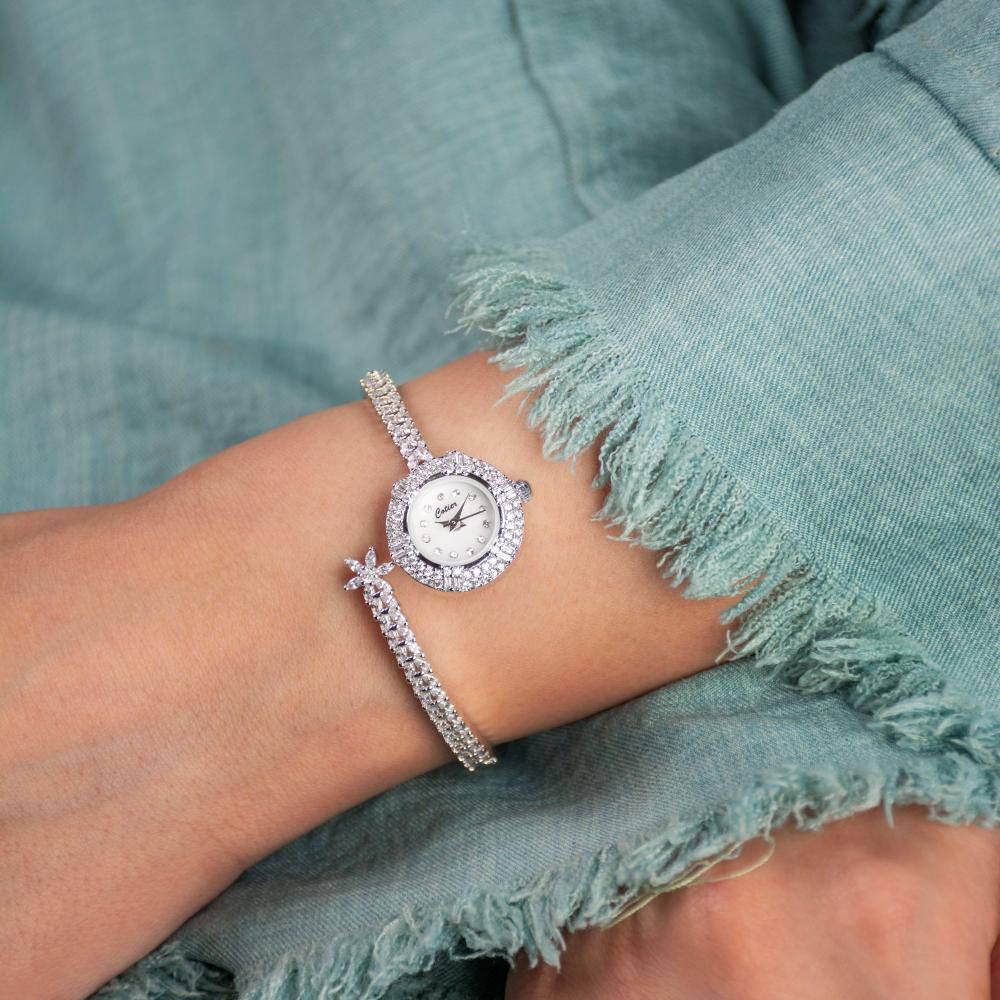 وتحتوي على أحجار زركون لامعة تزيّن إطارها و سيرها ، مما يضيف لمسة من التألق.