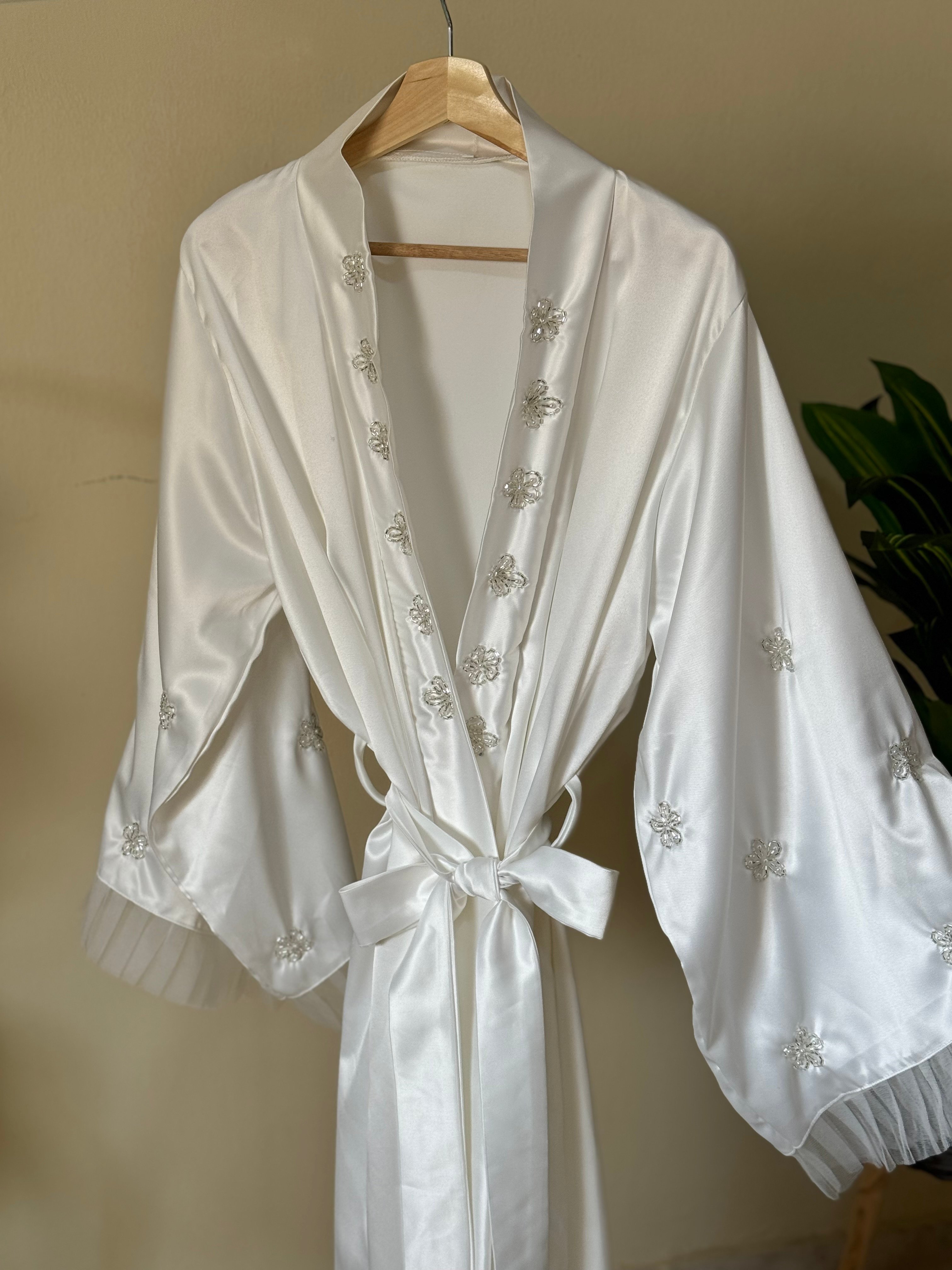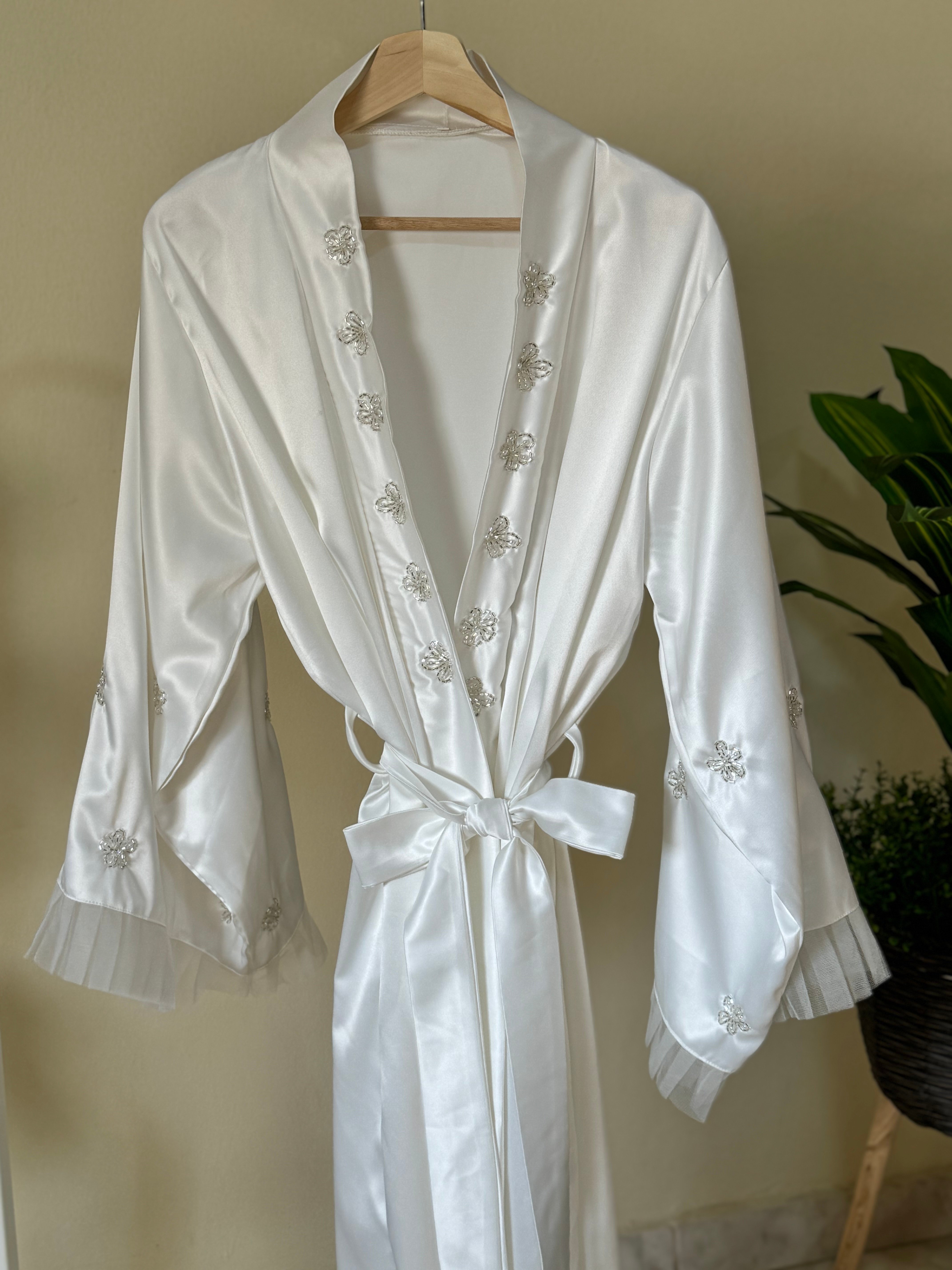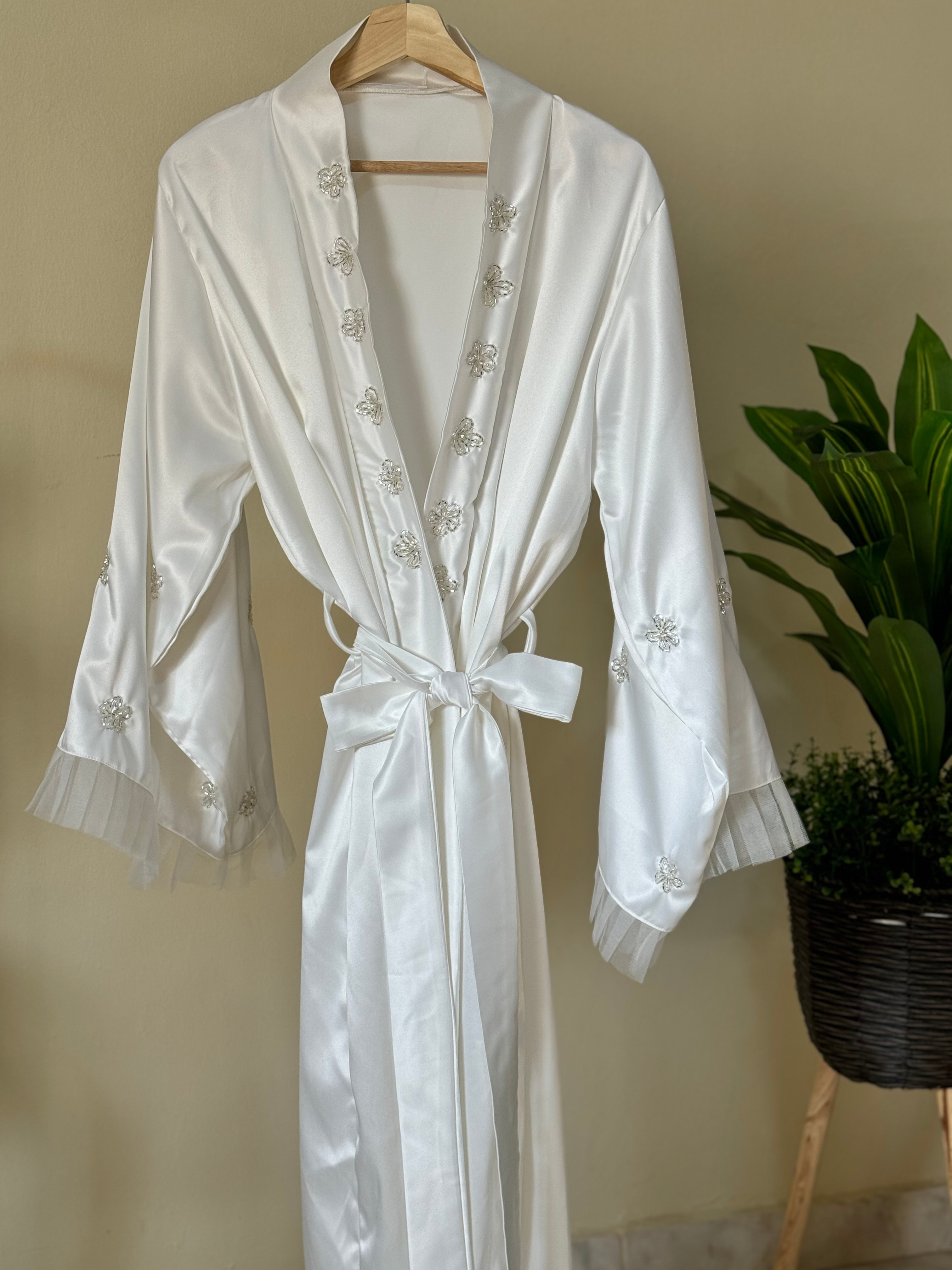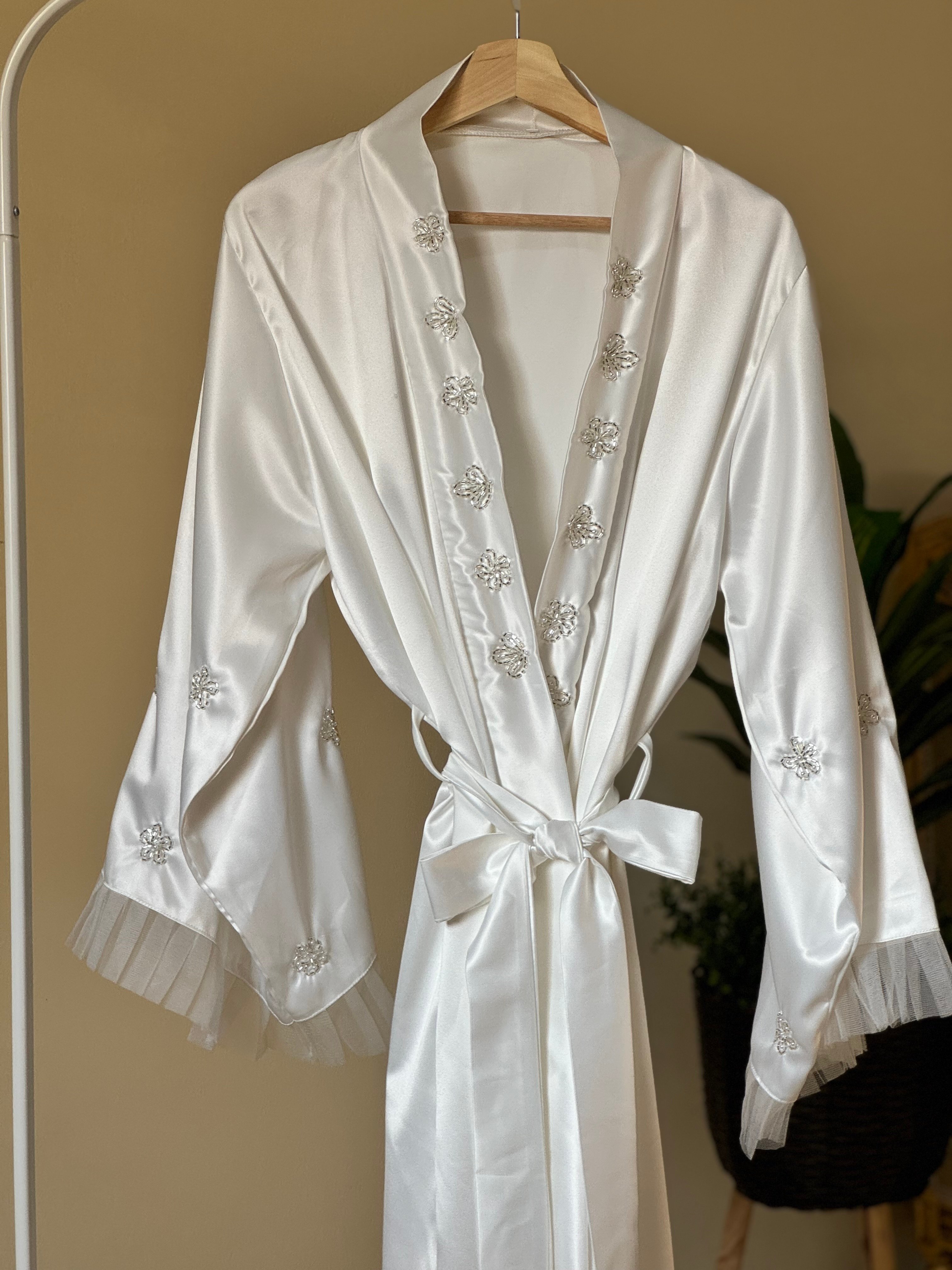 روب فاخر للعرايس مزين من الاكتاف بتطريز ورد جميل و ريش من الاكمام حرير ناعم مطرز بالإسم