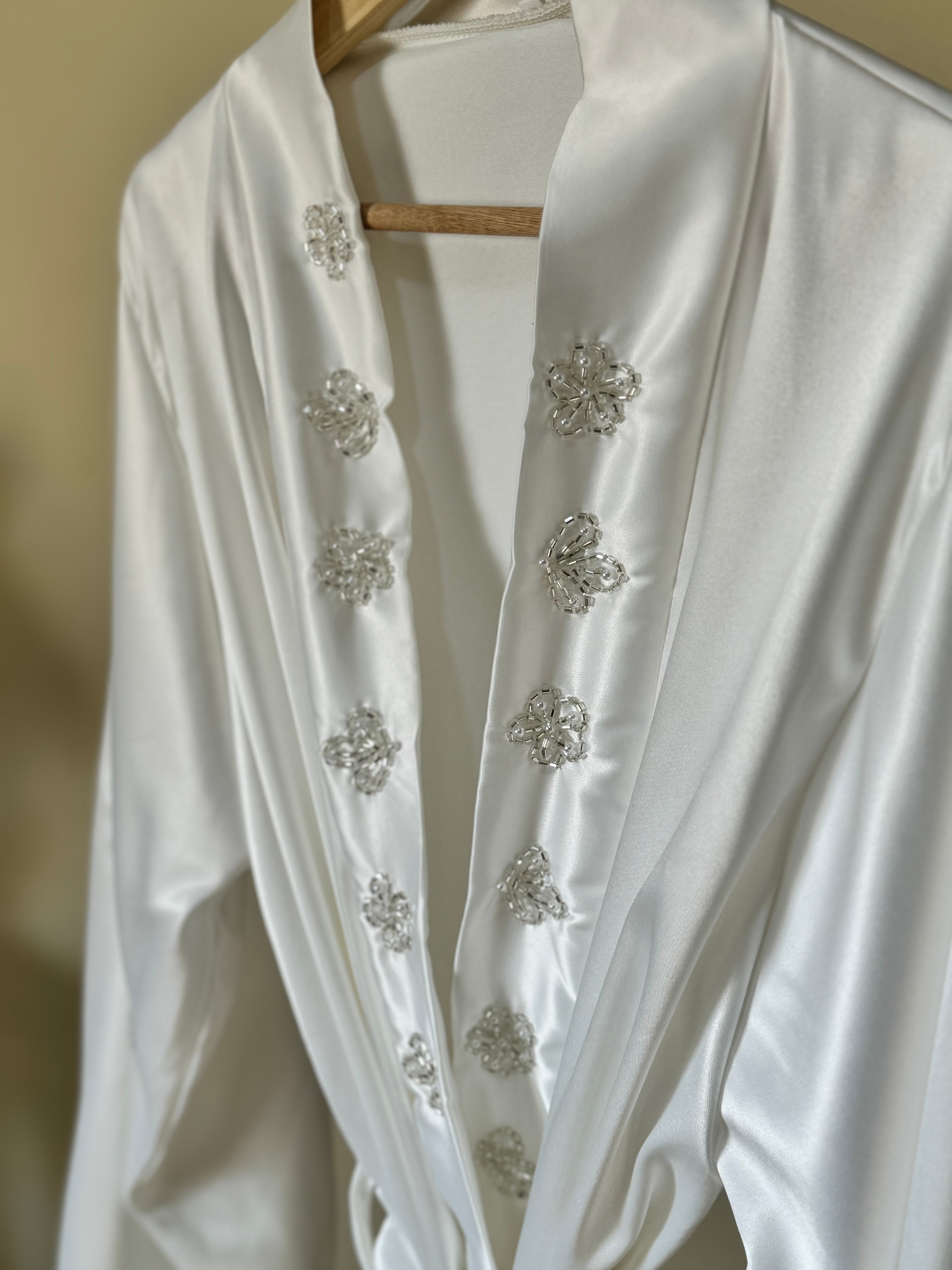 تقريبا كل عروسه تقتني هذا الروب ( أو بجامة ) لأنه مناسب و مريح اللبس عند عمل تصفيف الشعر في الصالون و الميك اب .