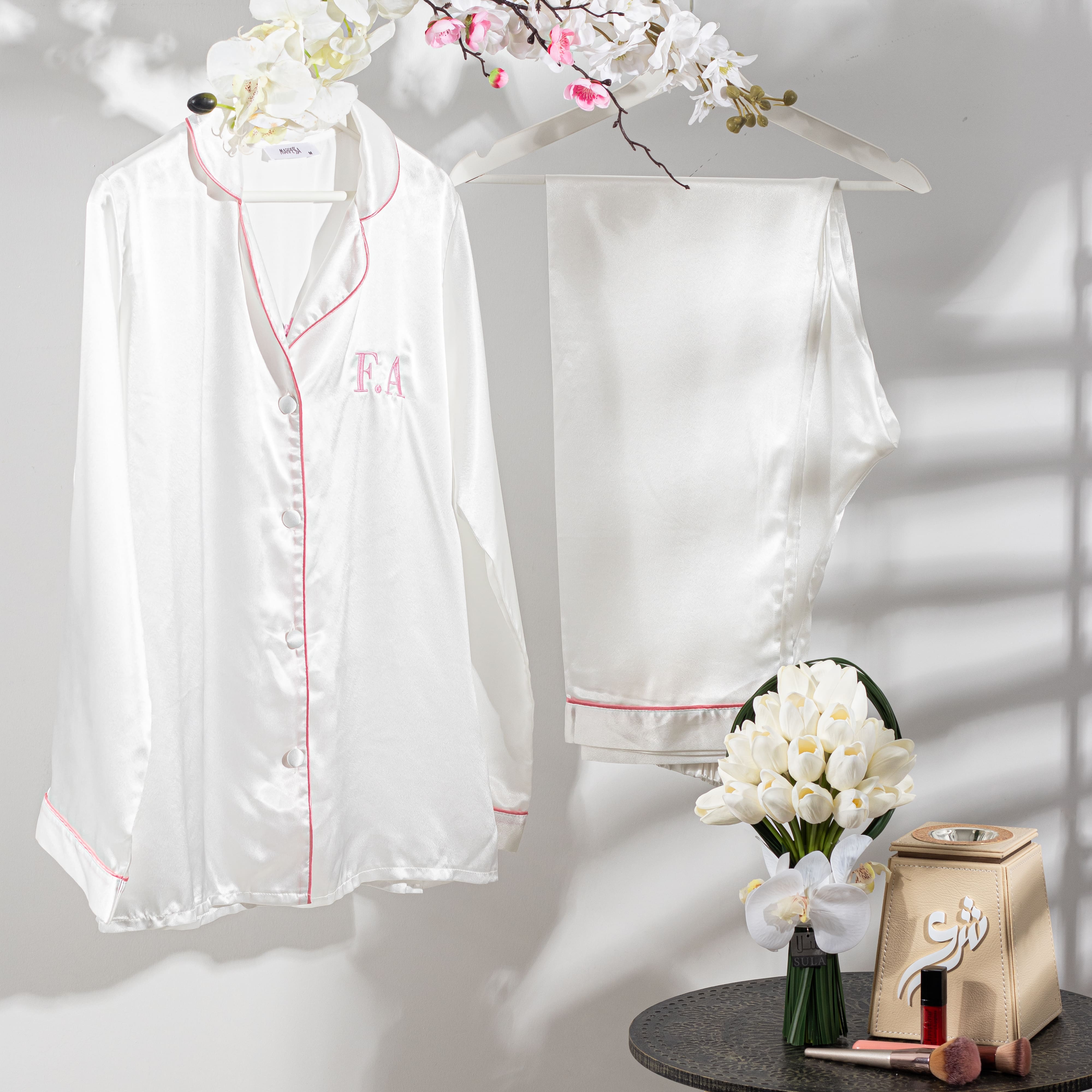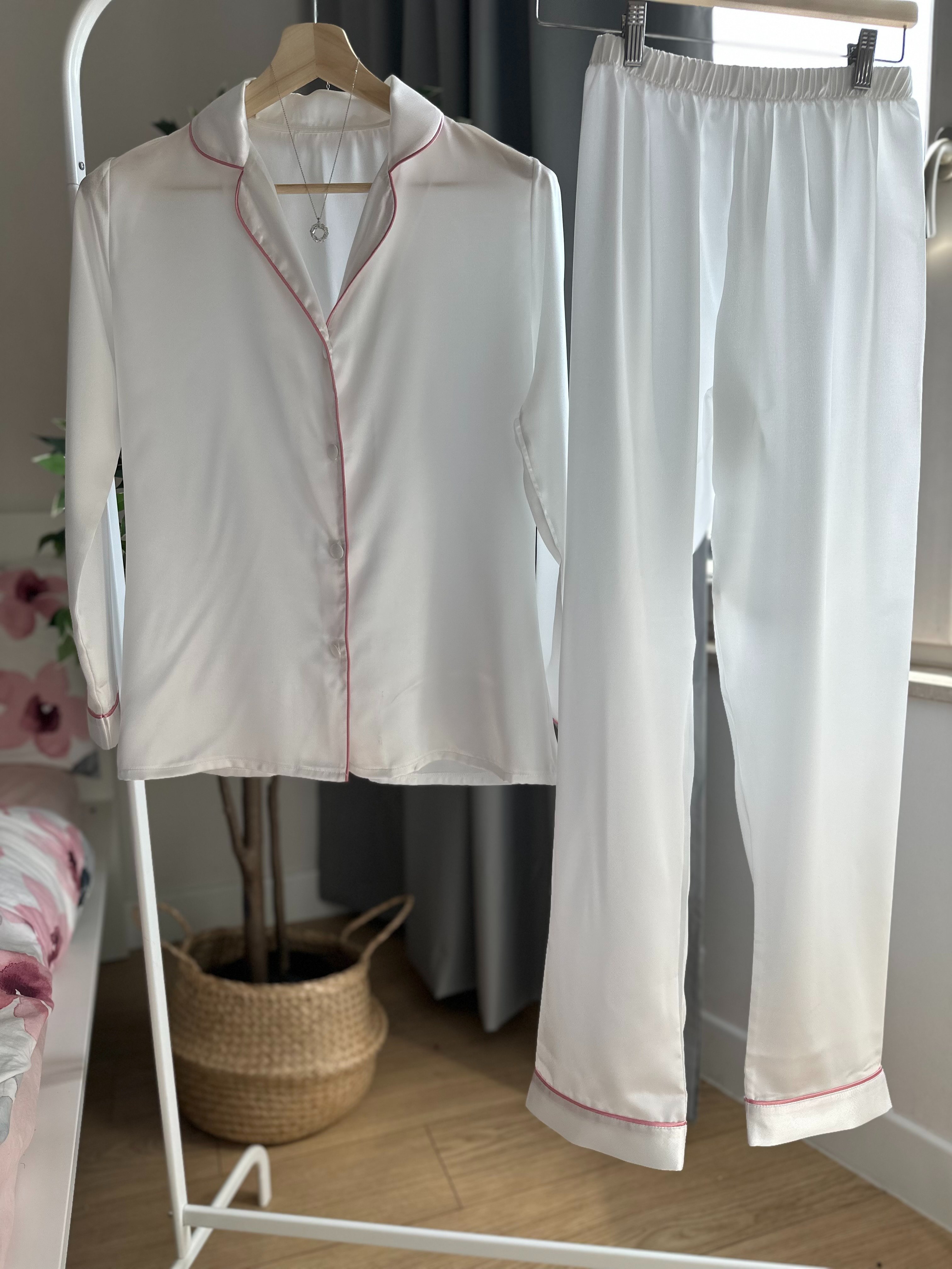 - البجامة مزينة بشريط بلون ( وردي ) على الاطراف ( عند الاكمام و اسفل البنطال )