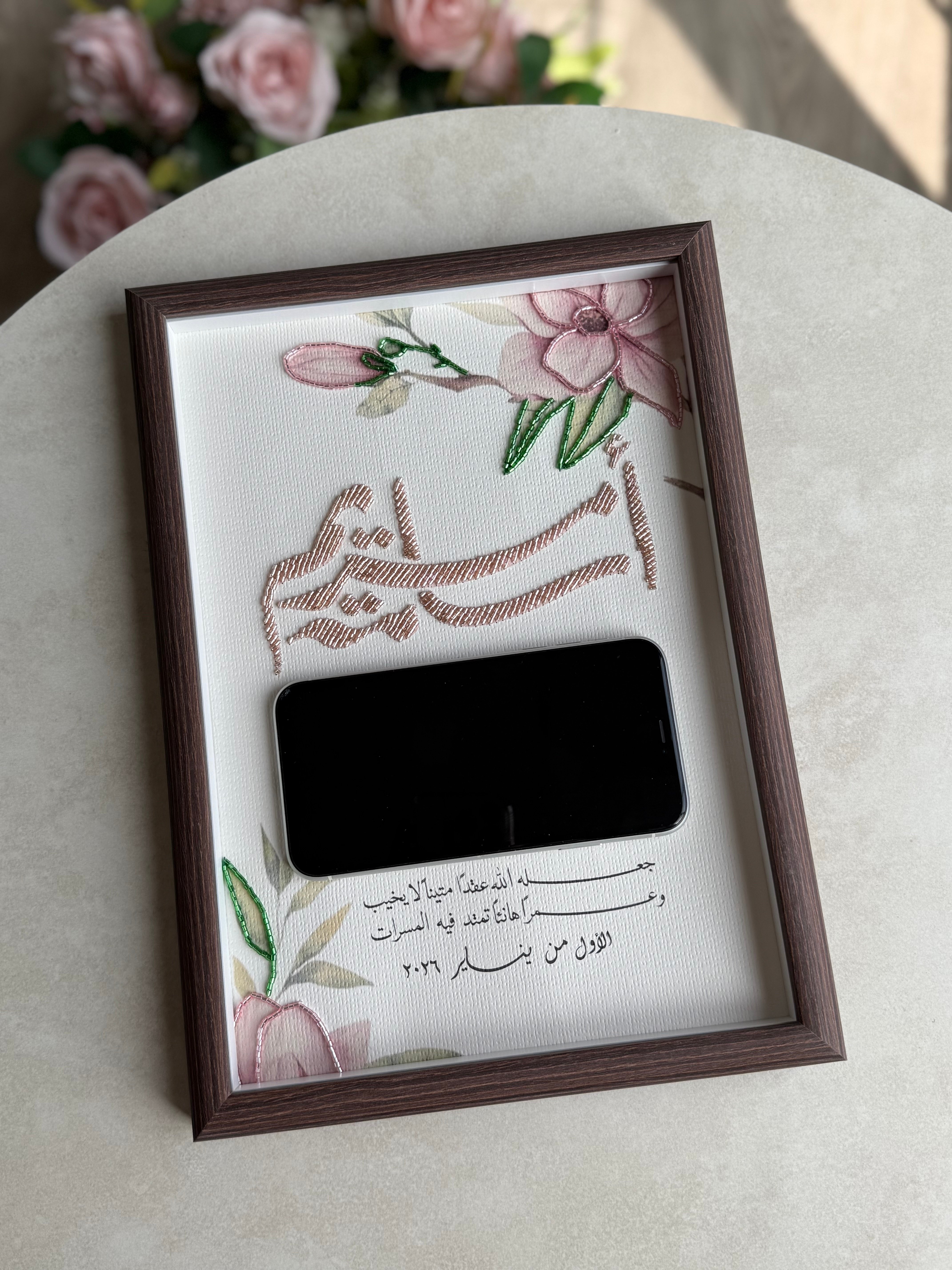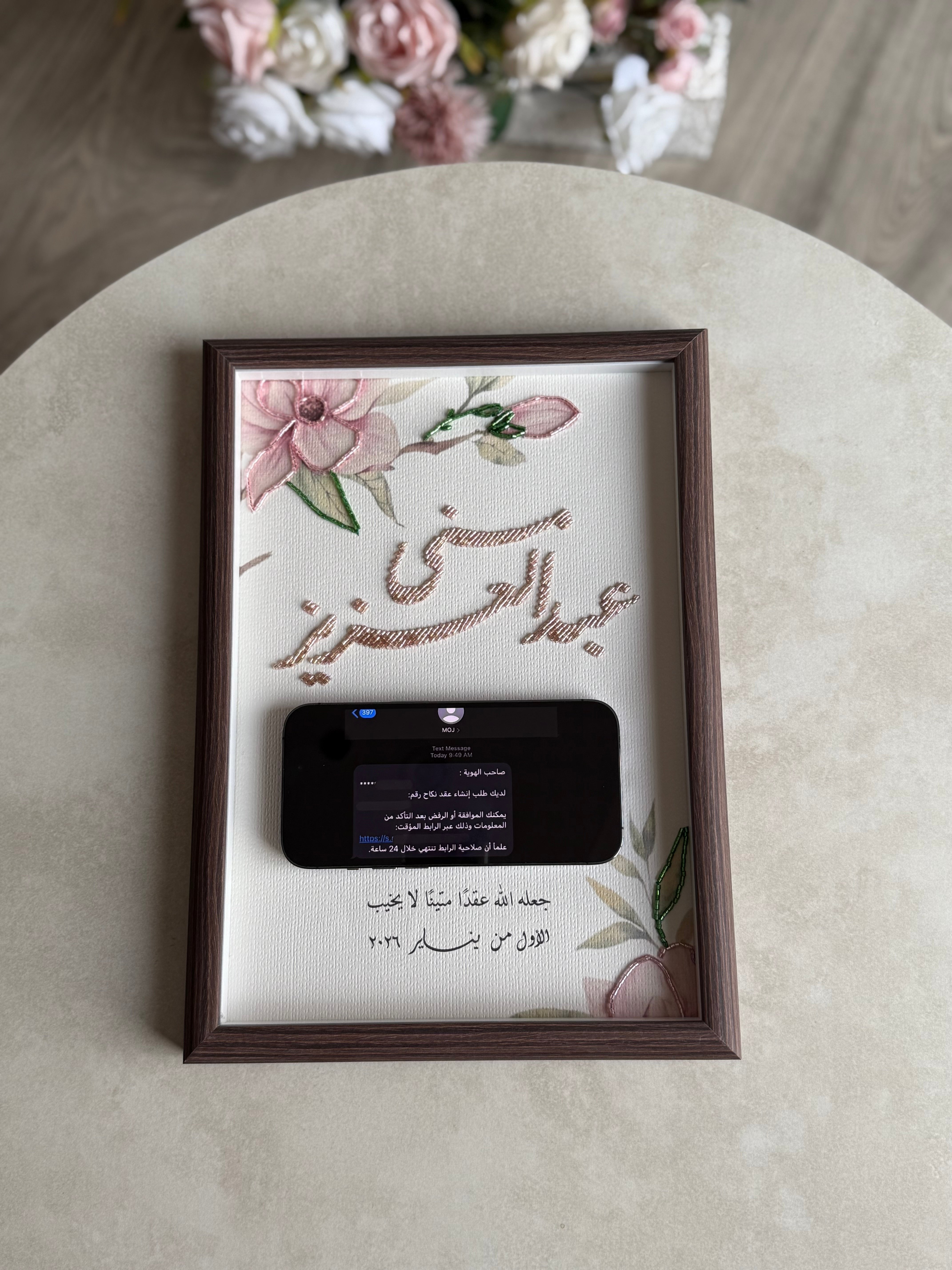 لوحة ببرواز أنيق مع بتطريز أسماء العرسان بالخرز مع ترك مساحه للجوال – تذكار يخلّد أجمل اللحظات