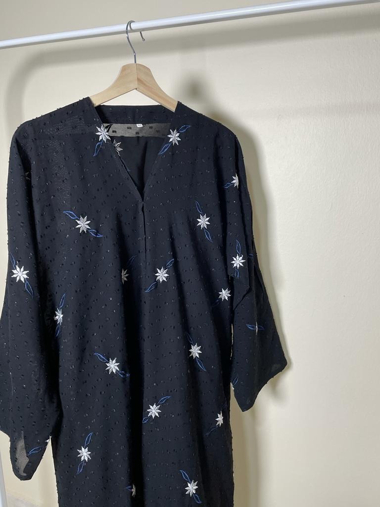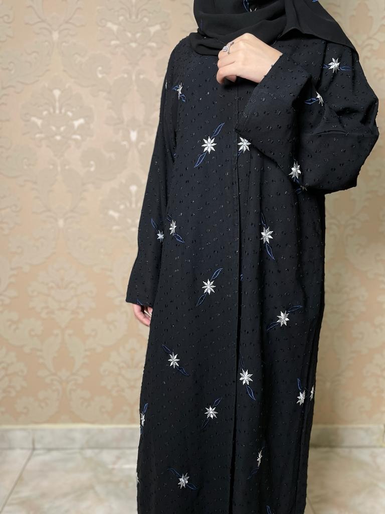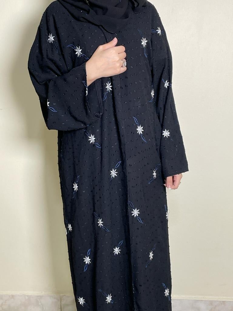 عبايه بتصميم عصري و أنيق..بقماش مميز..موزعه عليها الورود المطرزه بالخيط الابيض..نوع الكم واسع.