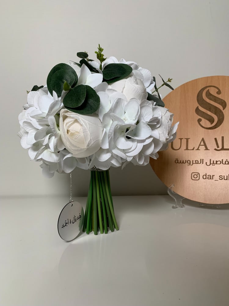 مسكة راقية لاطلالة متناسقة مريحة للعين بزهر البيونيه الأبيض الصناعي شبه الطبيعي