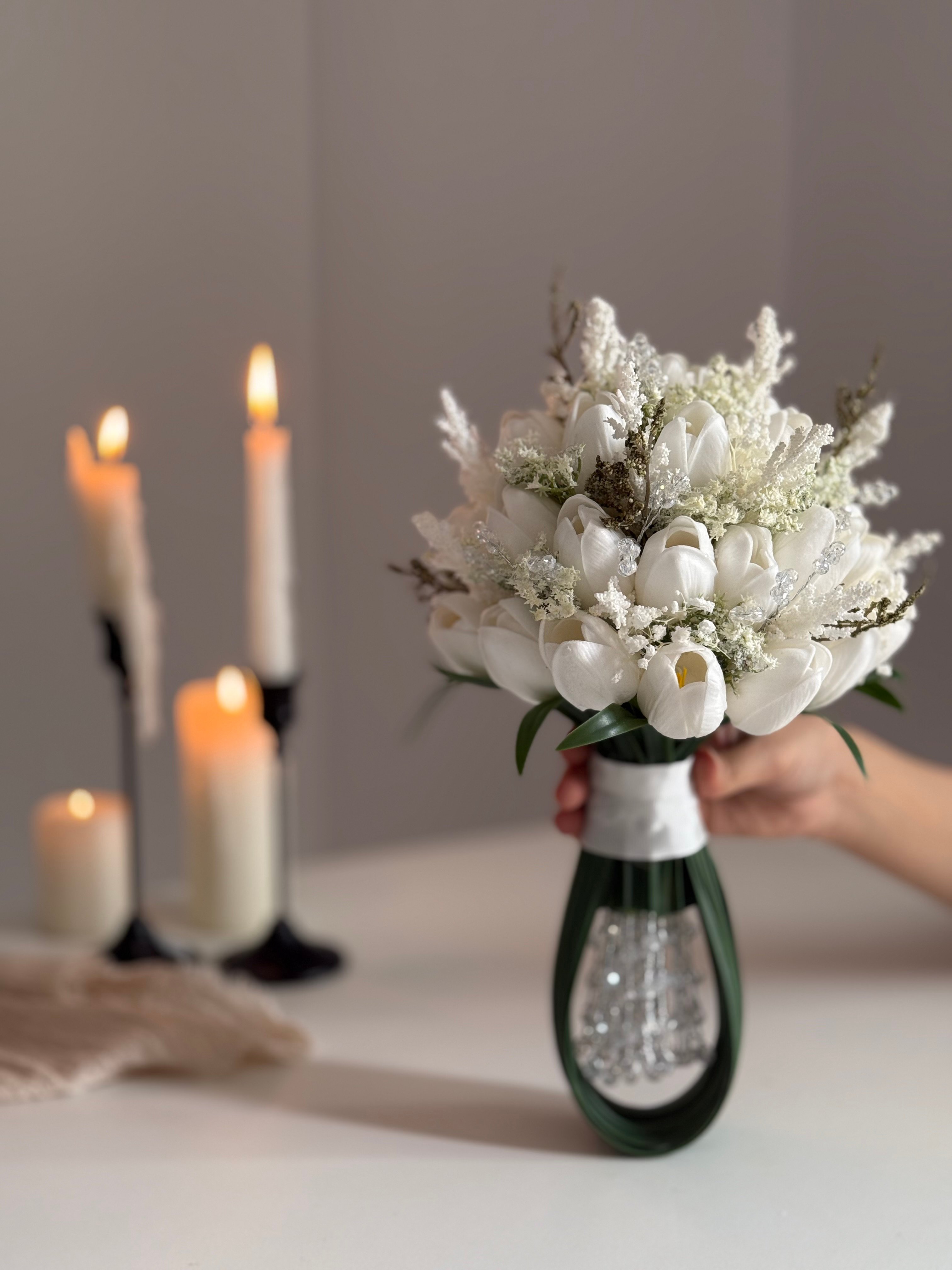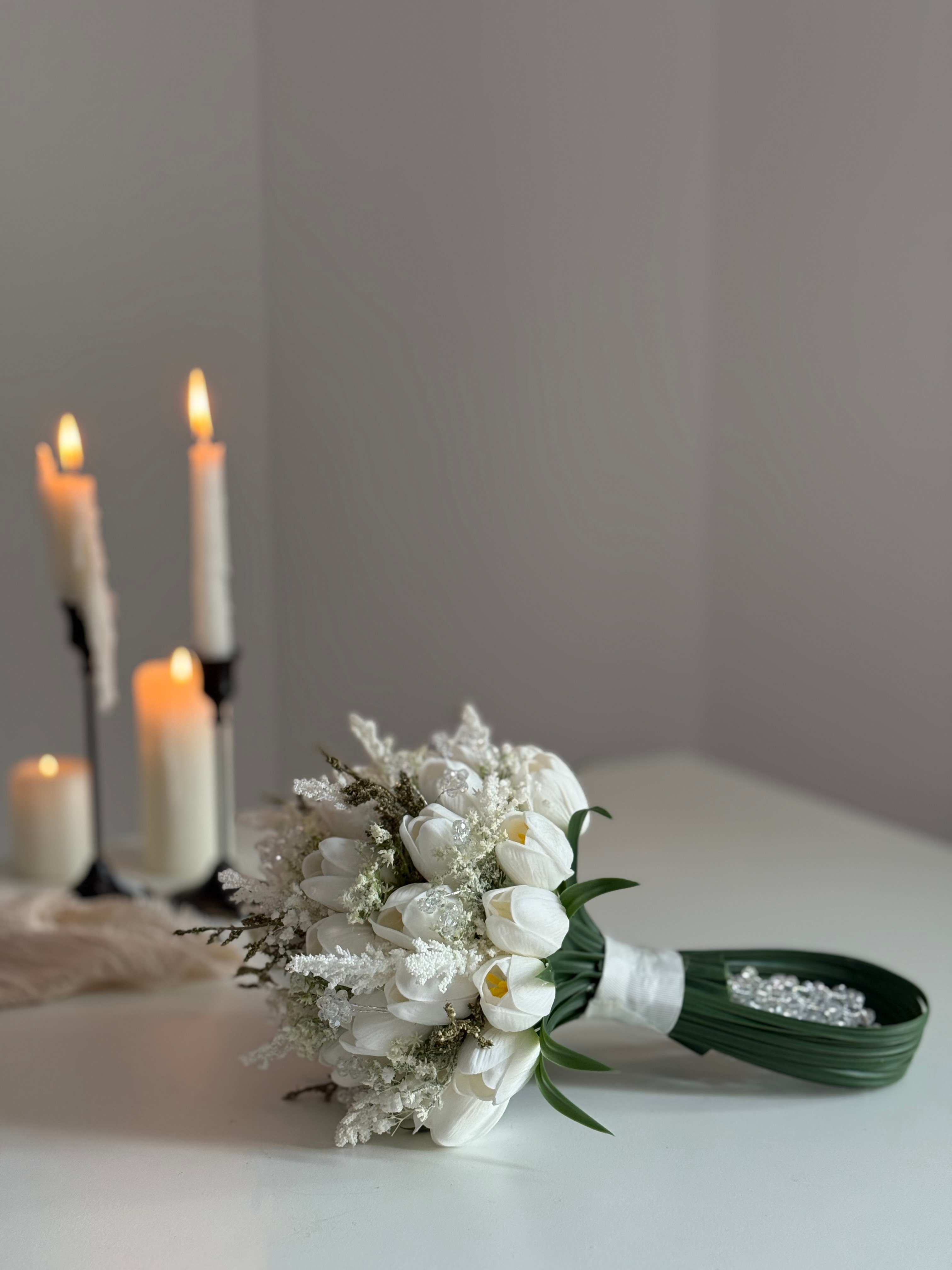 تتكون مسكة عروس ( رضية ) على ورد التوليب و تشكيلة من اغصان اللافندر