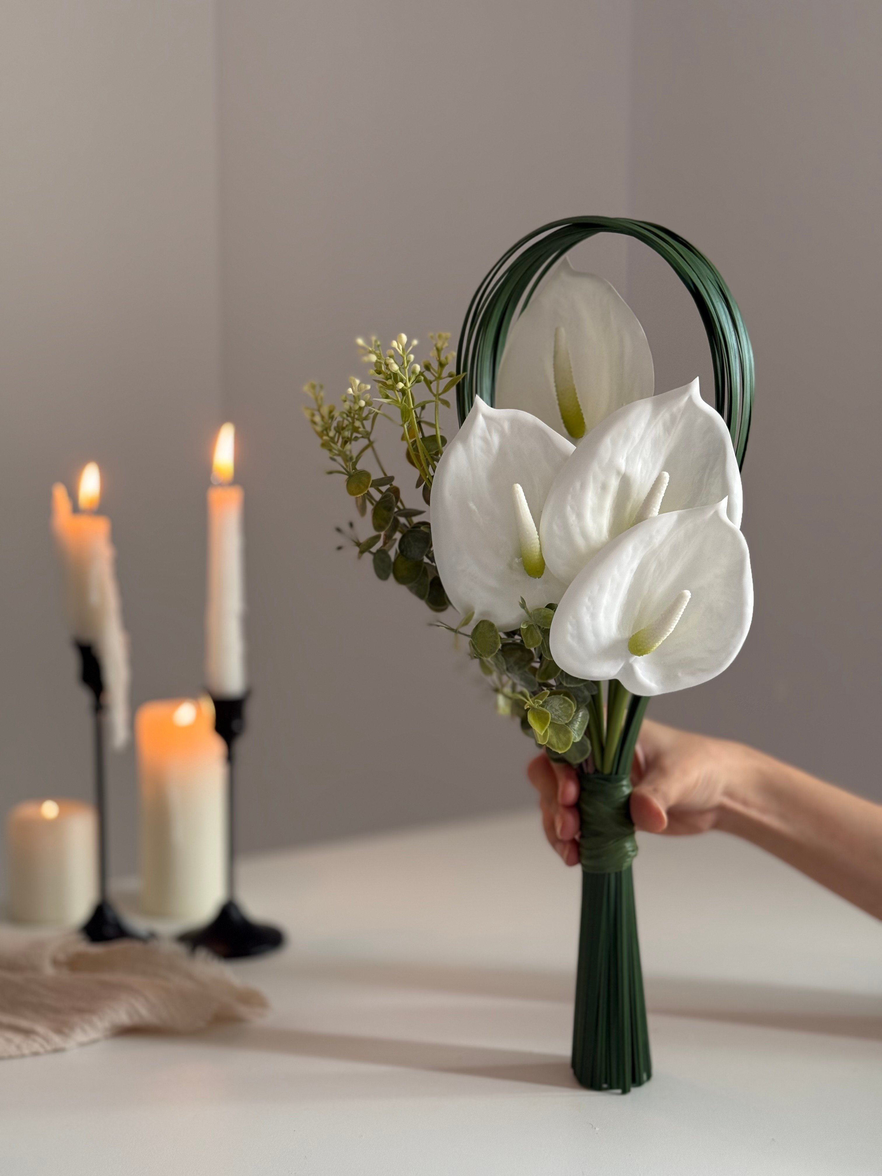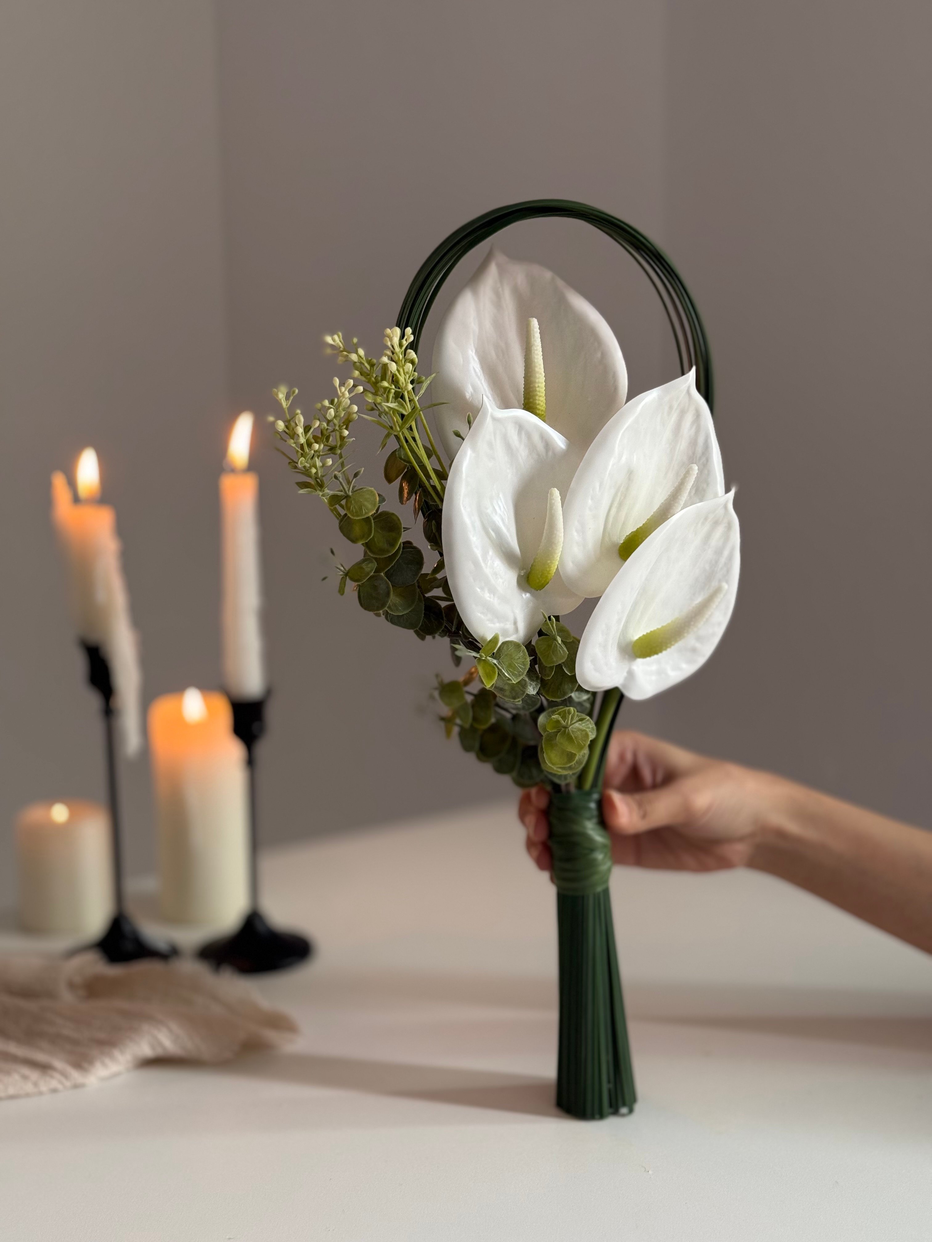 مسكة عروس اساسها ورد الانثوريوم مع توزيعة من الخضاريات و بالتواء ناعم في الاغصان .