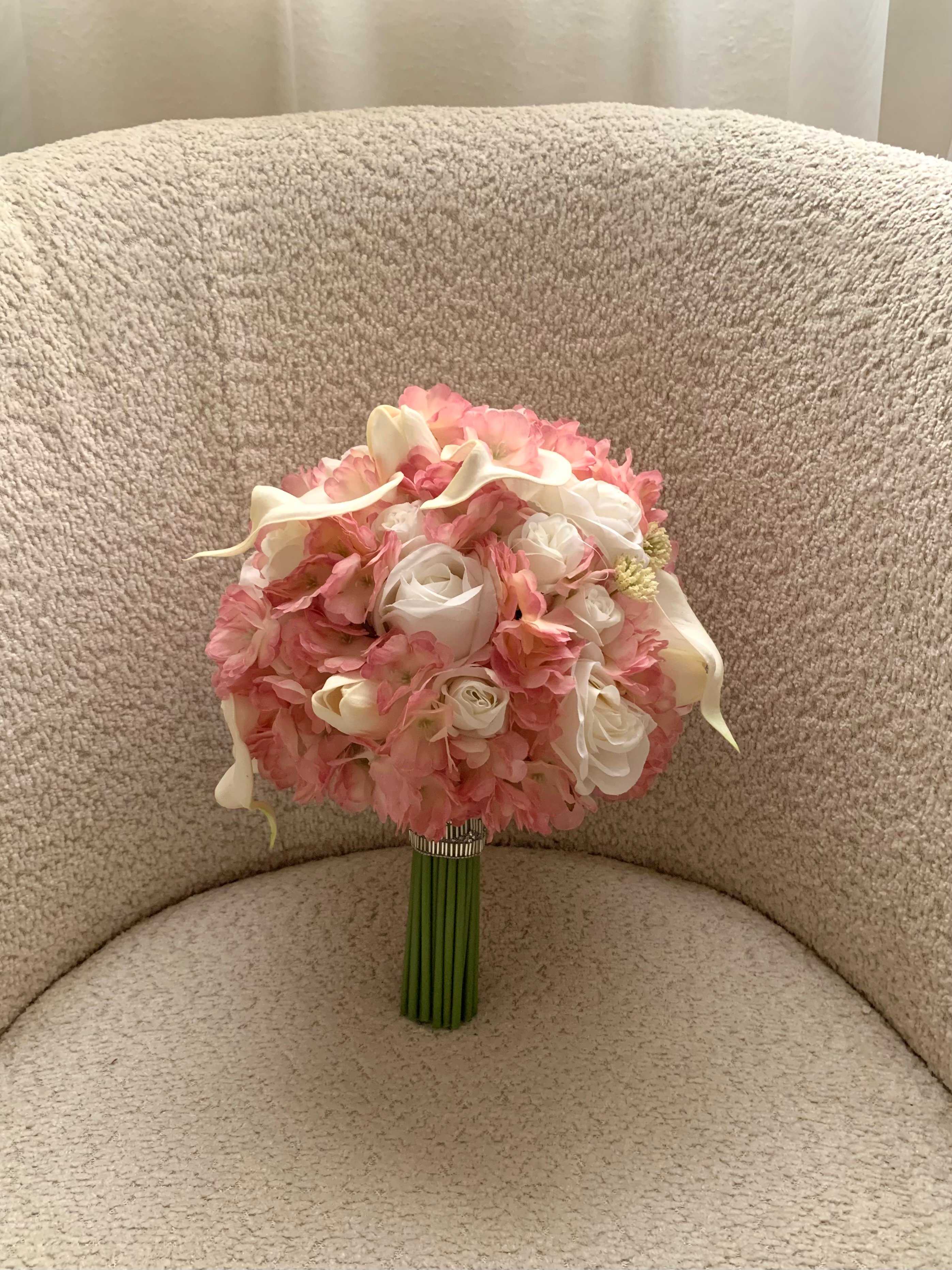 مكونة من ورد الروز و الجوري الابيض مع ازهار التوليب و الكاميليا مطعمه بالأغصان التي زادتها جمالًا و فخامة