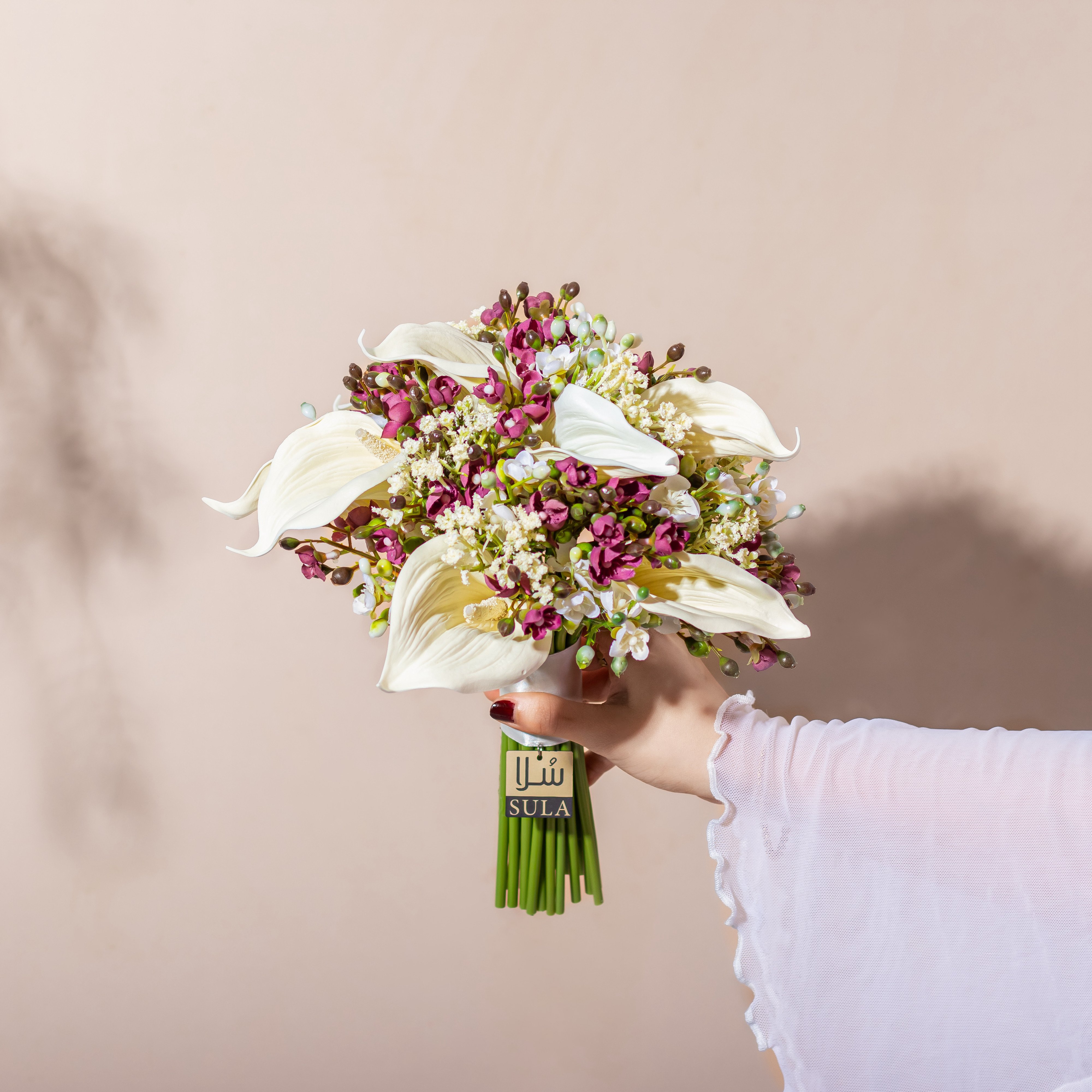 مسكه أنيقه وأنثويه ..متناغمه الالوان مزيج بين زهره الكالا و ورد التوليب مطعمه بالافندر الذي اضاف أناقه وتناسق للمسكه