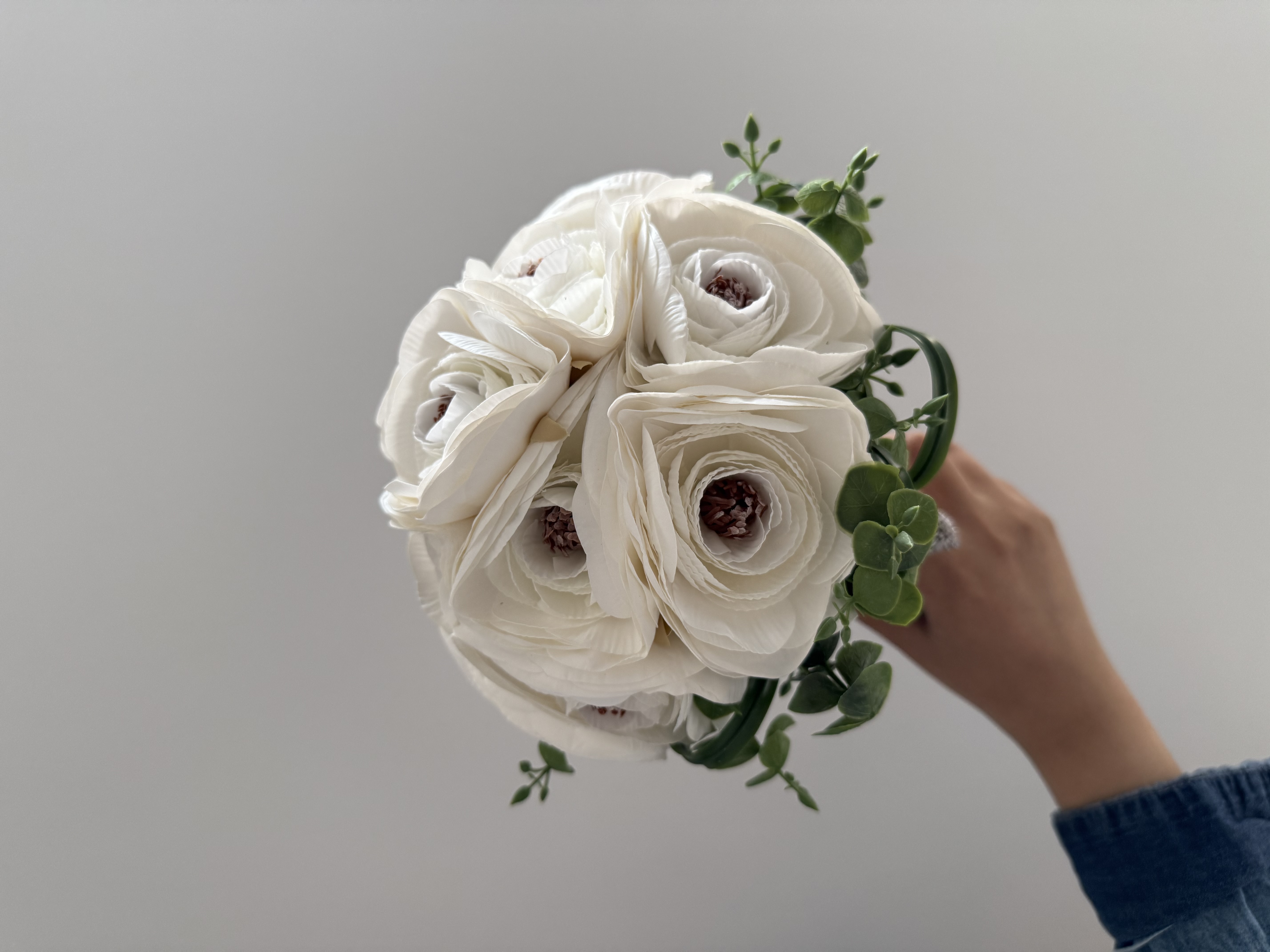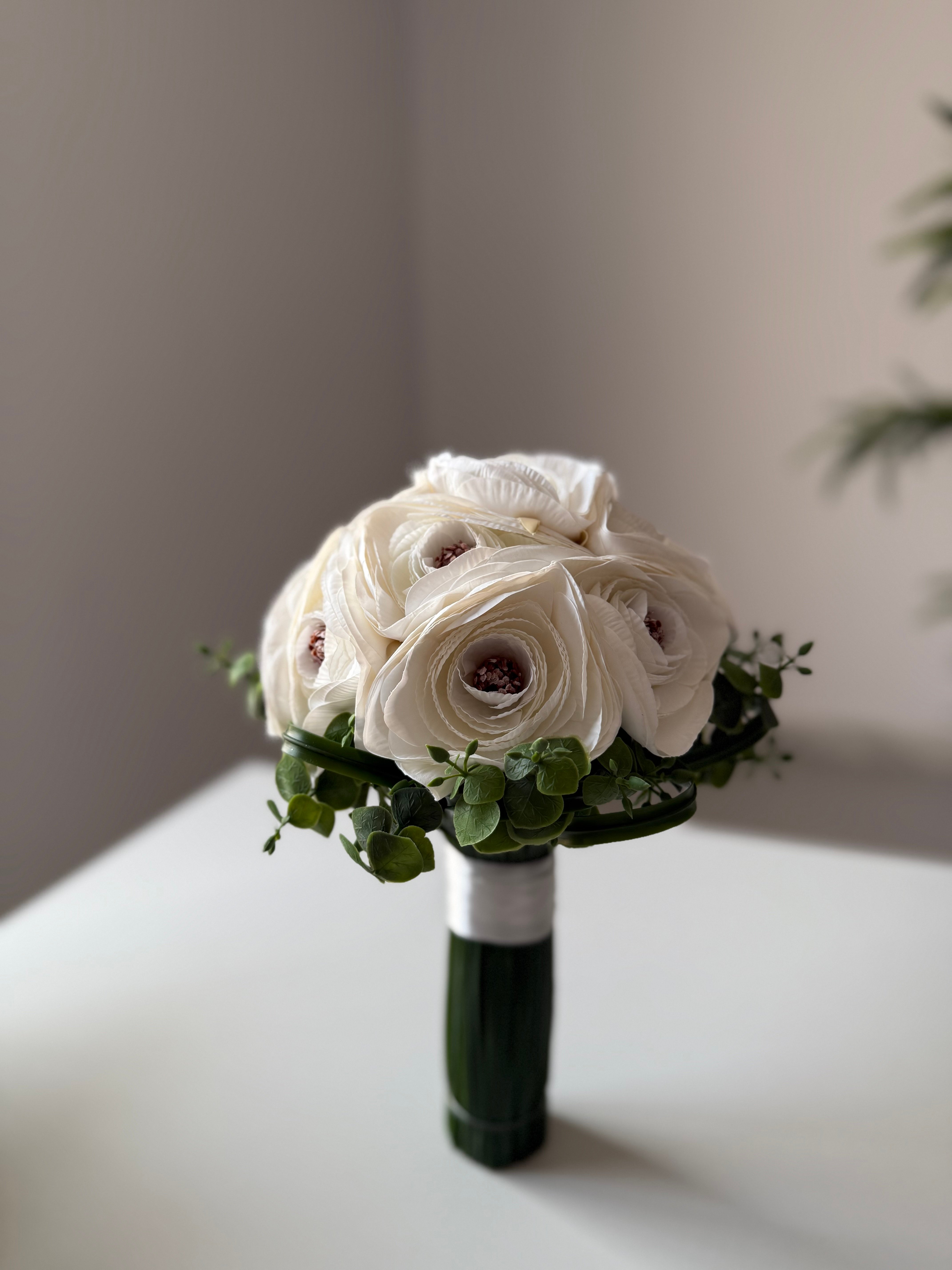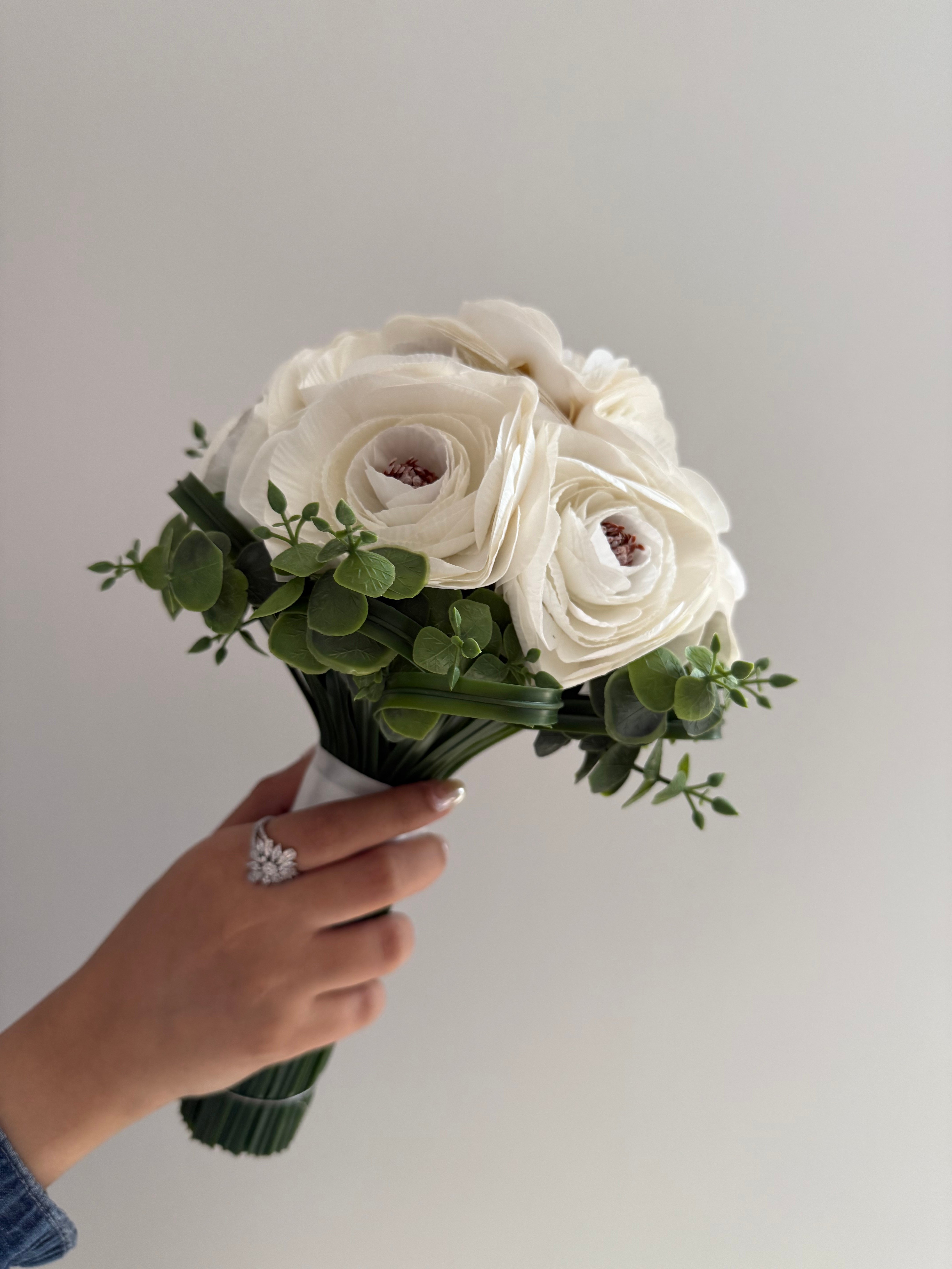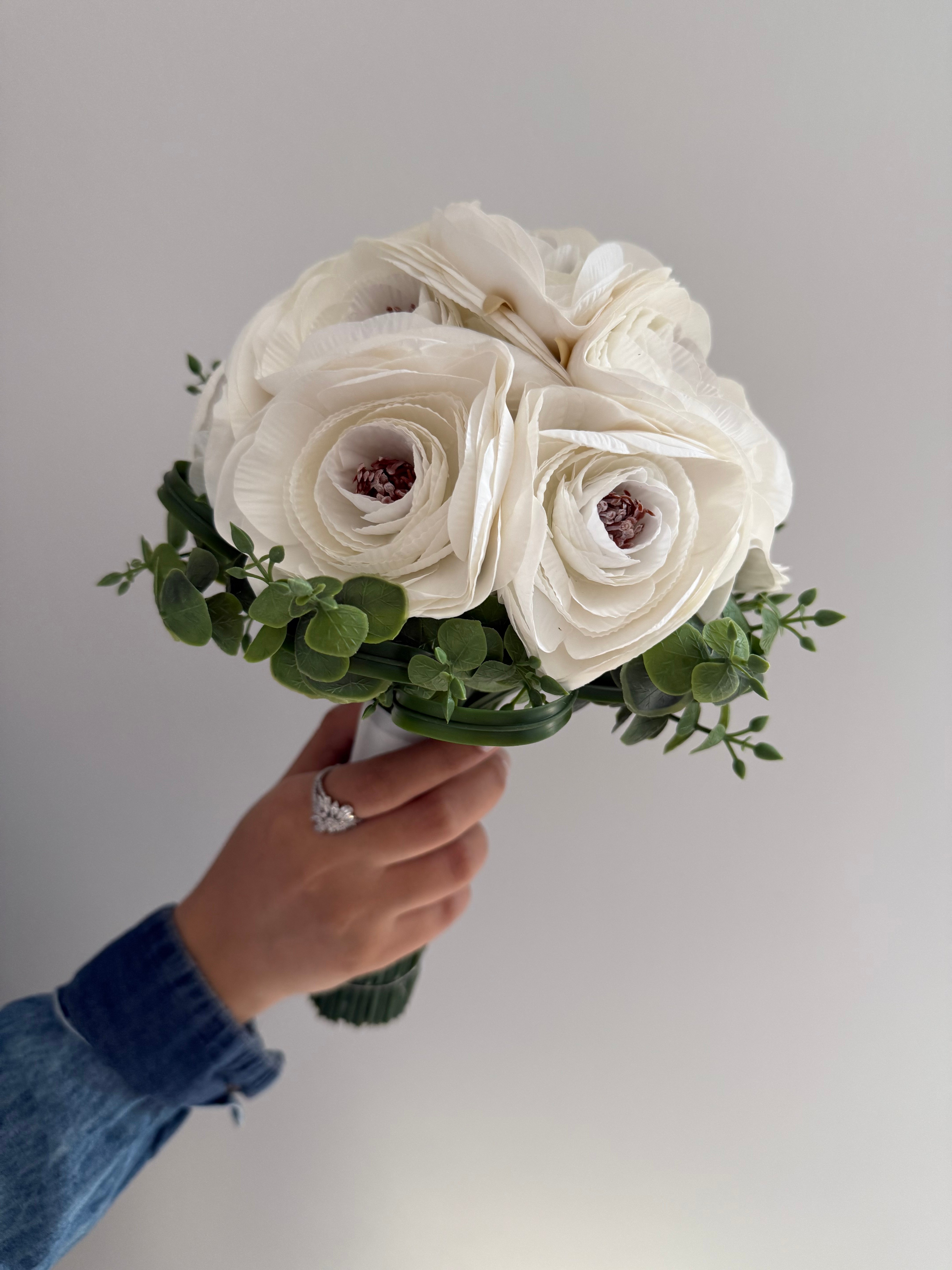 مسكه أنيقه وأنثويه ..متناغمه الالوان مكونه من ورد الرانكلوس محاط بورق الشجر بتنسيق طبيعي ومريح للعين