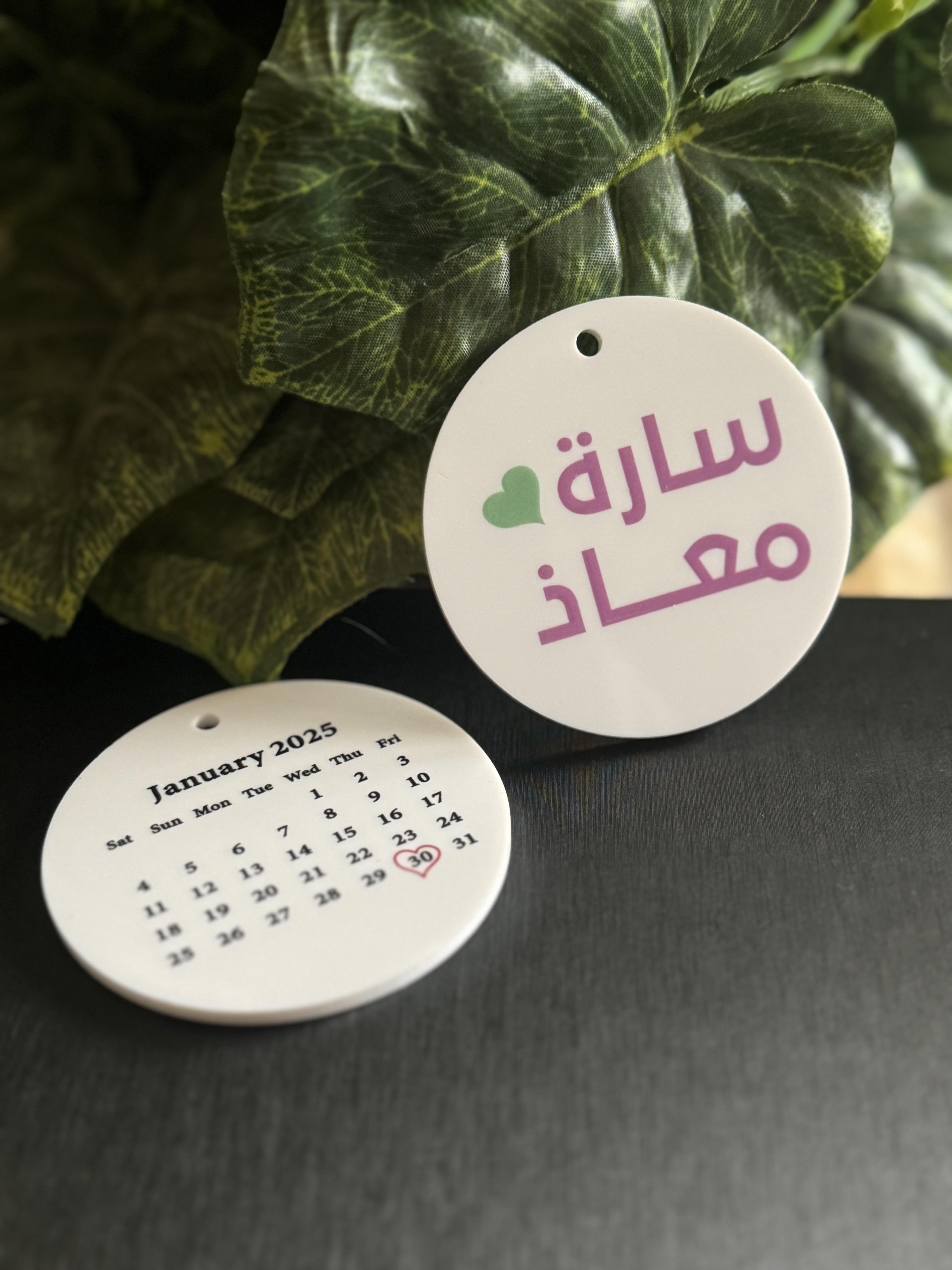 • التاق الدائري يأتيكم بأحد اللونين ( ذهبي او فضي) - التاق هو دائرة تربط بالمسكة تحتوي على اسماء العروسين او الحروف