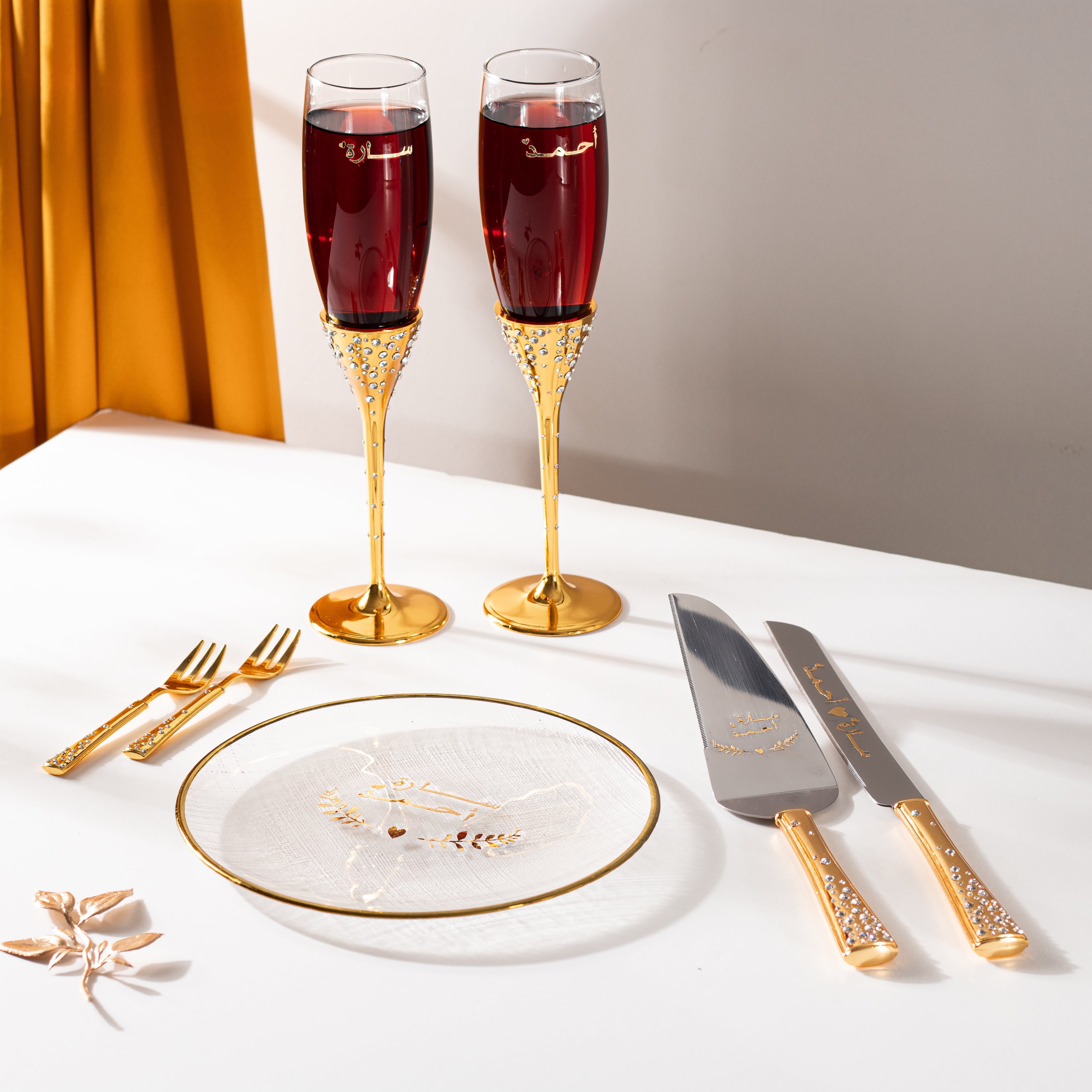 - الكتابة تكون على ( الكاسات - الصحن - السكين - حامل الكيك )