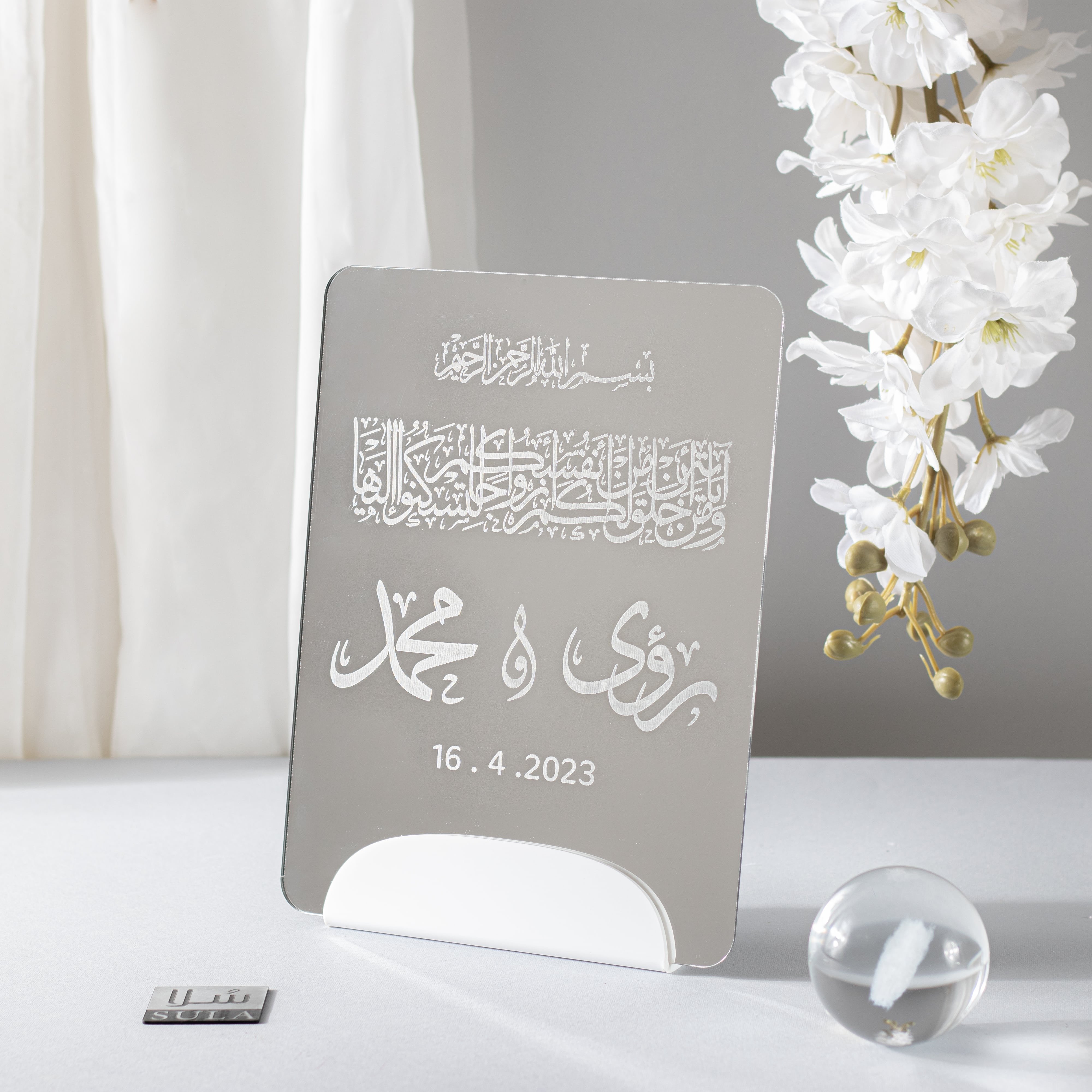 لوحة بقاعدة بيضاء ناعمة و عليها لوحة منحوت عليها اسماء العرسان