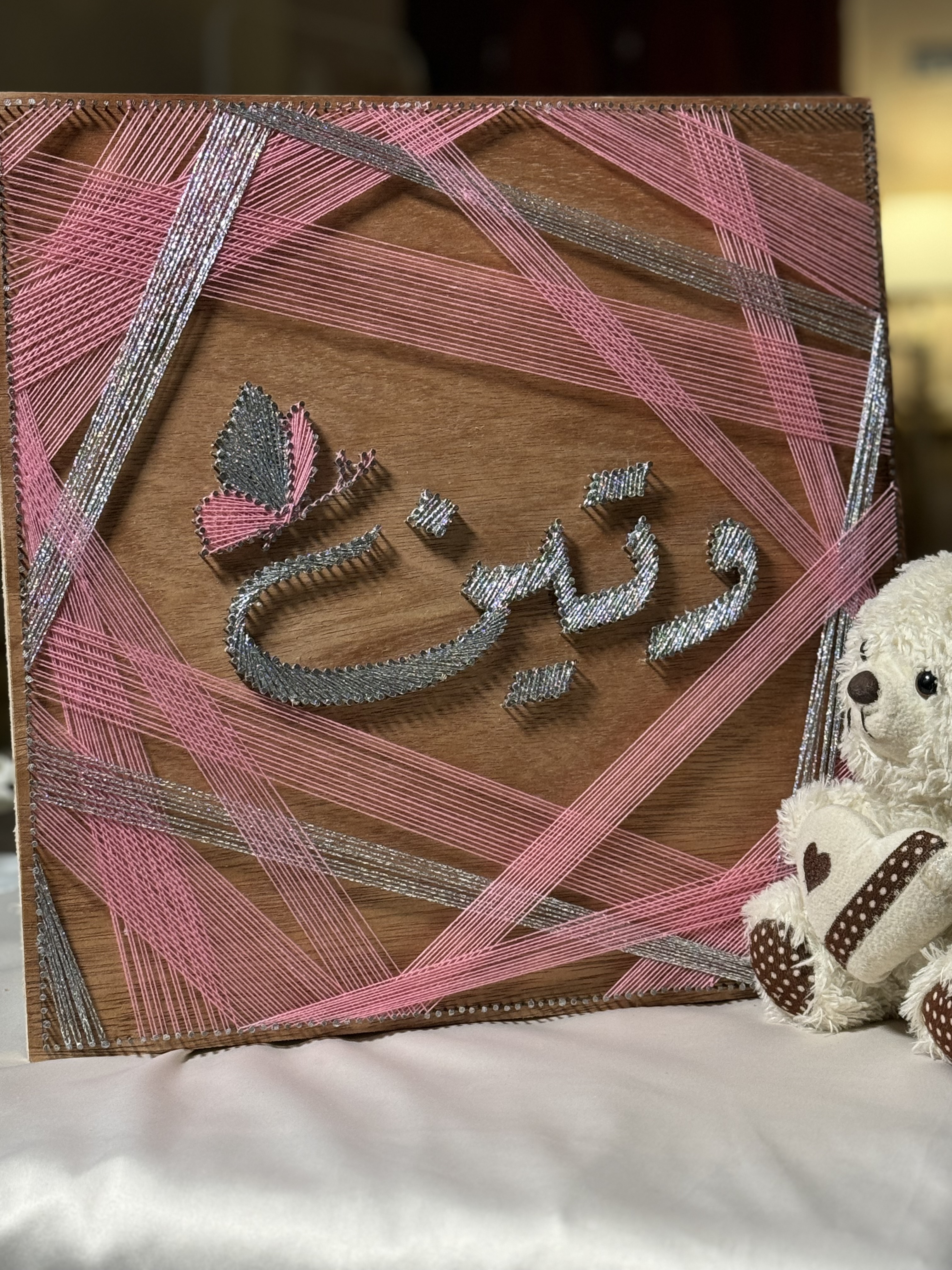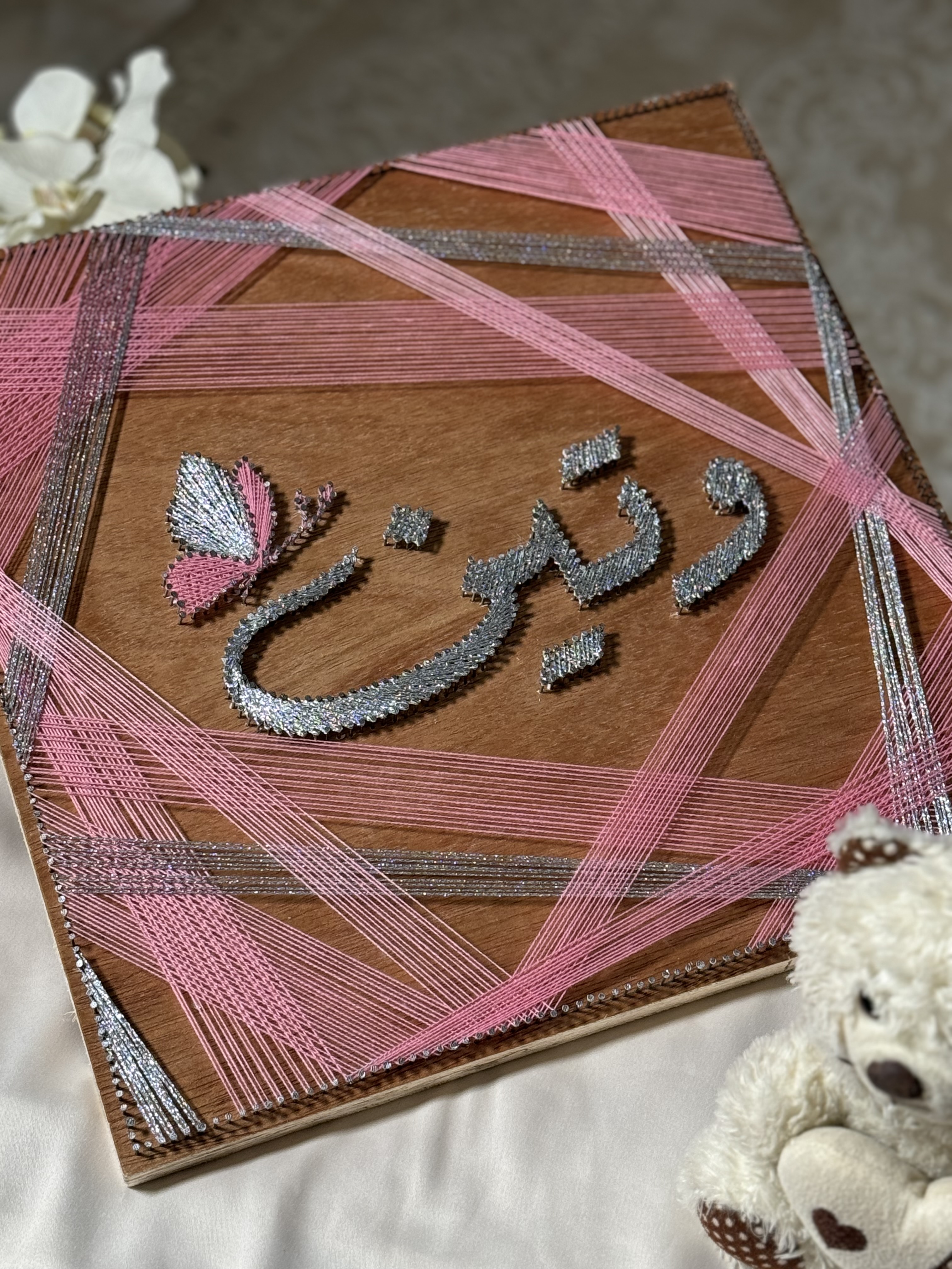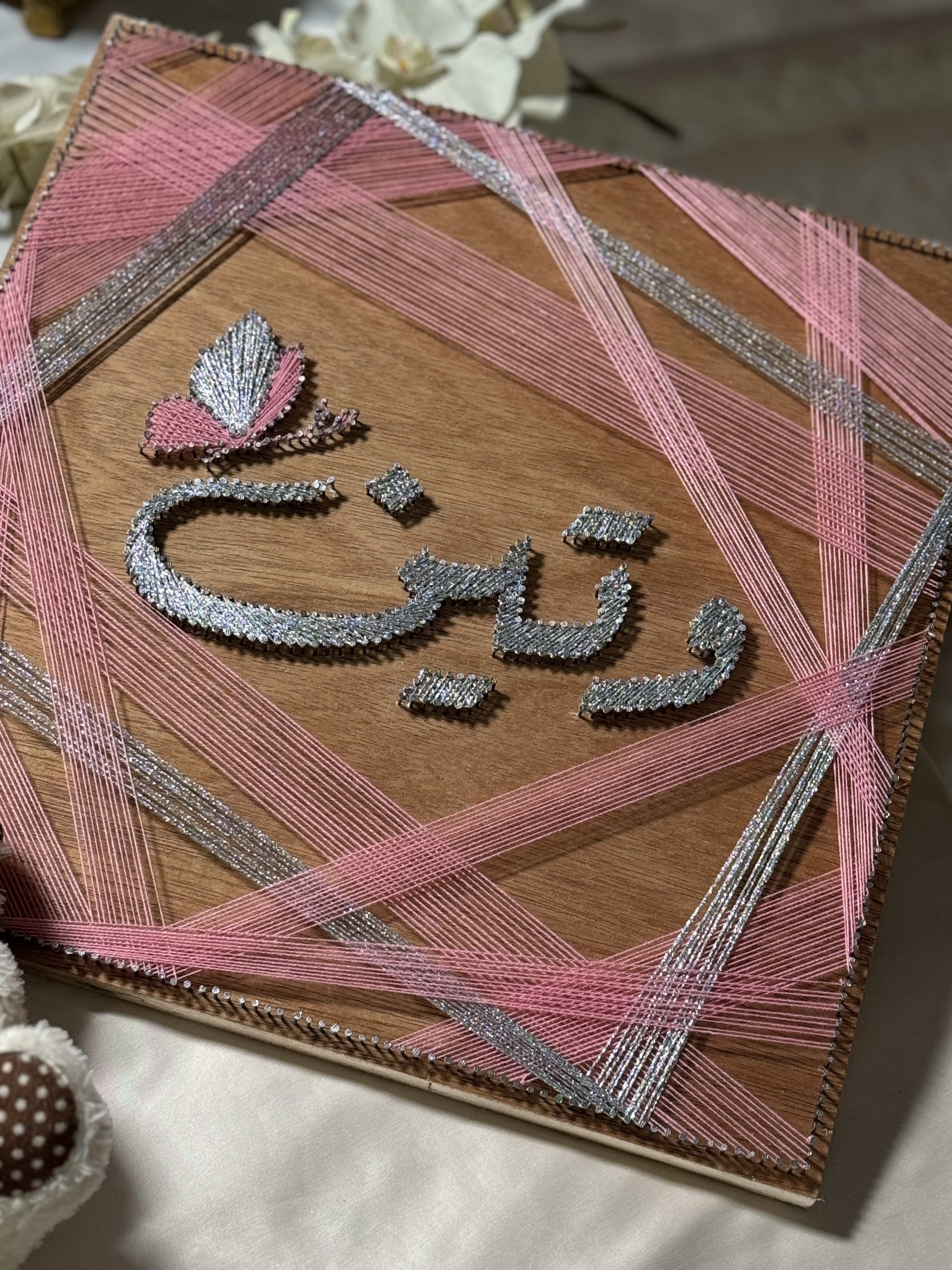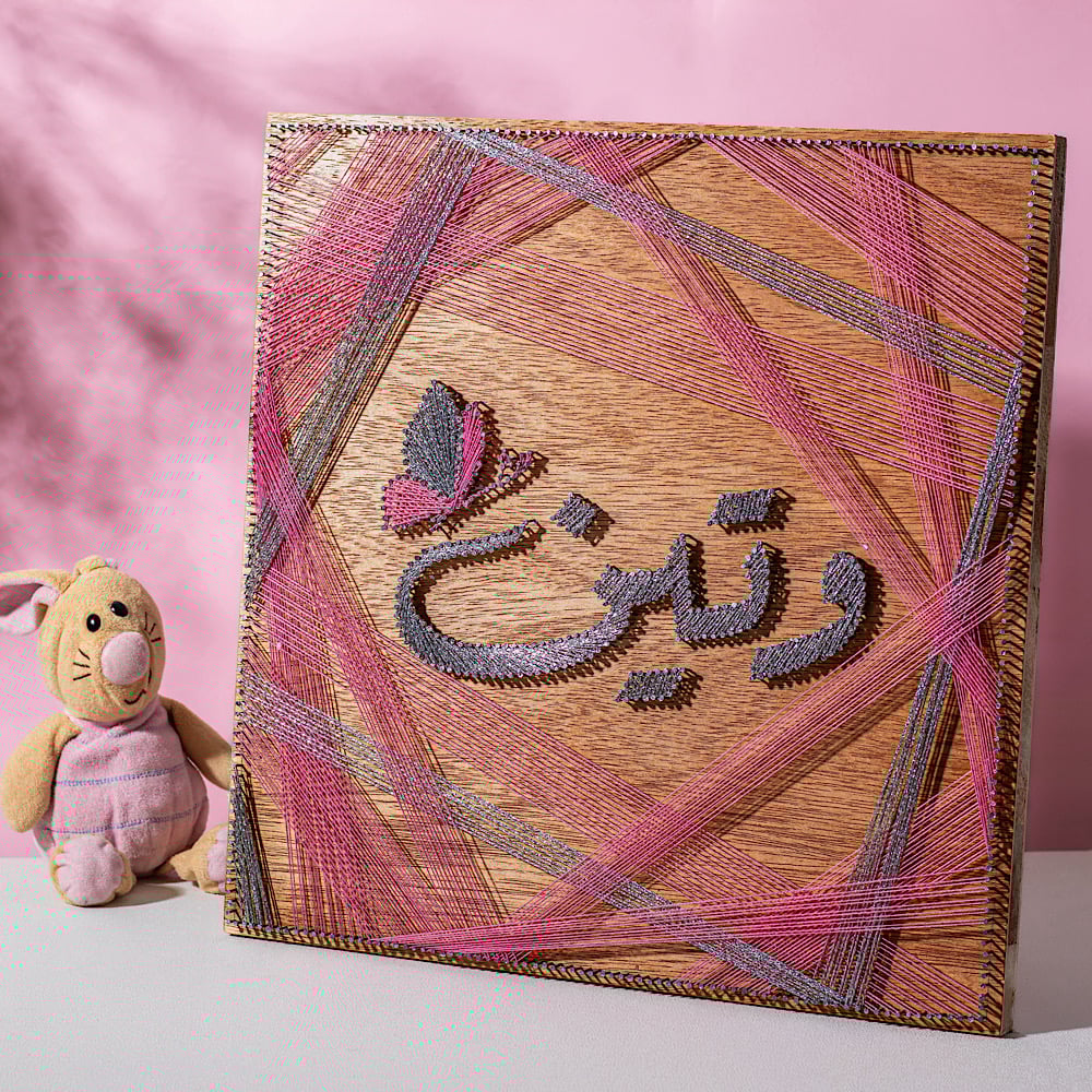 الاسم في المنتصف مع خيوط متماهية من الجوانب لتخرج لوحة تليق بكم .