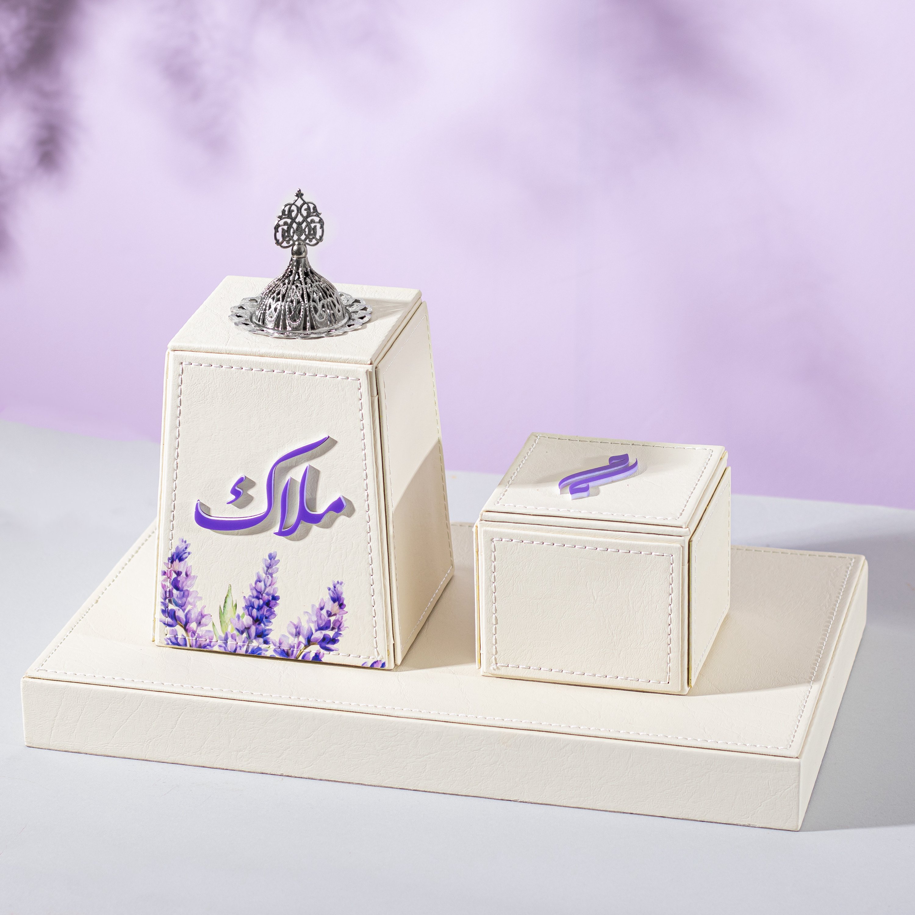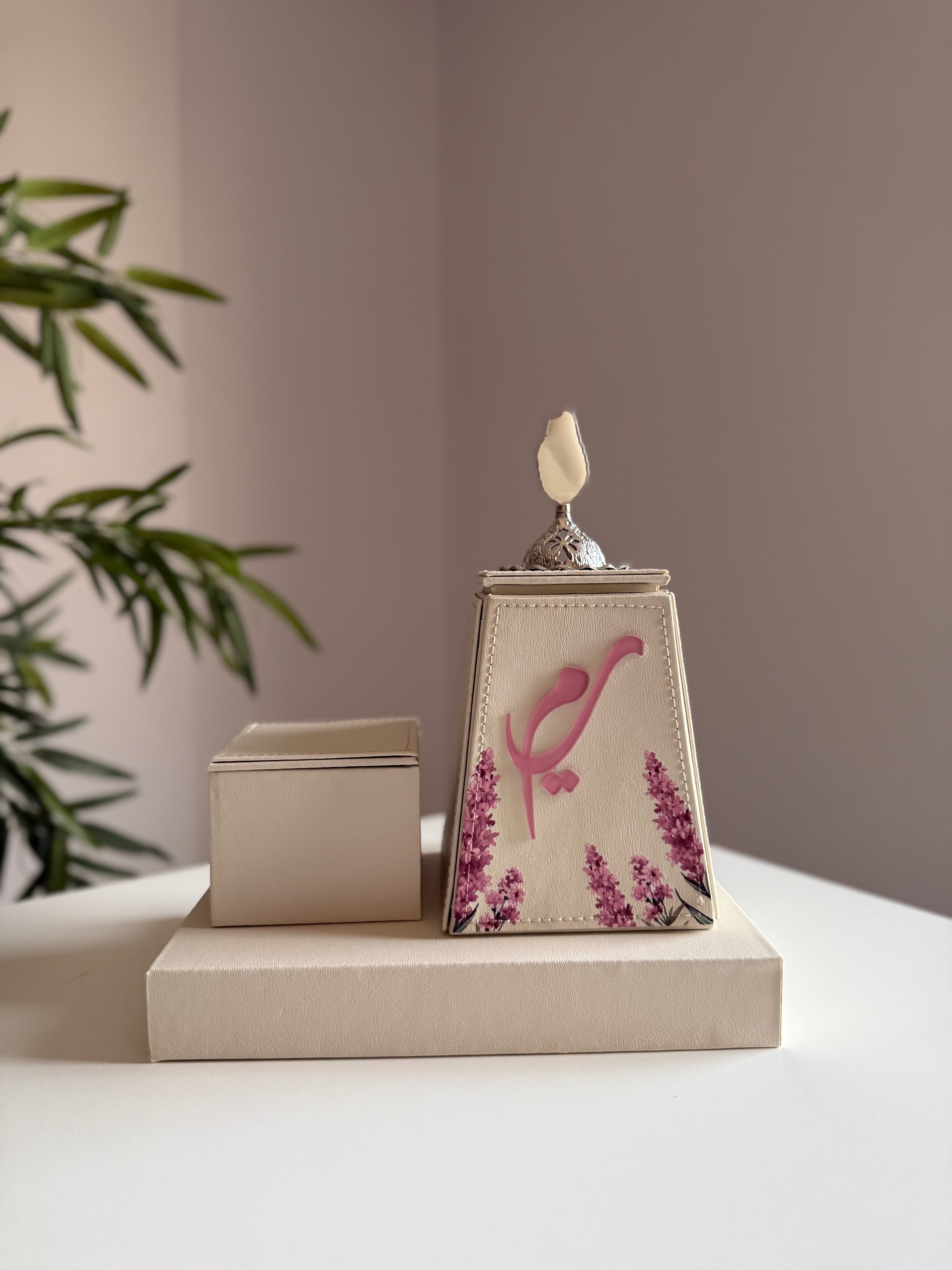 طقم مبخرة متكامل يجمع بين النعومه و الرقه ، تضفي طبعة زهرة اللافندر نوعًا اخرًا من الجمال ، مصنوعة من الجلد الفاخر