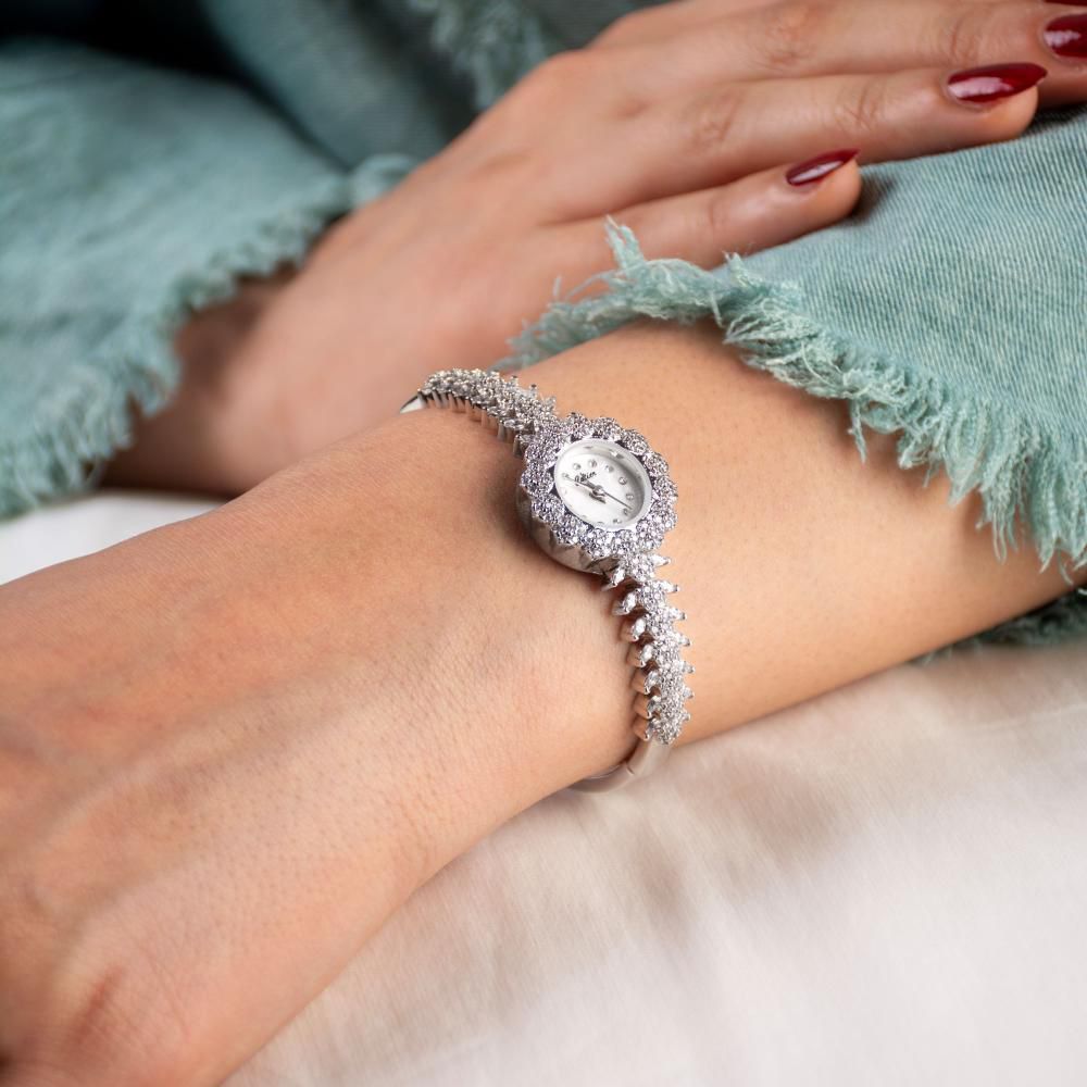 وتحتوي على أحجار زركون لامعة تزيّن إطارها و سيرها ، مما يضيف لمسة من التألق.